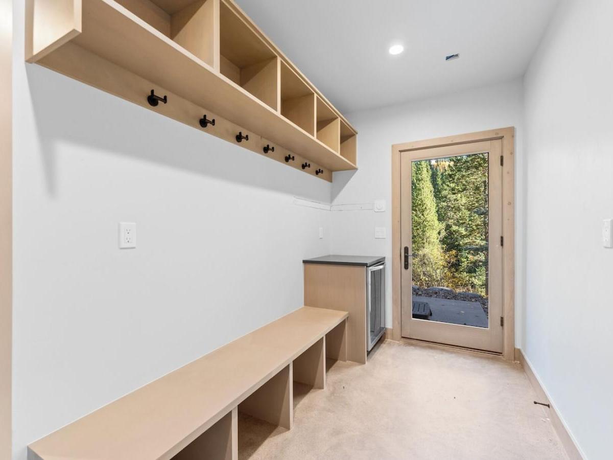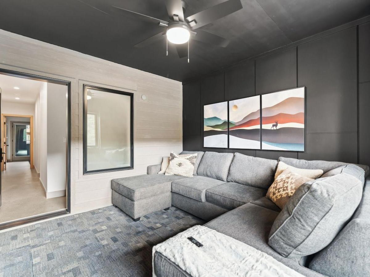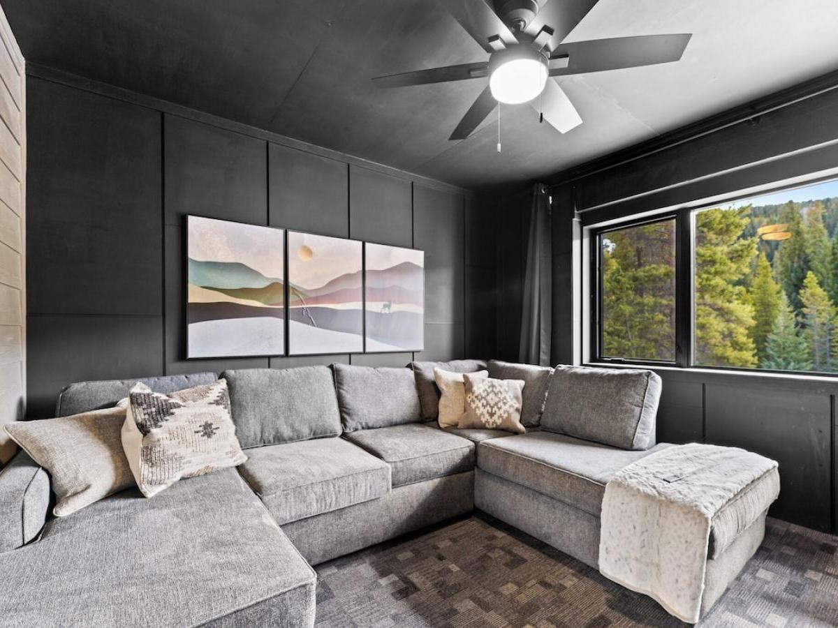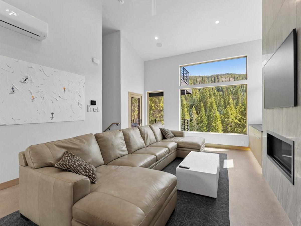 Located on the ground level, the gear room—equipped with plenty of storage space and a mini-fridge—provides easy access from the private 2-car garage and includes a door leading directly to the private hot tub, ideal for relaxing under the stars after a day of skiing or hiking. A cozy family room is appointed with a sectional sofa in front of a wall-mounted television.