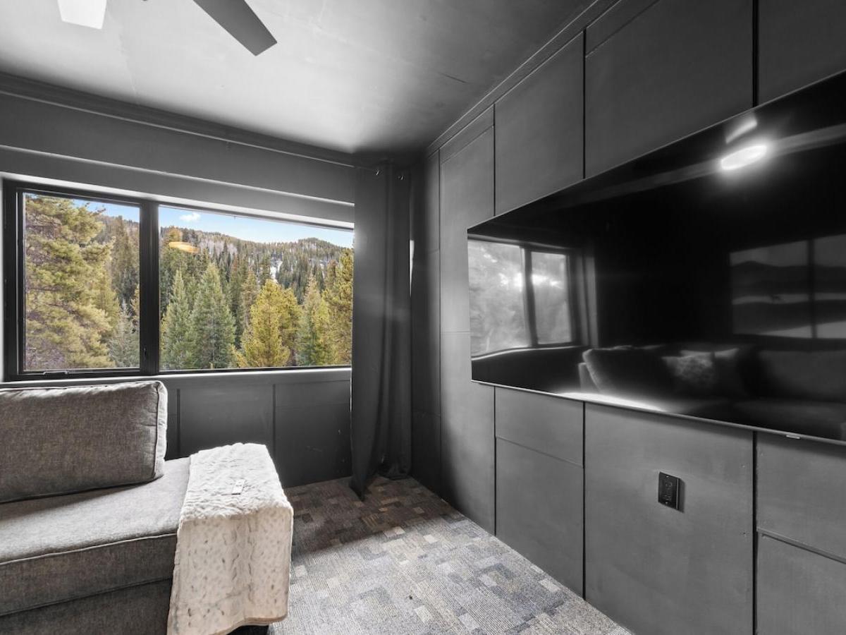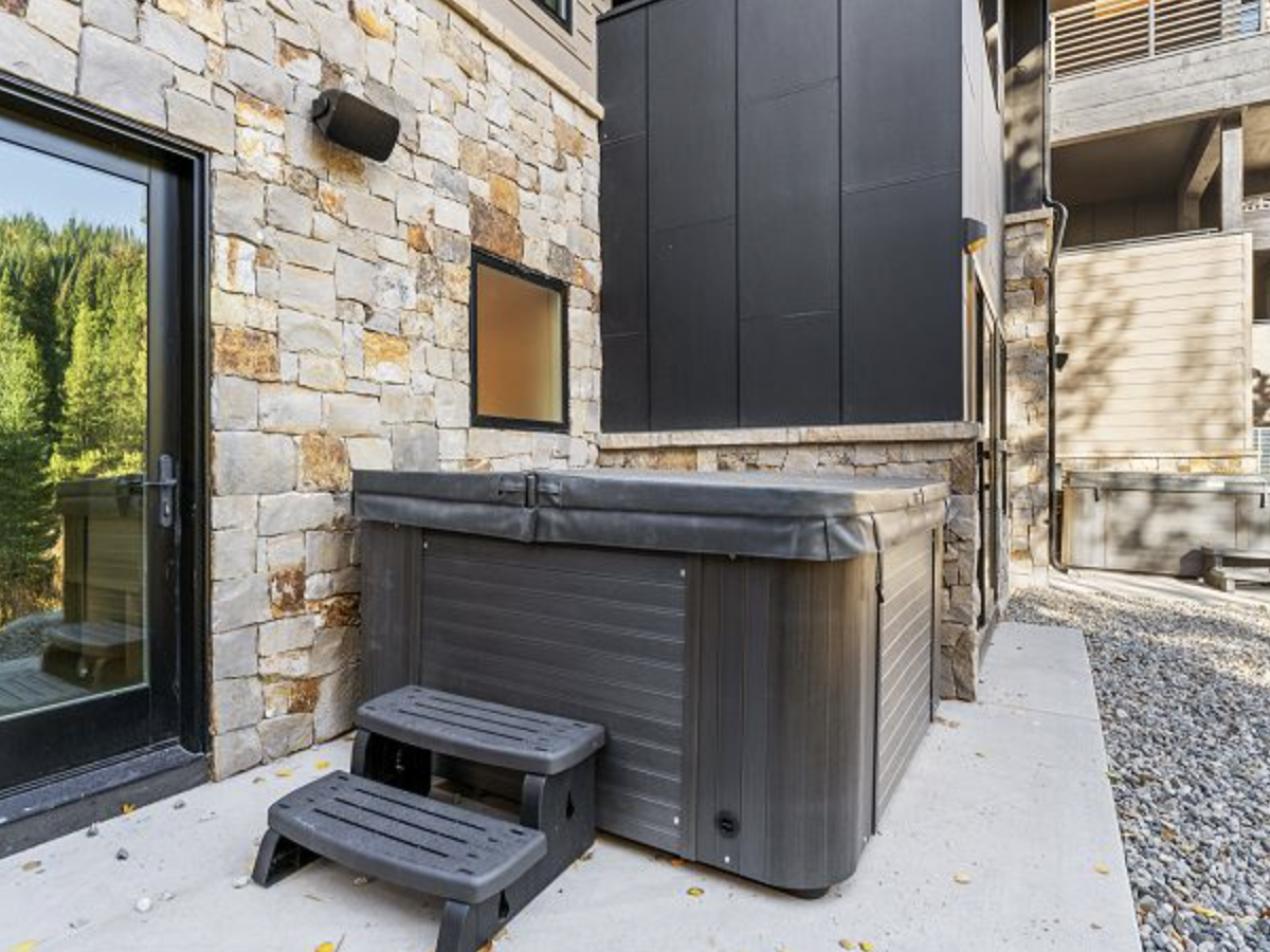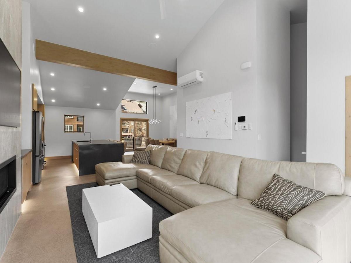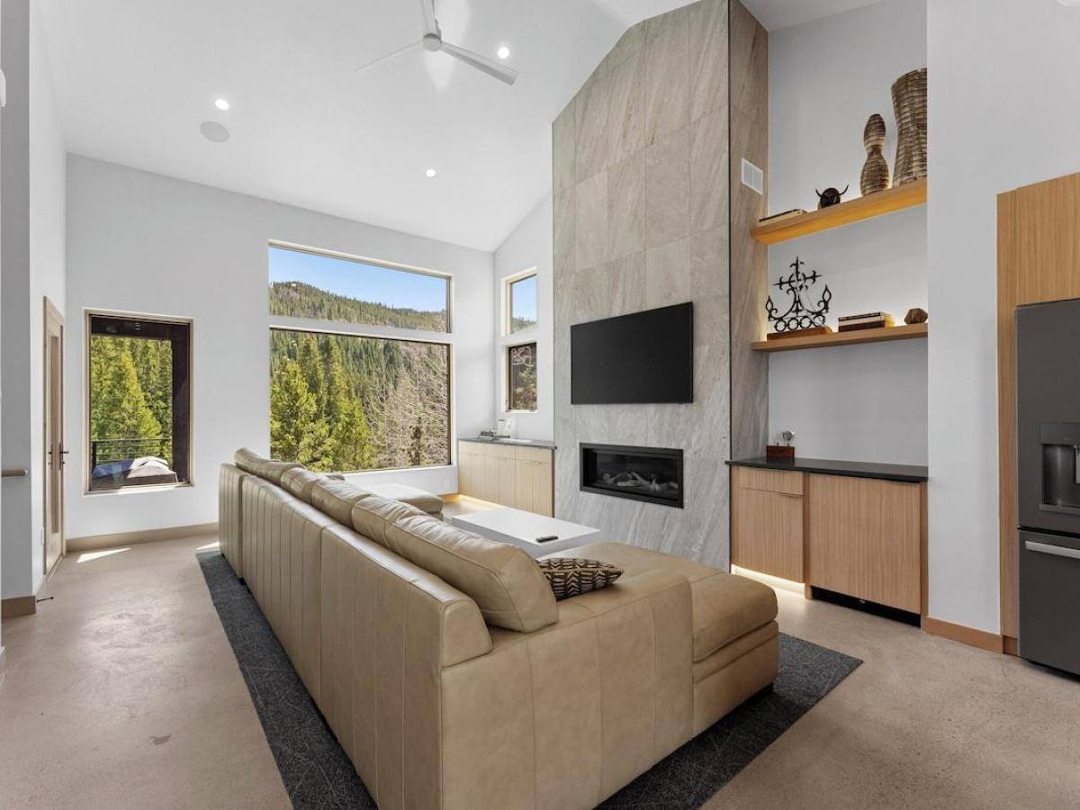 Located on the ground level, the gear room—equipped with plenty of storage space and a mini-fridge—provides easy access from the private 2-car garage and includes a door leading directly to the private hot tub, ideal for relaxing under the stars after a day of skiing or hiking. A cozy family room is appointed with a sectional sofa in front of a wall-mounted television.