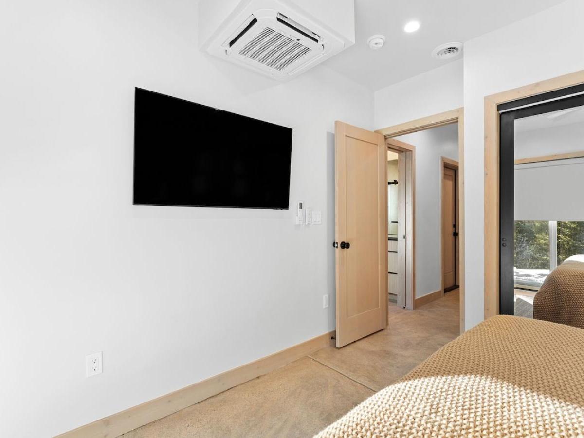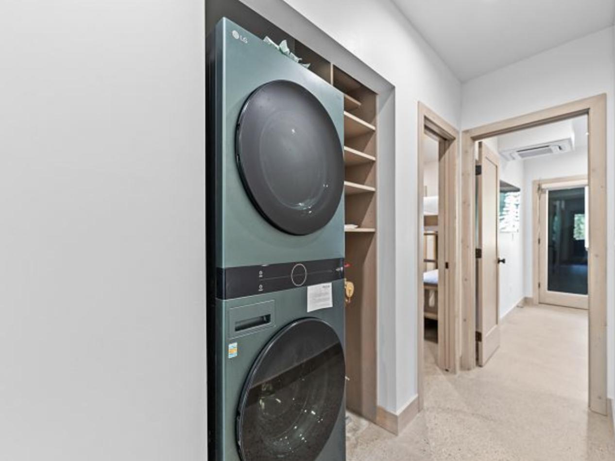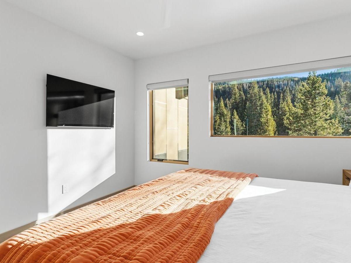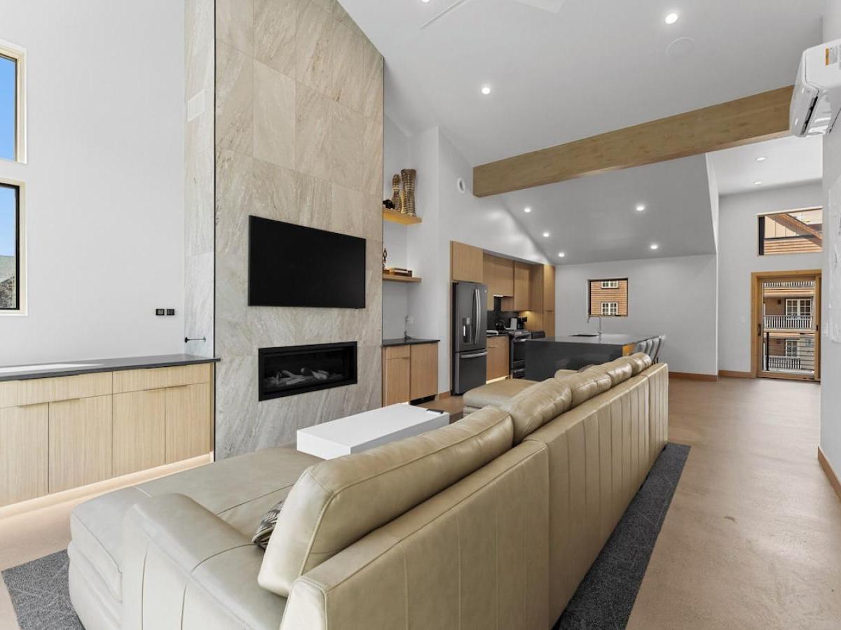 Located on the ground level, the gear room—equipped with plenty of storage space and a mini-fridge—provides easy access from the private 2-car garage and includes a door leading directly to the private hot tub, ideal for relaxing under the stars after a day of skiing or hiking. A cozy family room is appointed with a sectional sofa in front of a wall-mounted television.