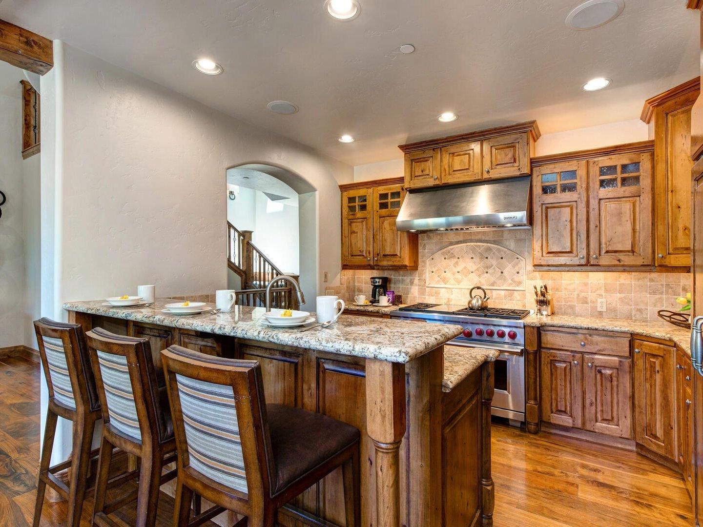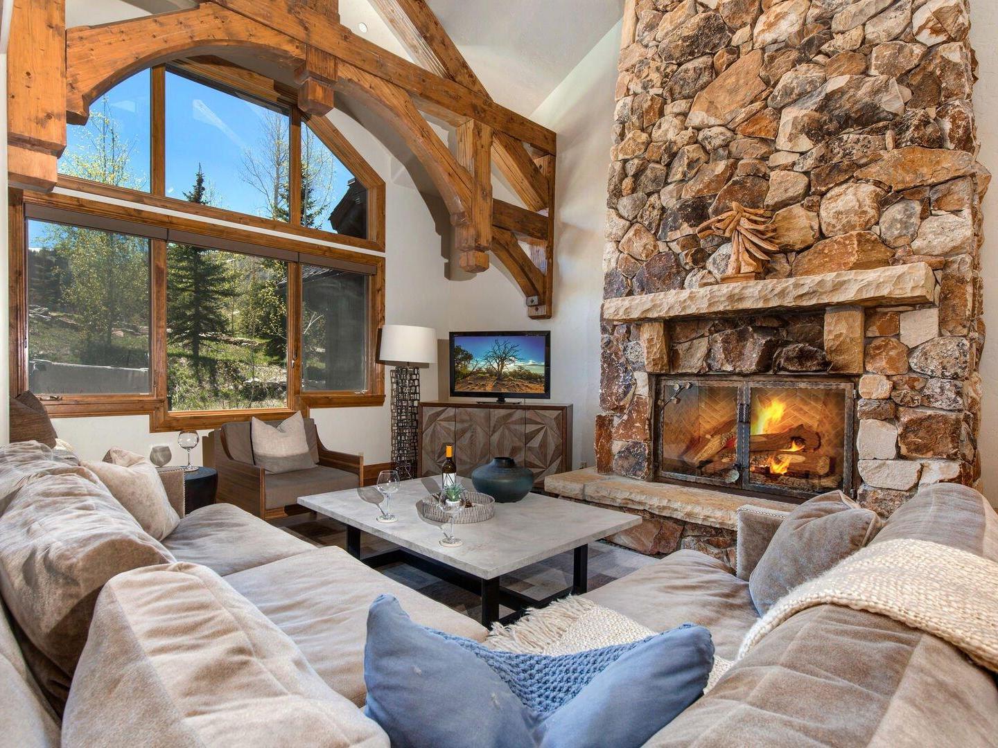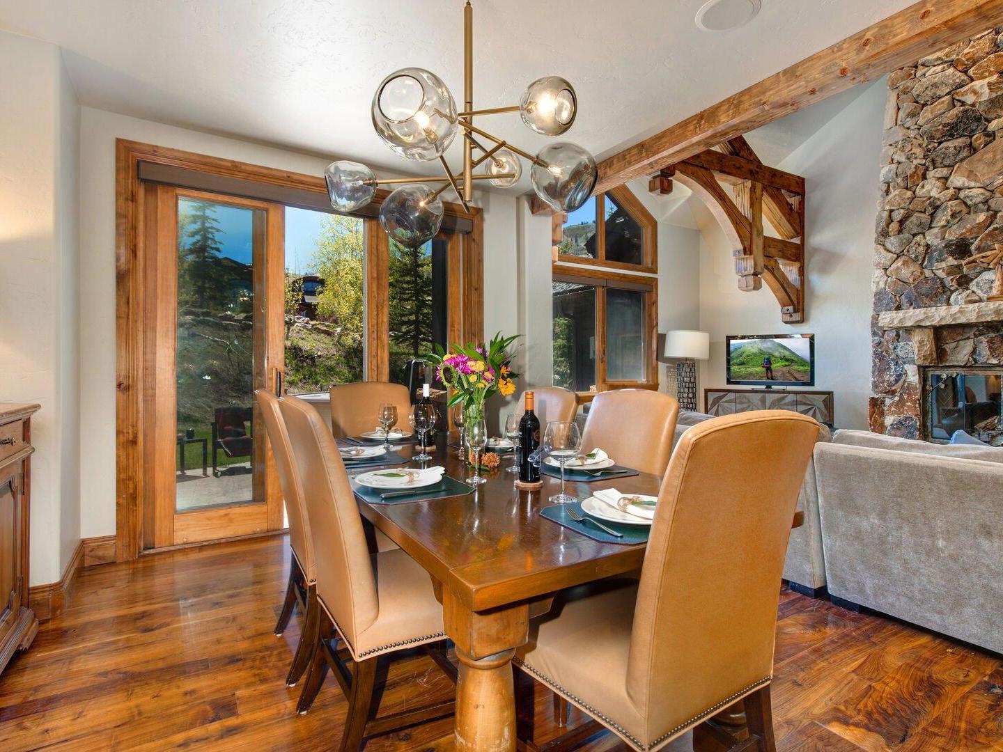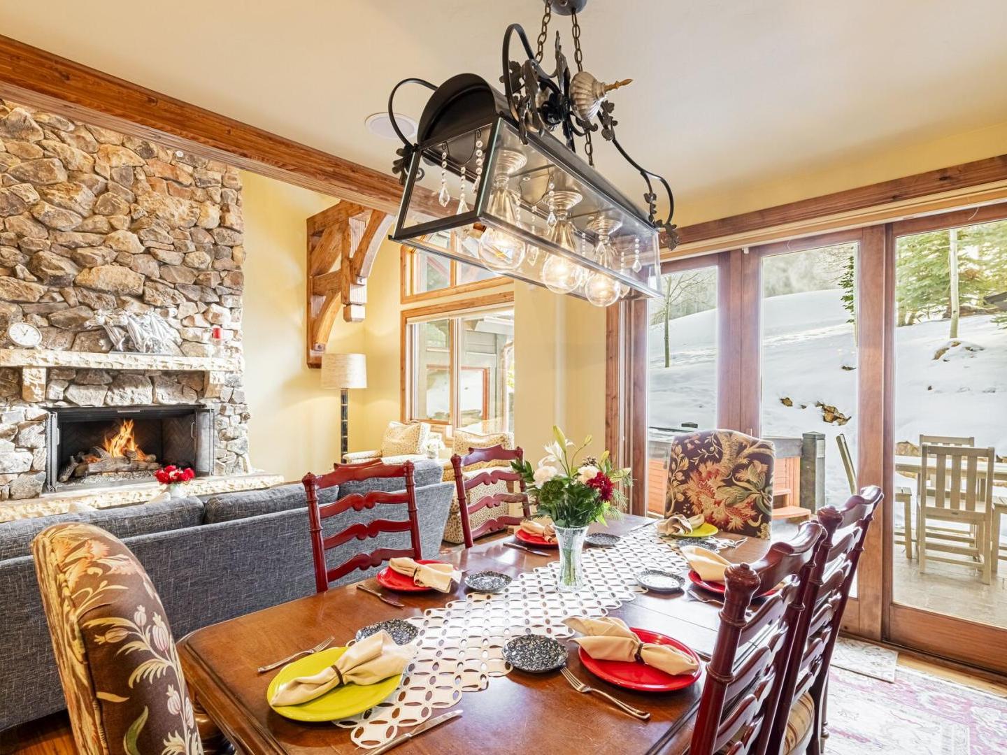 Spacious and open layouts provide an inviting are for multiple families nad large groups of friends to entertain. Designer furnishings surround a magnificent stone fireplace in the main living area which opens to the dining area and kitchen. Featuring upscale appliances, custom cabinetry, and granite countertops, the gourmet kitchen is designed to please the most discerning of chefs. A multi-level floorplan with bedrooms distributed throughout the residence allows for added privacy. Multiple living spaces make it convenient for the group to spread out an relax in the over 2,900 square feet of space that the Ironwood Townhomes encompass. Relaxing in the outdoor private hot tub while enjoying the spectacular sunset is certain to be a popular activity after guests ski back to their luxury vacation home on the slopes of Deer Valley.