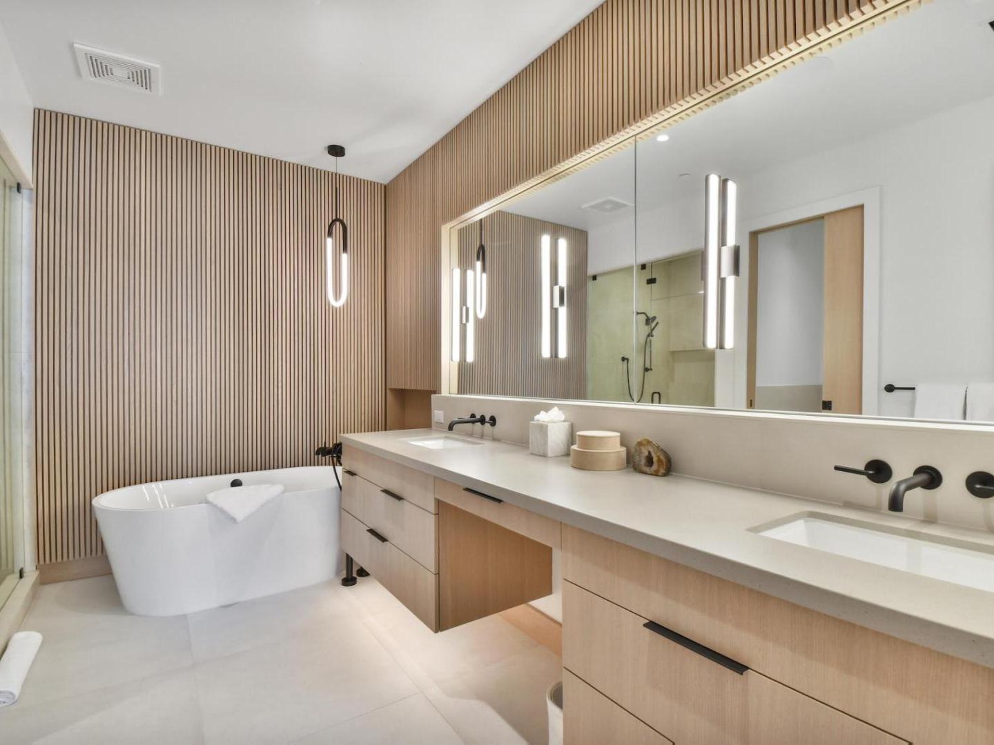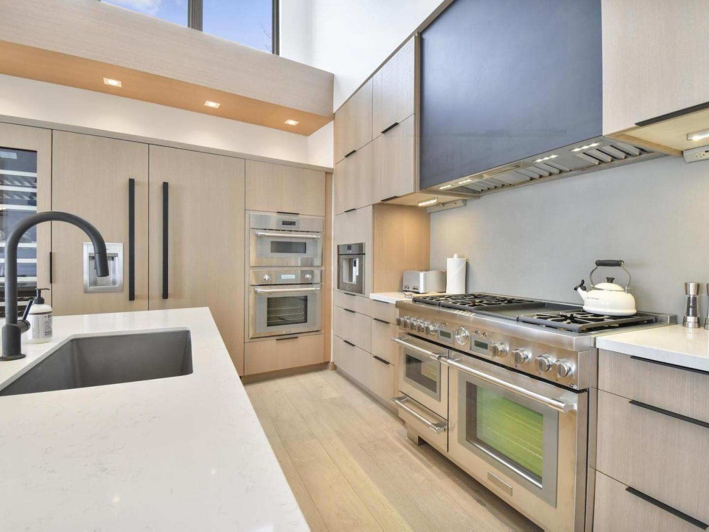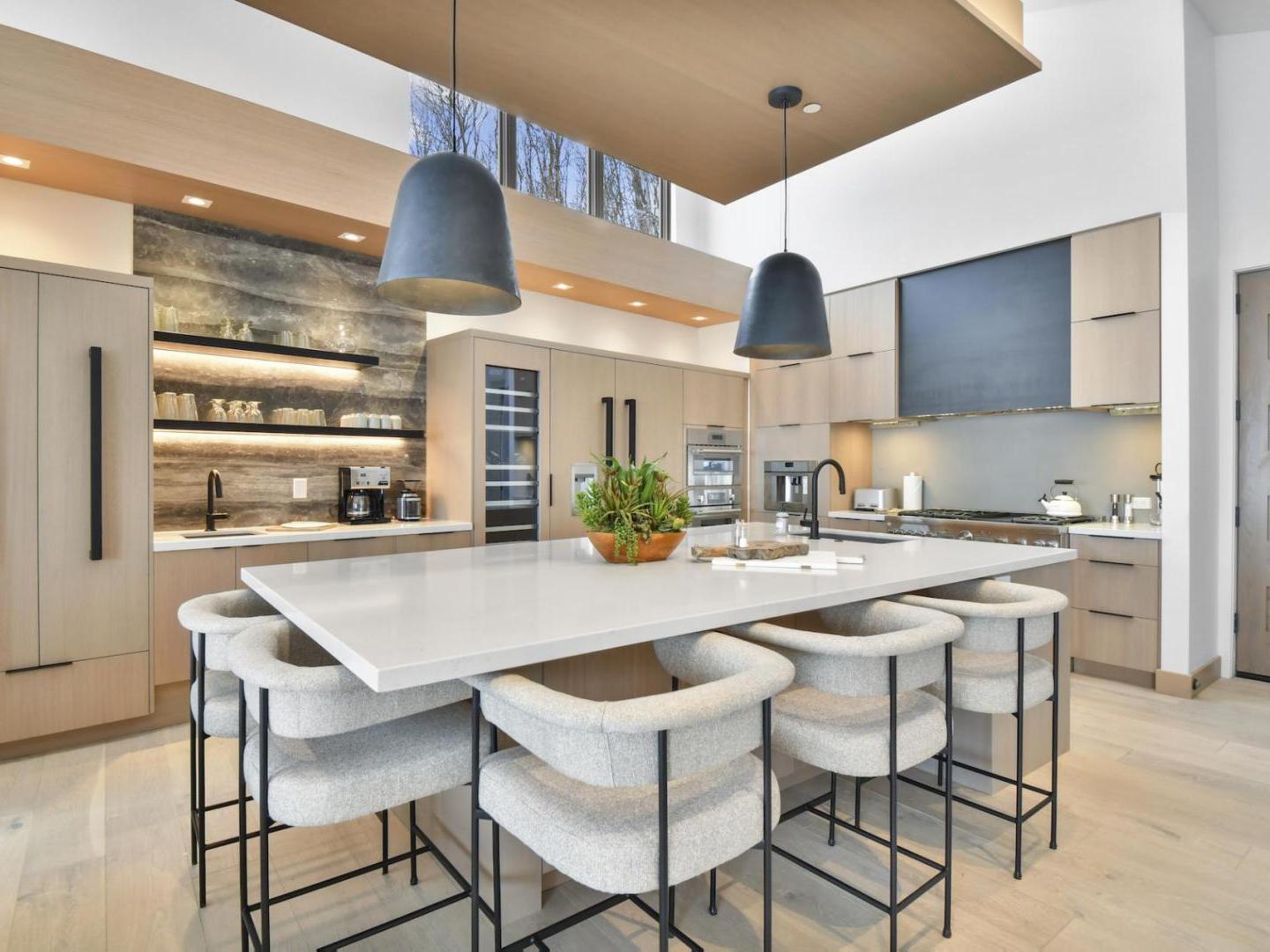 With contemporary design and plush furnishings, the living room of this 5-bedroom, 5.5-bathroom residence is centered around a gas fireplace and a wall-mounted TV, making it the perfect space for your group of up to 10 guests to gather and entertain. The gourmet kitchen, featuring sleek quartz countertops, a spacious center island with seating for 5, and high-end appliances including double ovens and a gas range, is fully equipped for preparing delicious meals throughout your stay. Set off of the kitchen, the dining area provides bench and chair seating for up to 8 guests.
