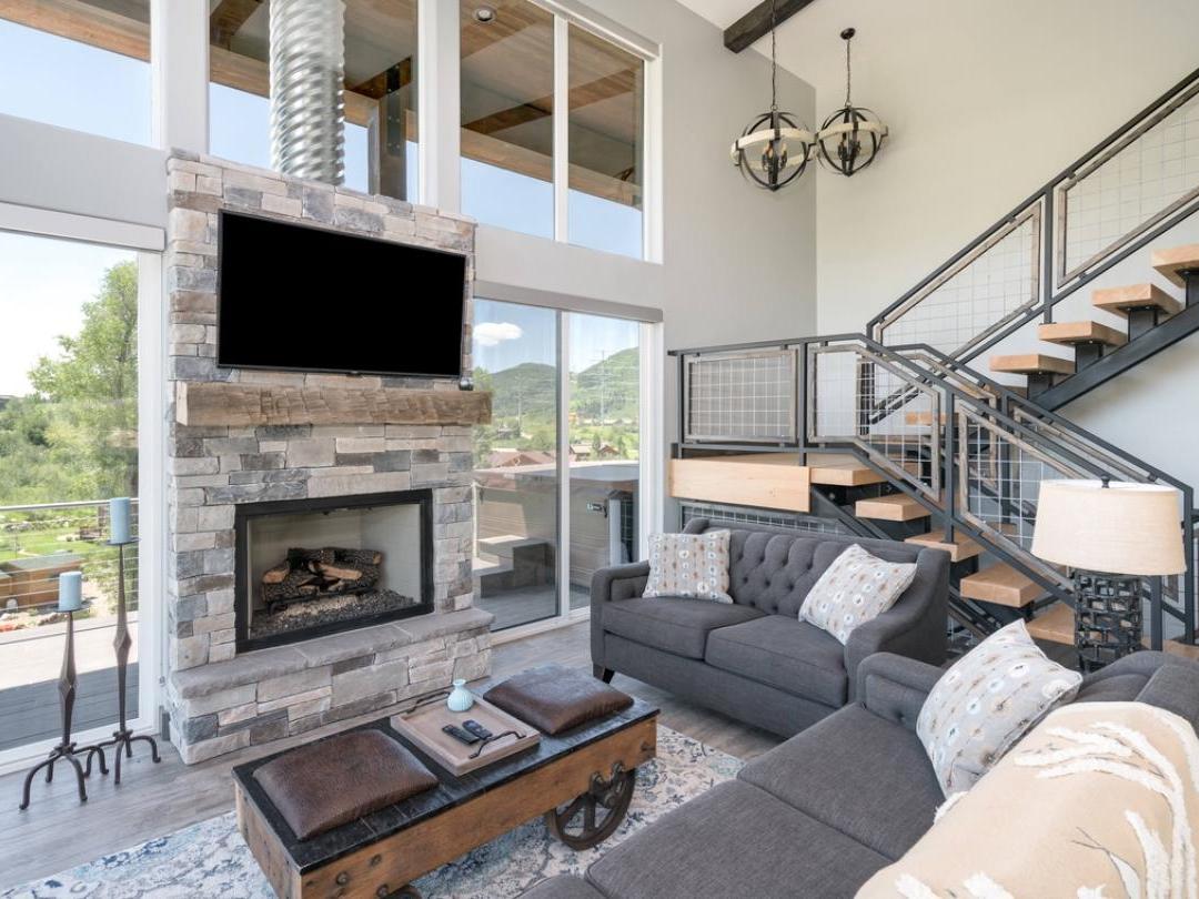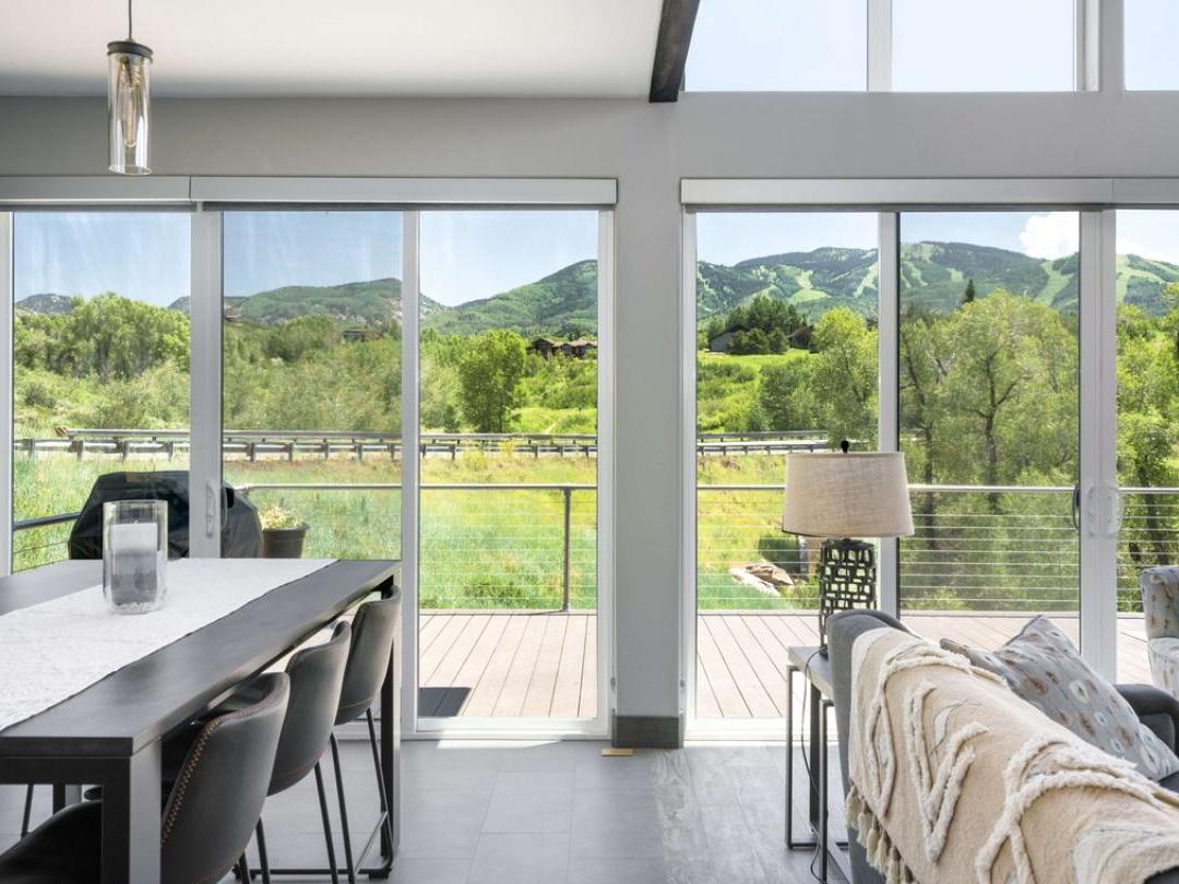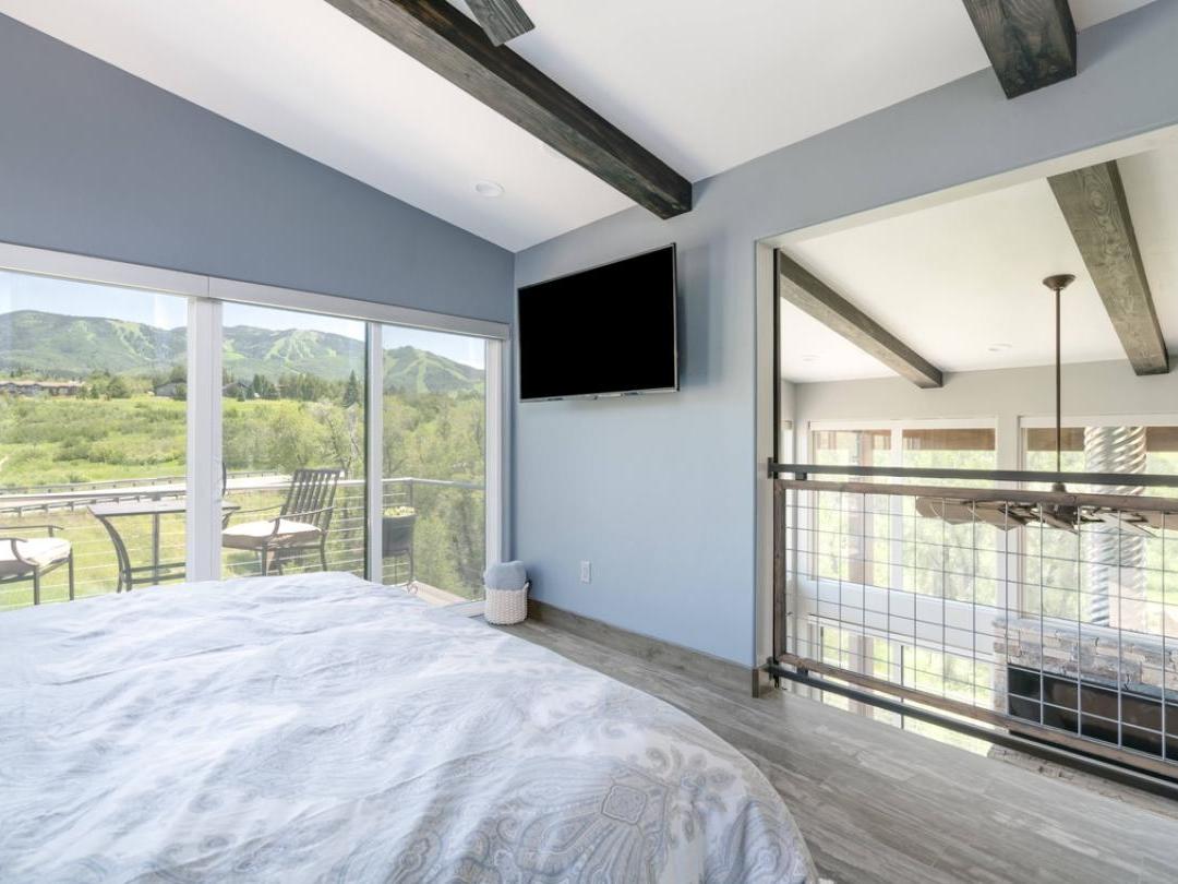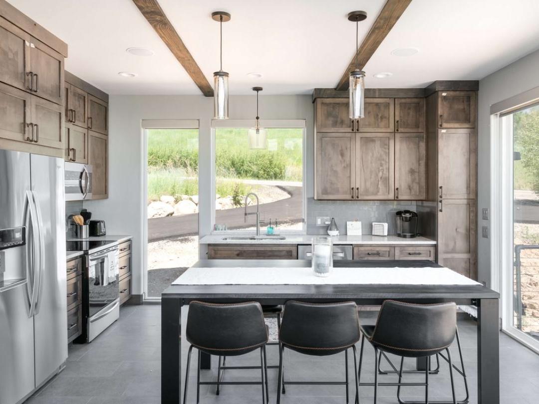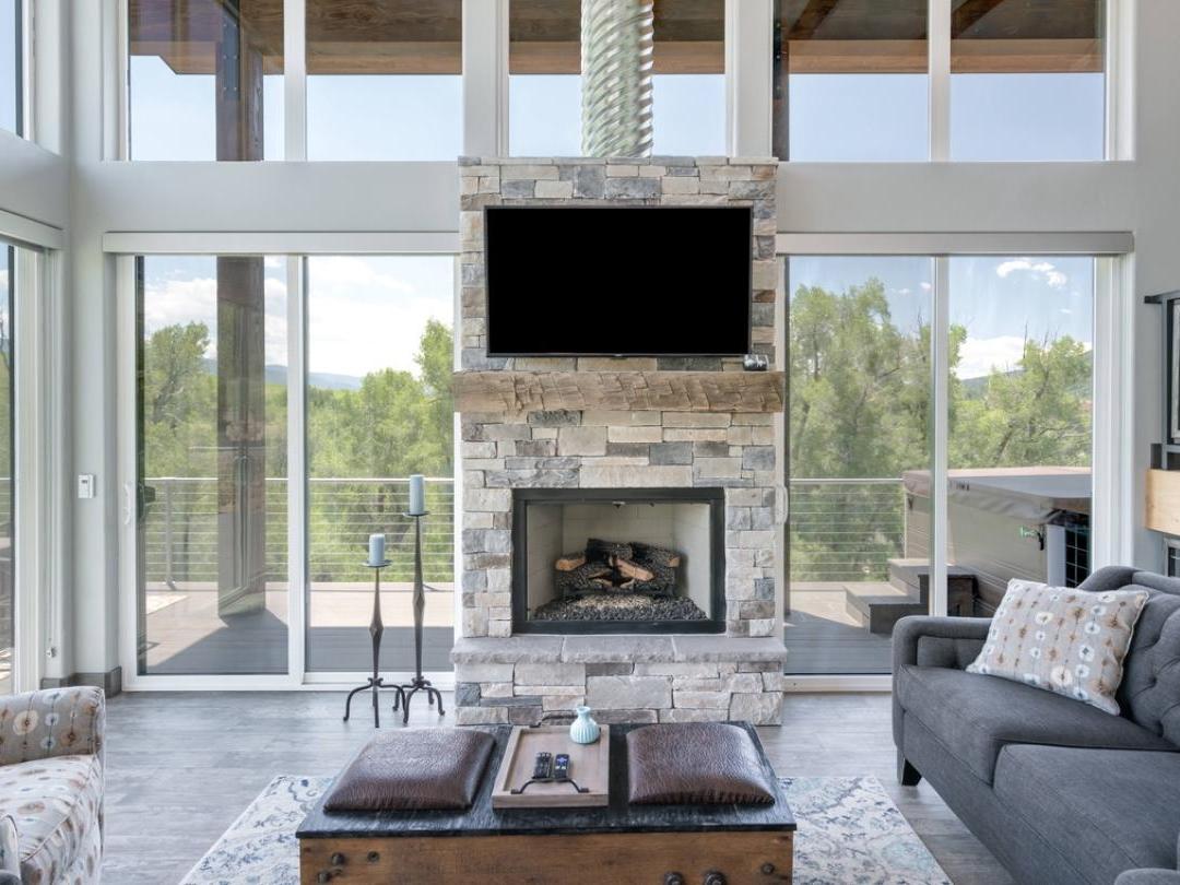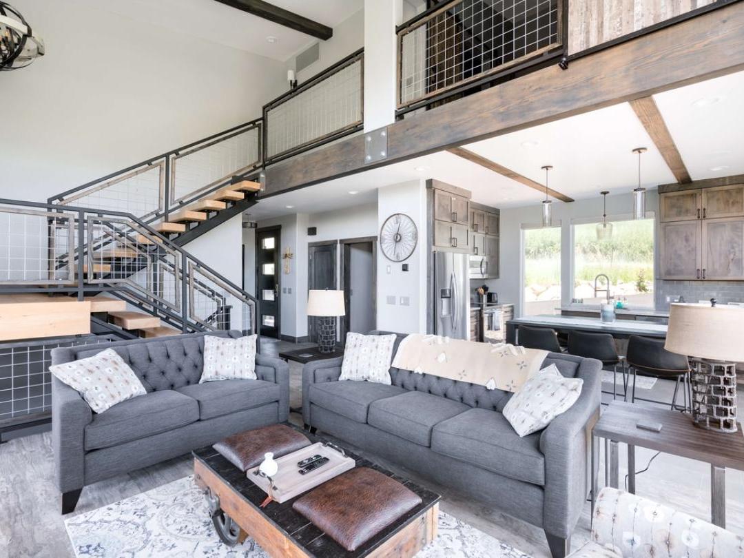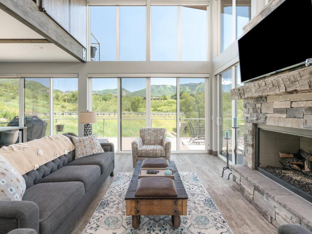 Scenes of natural spill into the living area through walls of windows in this 3 bedroom, 2.5 bathroom vacation home featuring a cozy sitting area focused on a gas fireplace beneath a wall-mounted television. Overlooking the living room, the open kitchen is appointed with stainless steel appliances, sleek cabinetry and a dining table seating 8 guests. Step through the glass doors onto the large deck to grill up a meal or relax in the private hot tub while enjoying those inspiring mountain and valley views.