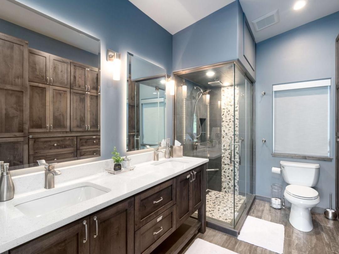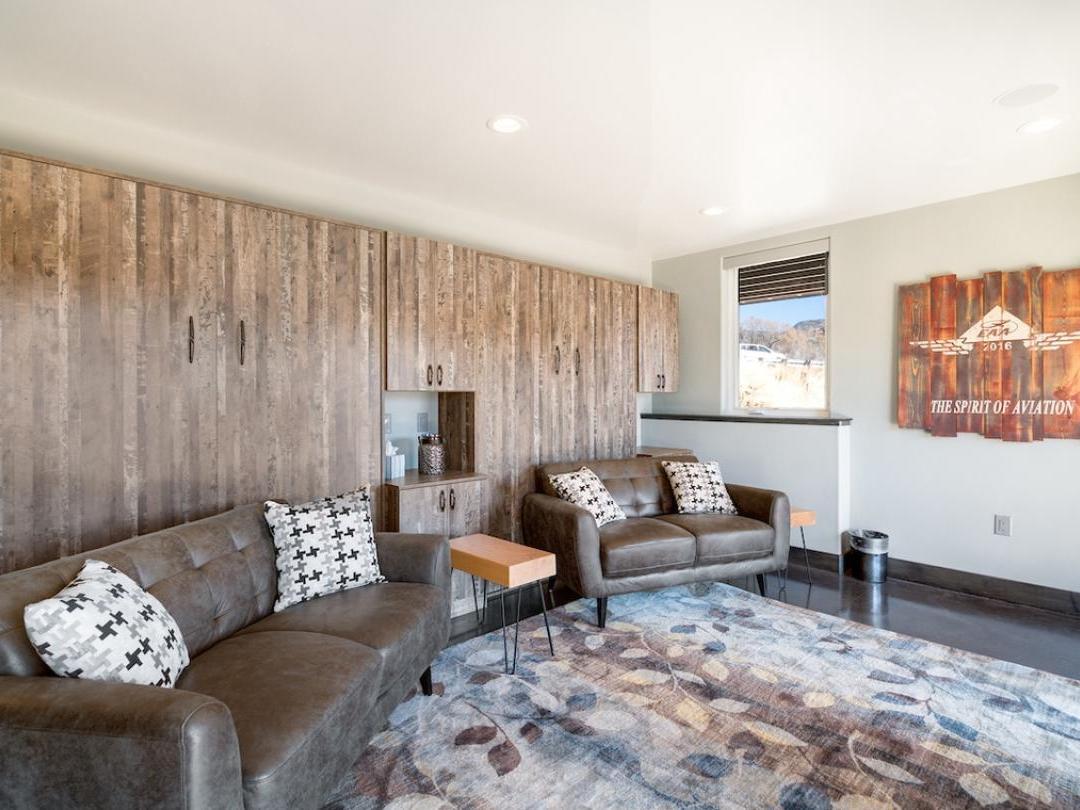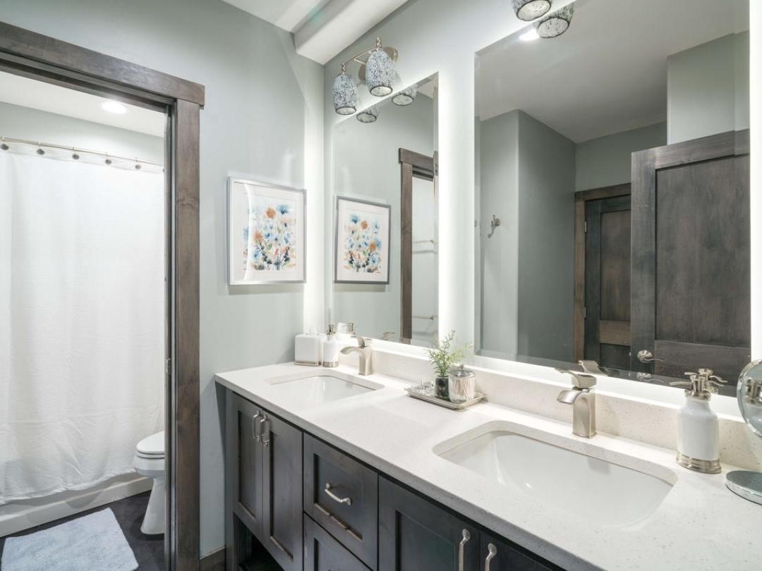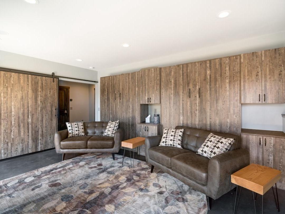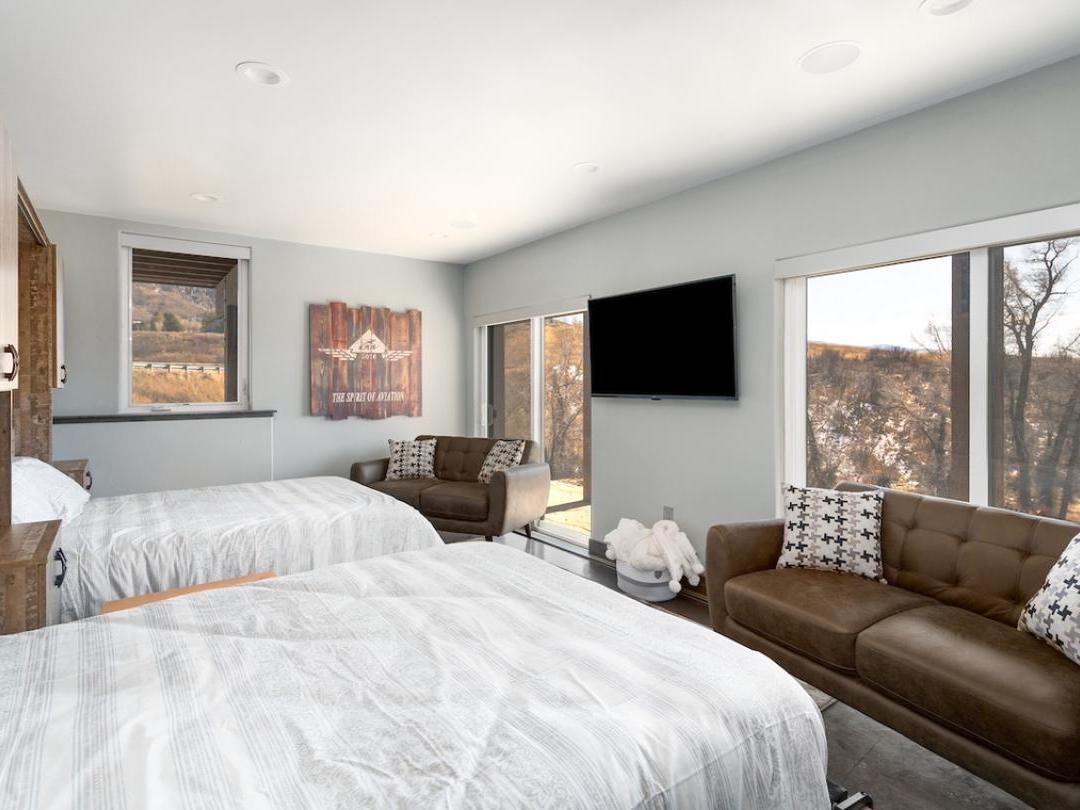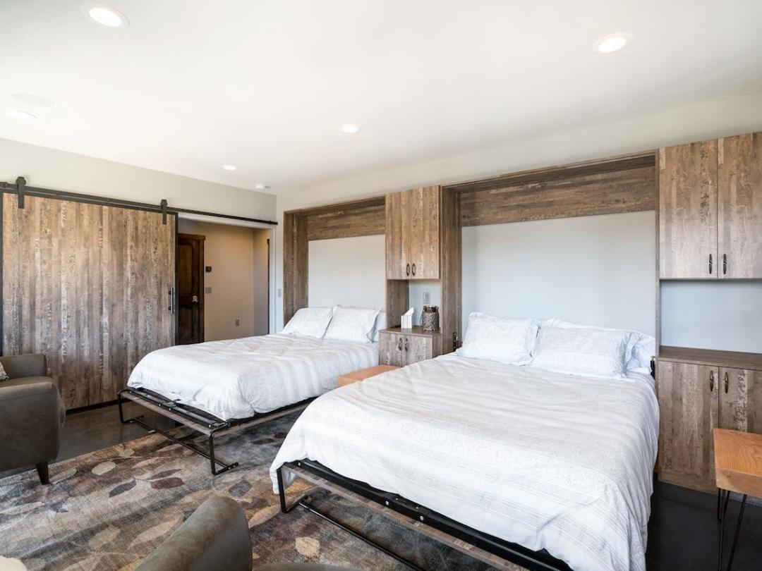 Perched above the living area is the lofted primary bedroom with sliding doors that close off the room from the living area below, appointed with a King bed, private balcony and a private bathroom with a dual-sink vanity and walk-in shower. Furnished with a Queen bed, the lower level guest bedroom has an attached bathroom. Doubling as a den area with sofas arranged in front of a wall-mounted television, the lower level bedroom is outfitted with two Queen Murphy beds that pull down from the wall and utilizes the guest bedroom's attached bathroom.