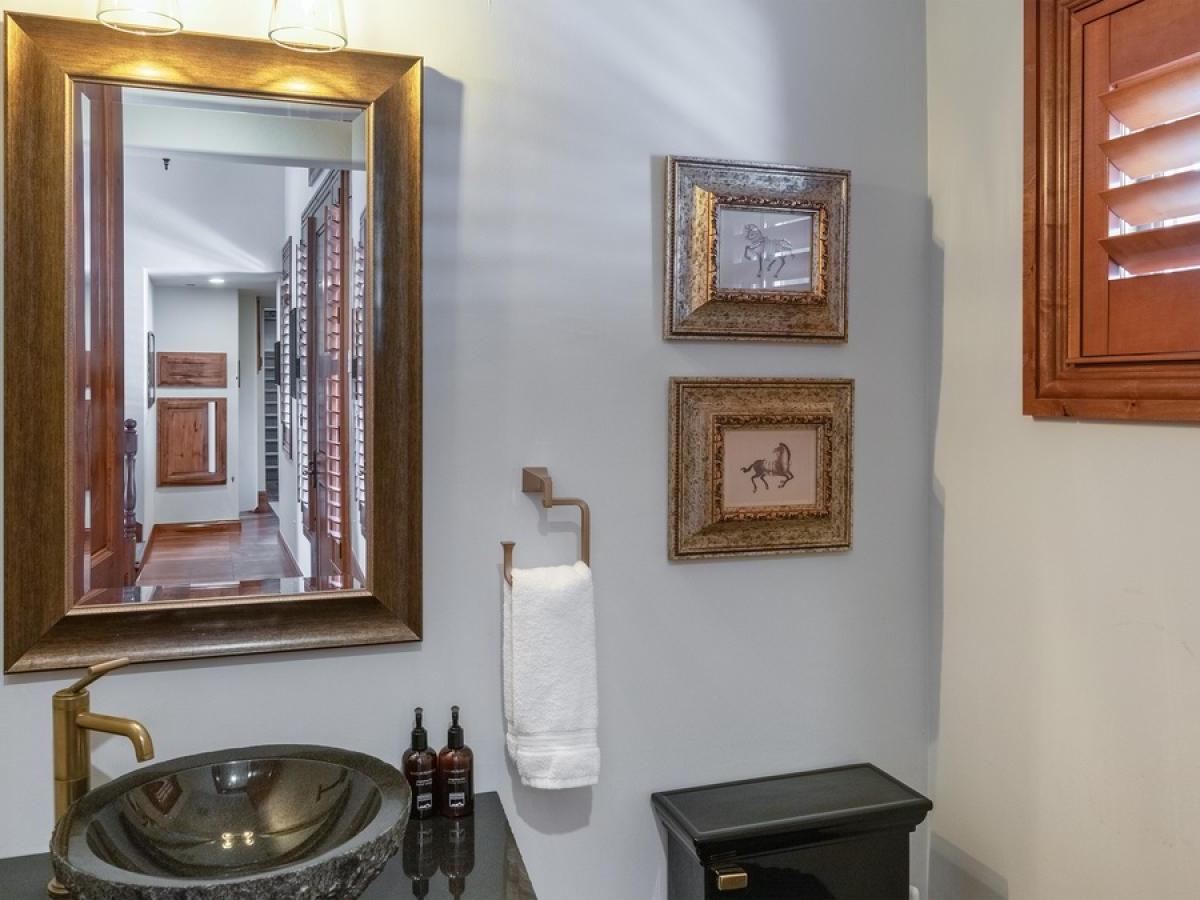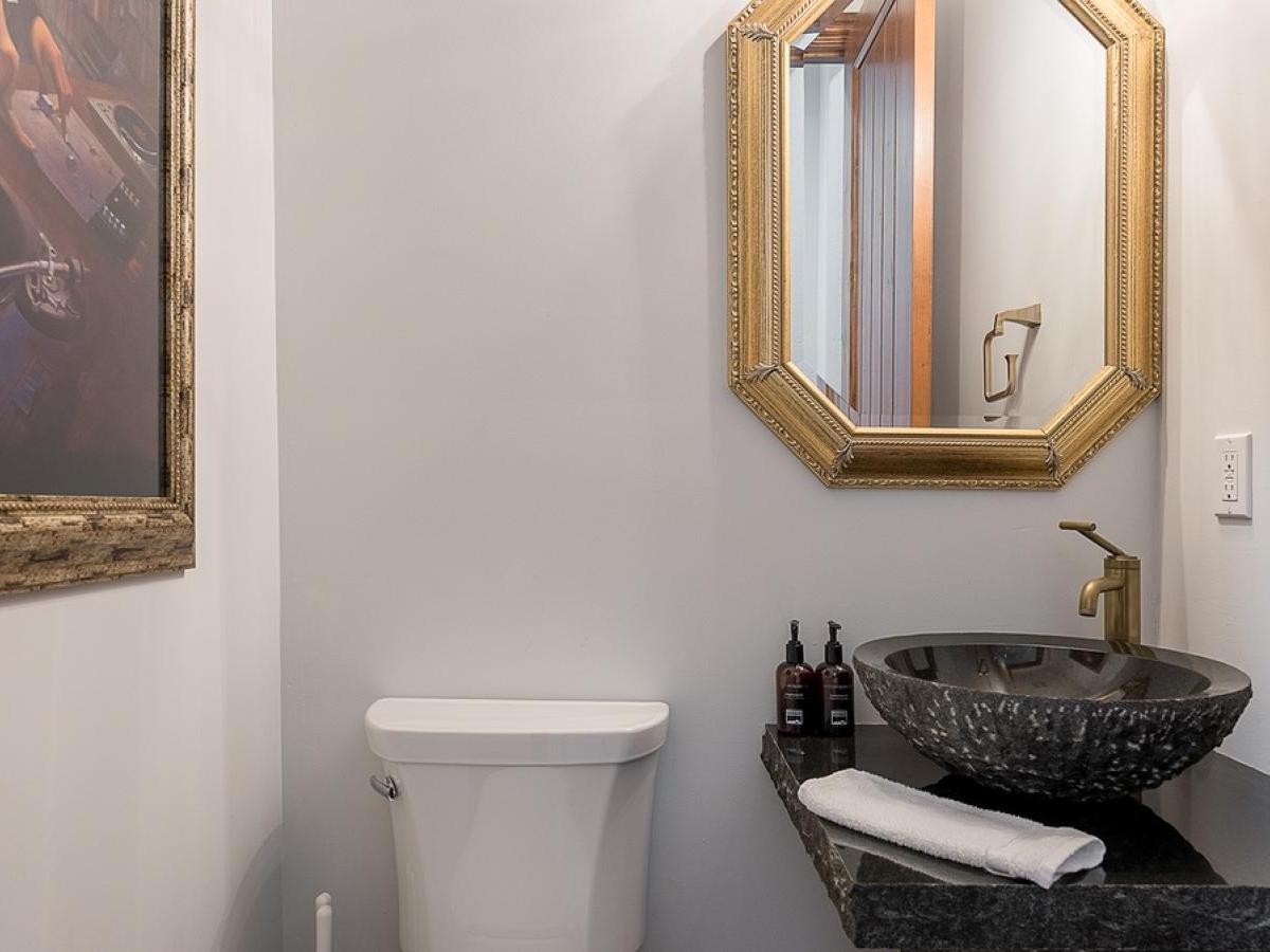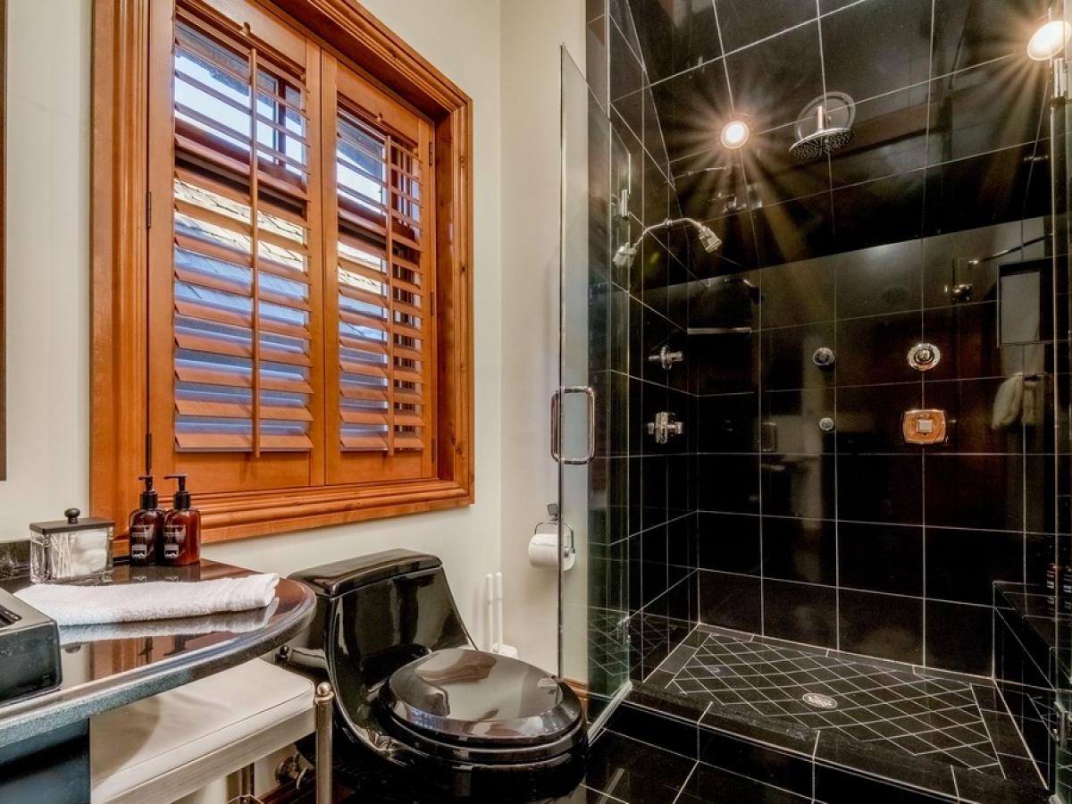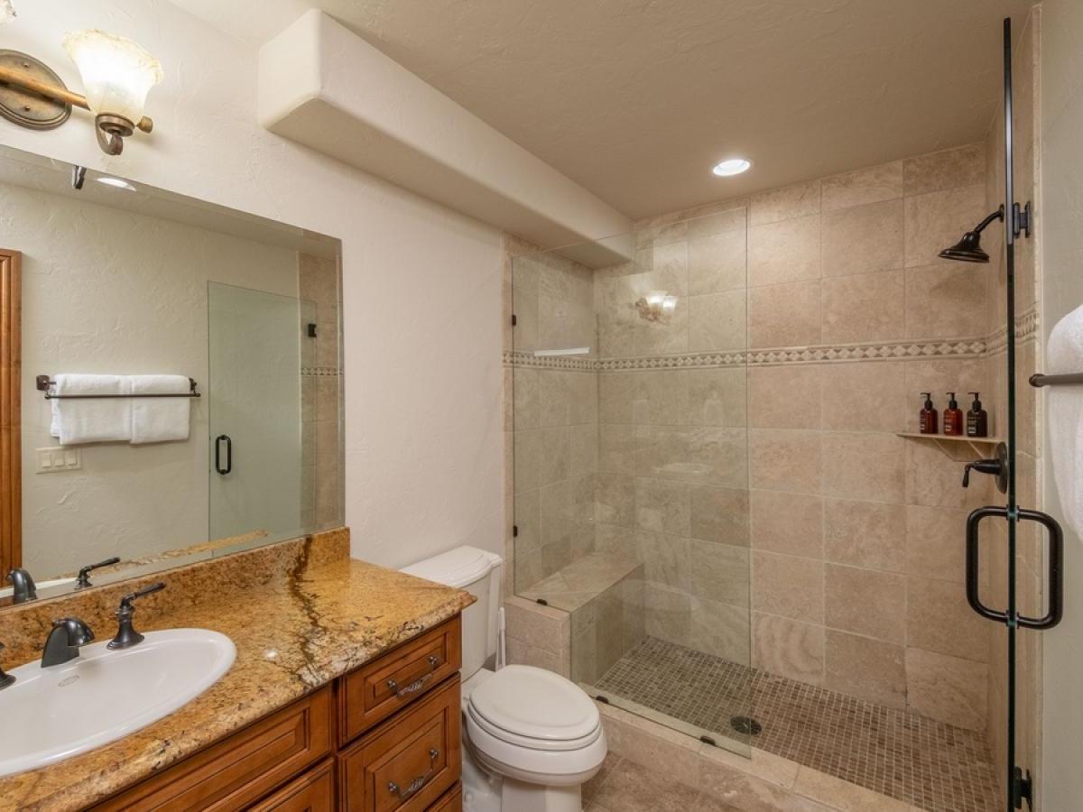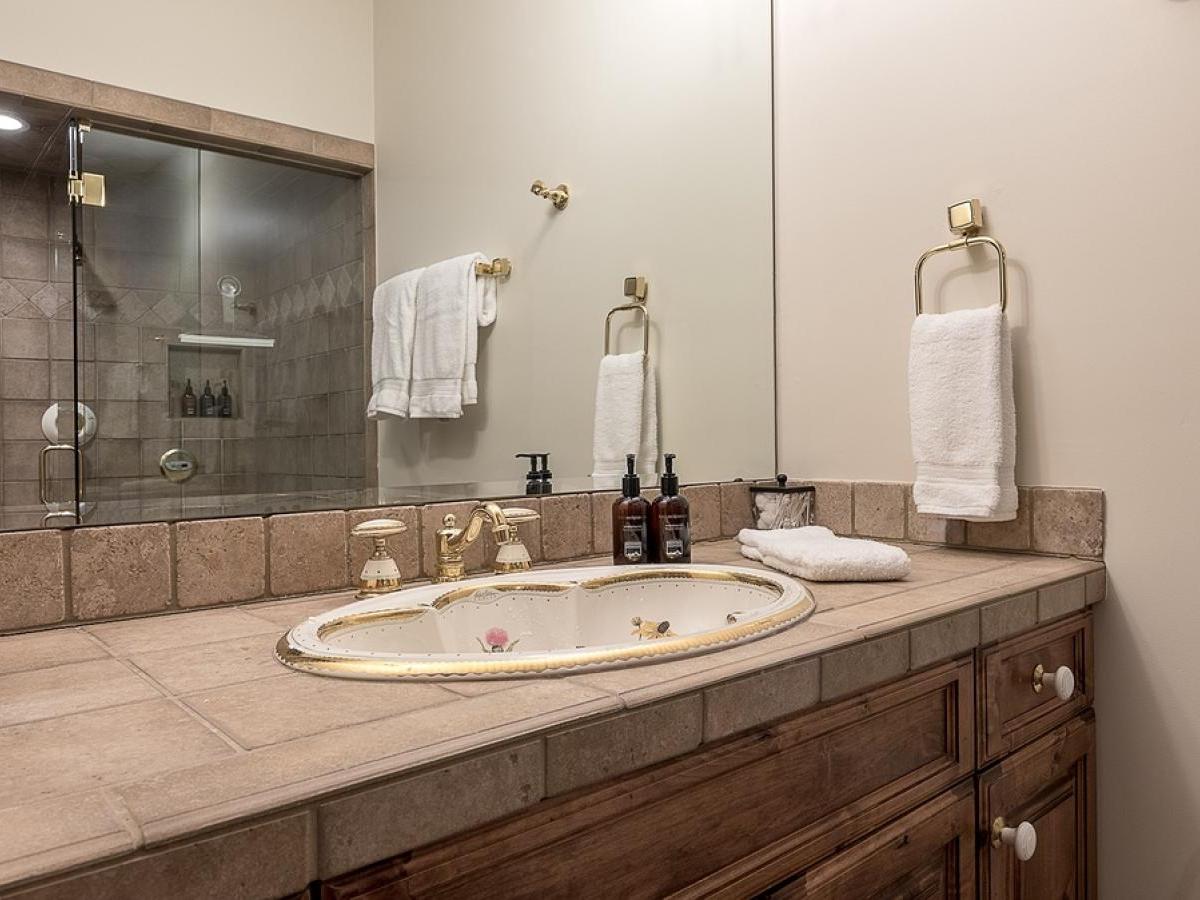 Bedrooms are thoughtfully positioned for privacy and flexibility. The main-level primary suite boasts a king bed, cozy fireplace, ensuite bath with double vanity, soaking tub and steam shower, and French doors opening to the deck. On the upper and lower levels you’ll find additional king suites, a mixed king + twins suite, and a private studio guest house with a queen bed, kitchenette, bath, and washer/dryer—a perfect set-up for families or multi-generation groups.