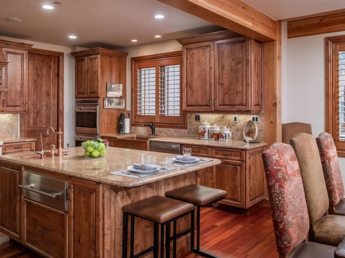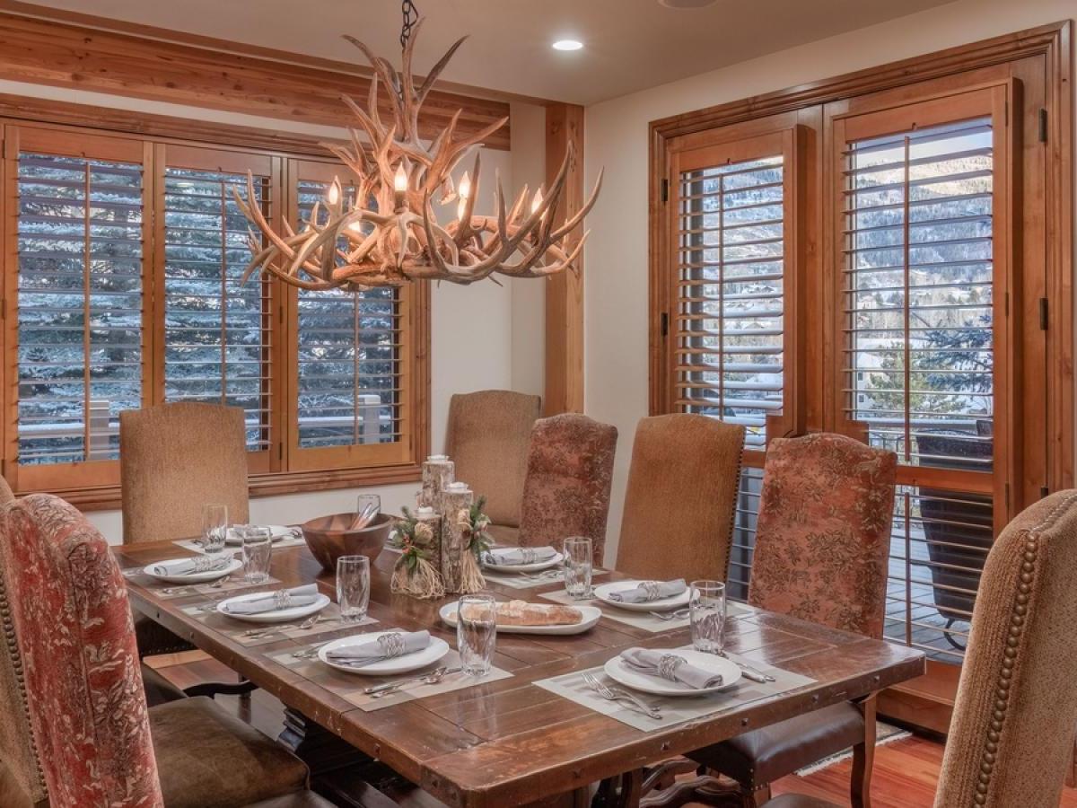 The kitchen is a chef’s dream: granite countertops, stainless-steel appliances including a Wolf gas range, double ovens, two dishwashers, and a large island with bar seating. The adjacent dining table seats eight with ease and invites shared meals filled with laughter and mountain views.