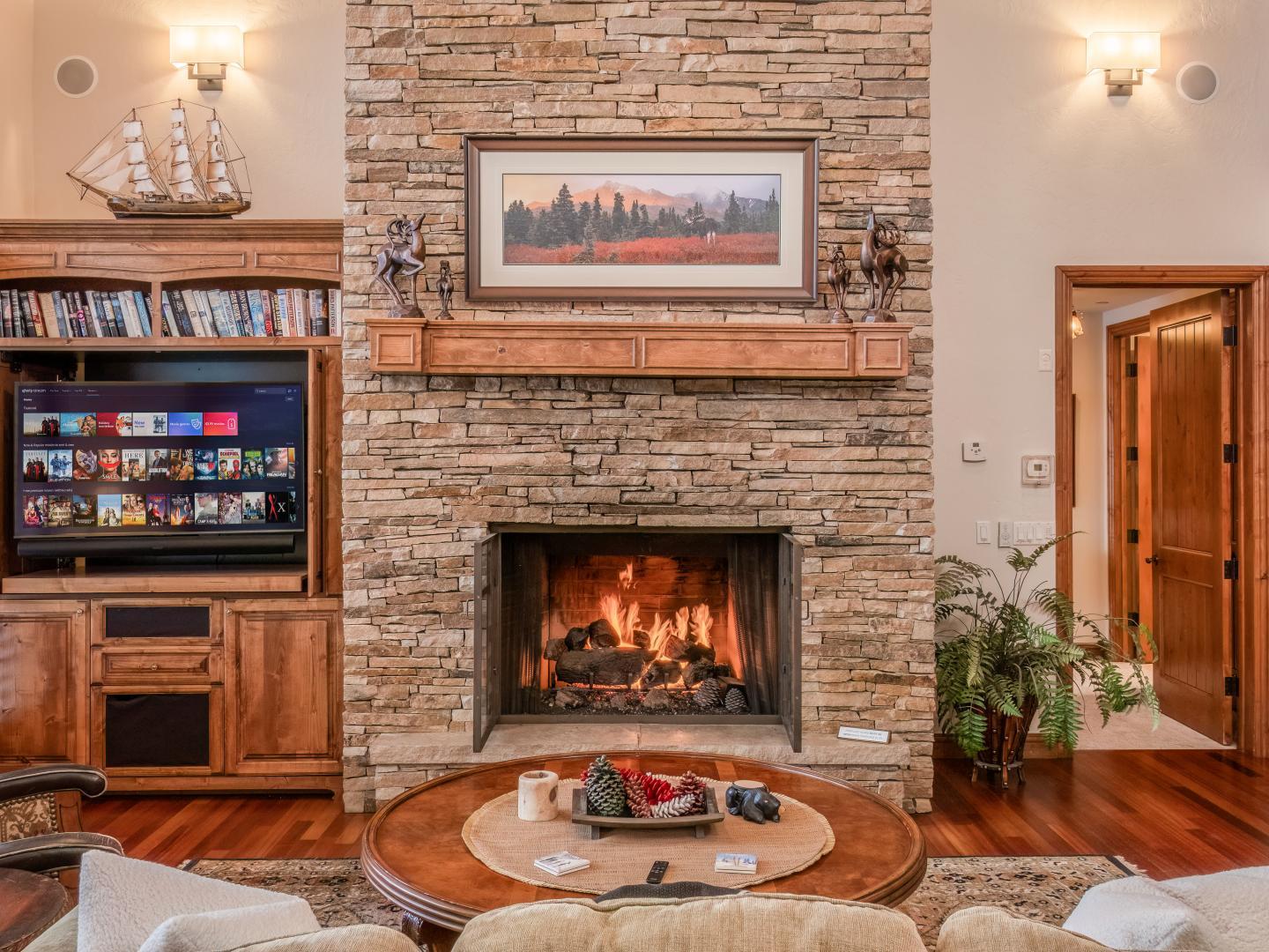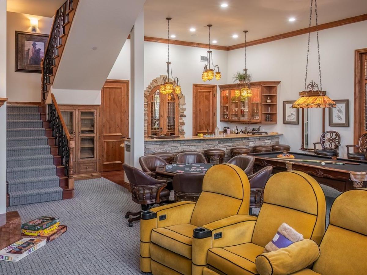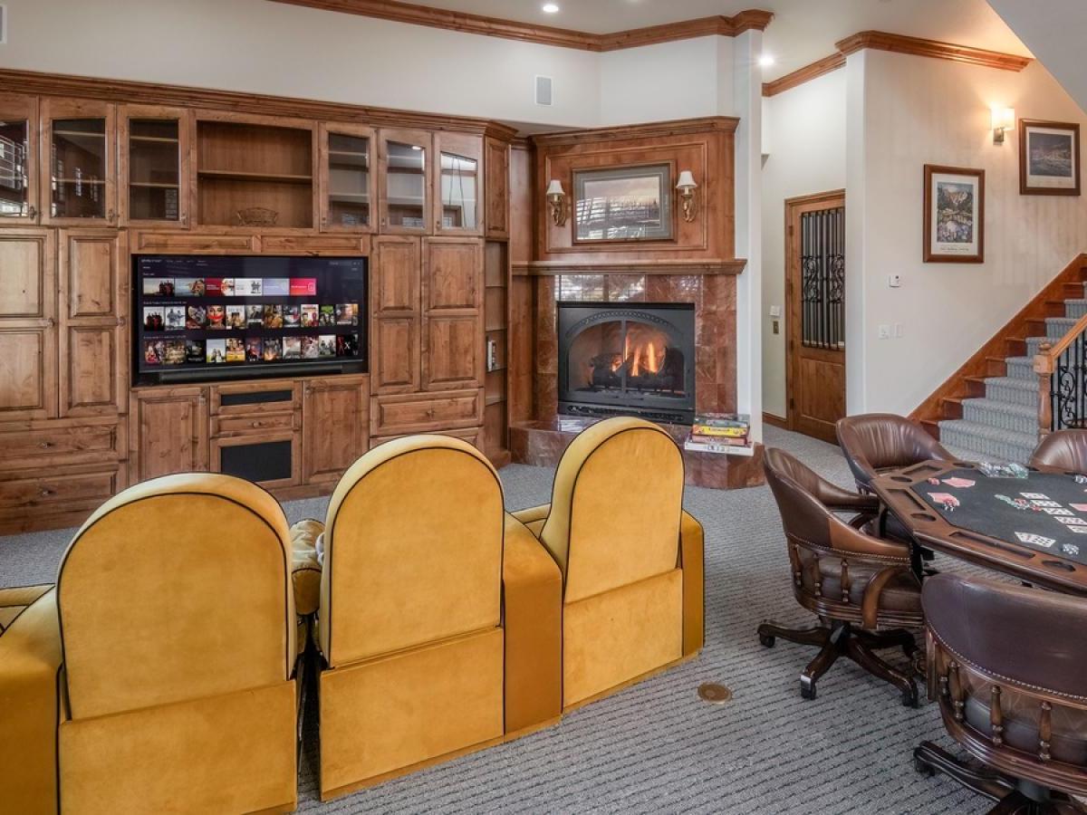 Downstairs, the entire lower level transforms into a mountain-lodge entertainment zone. Featuring a pool table, big-screen TV, theater-style seating, and a direct walk-out to the terrace with a sunken hot tub and firepit, this is the place to unwind after a day of adventure.