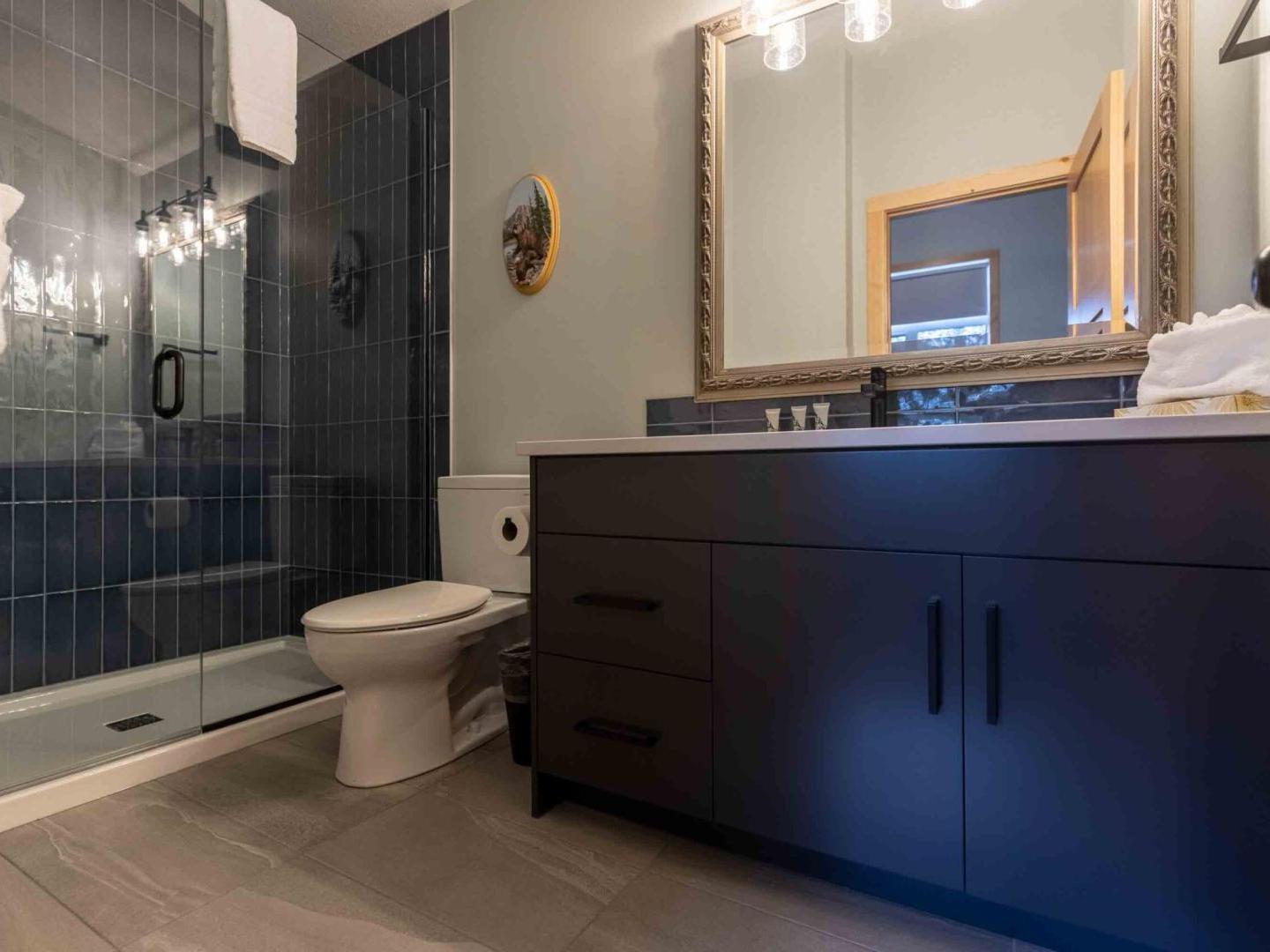 Main Level Primary Suite: This spacious retreat features a King bed and a private en-suite bathroom with a dual-sink vanity and walk-in shower.