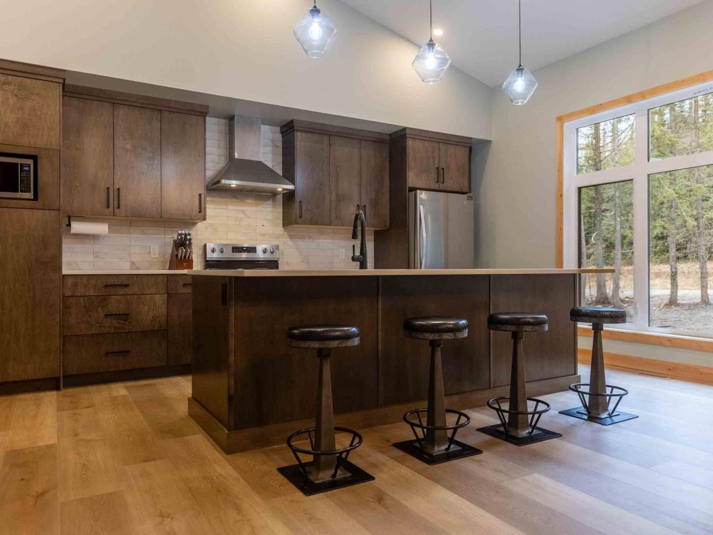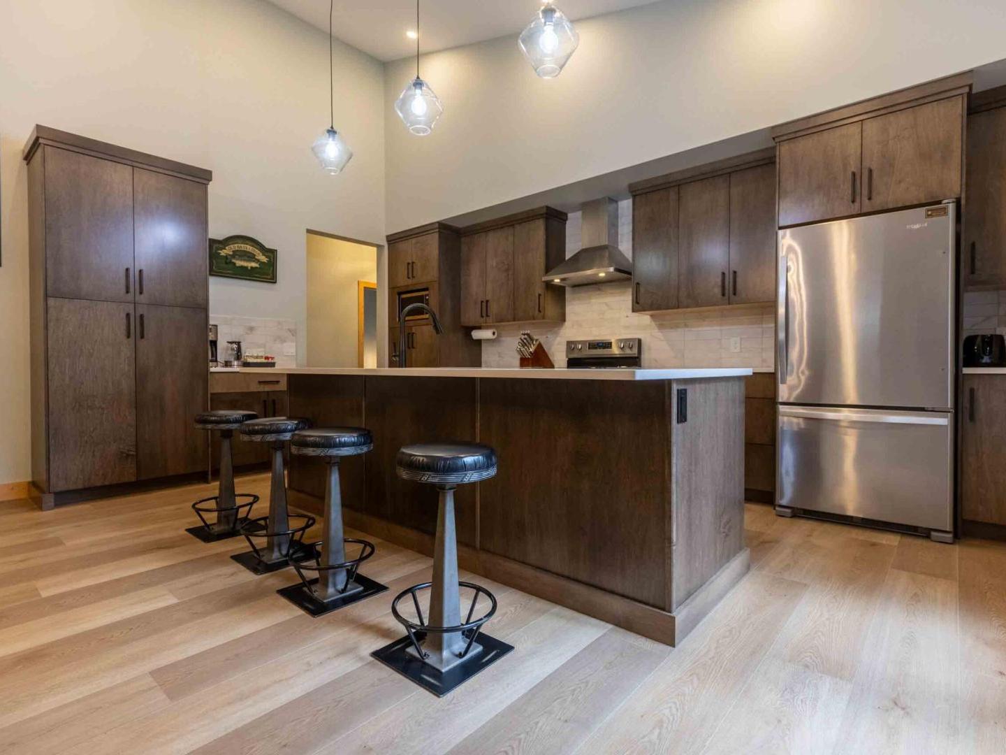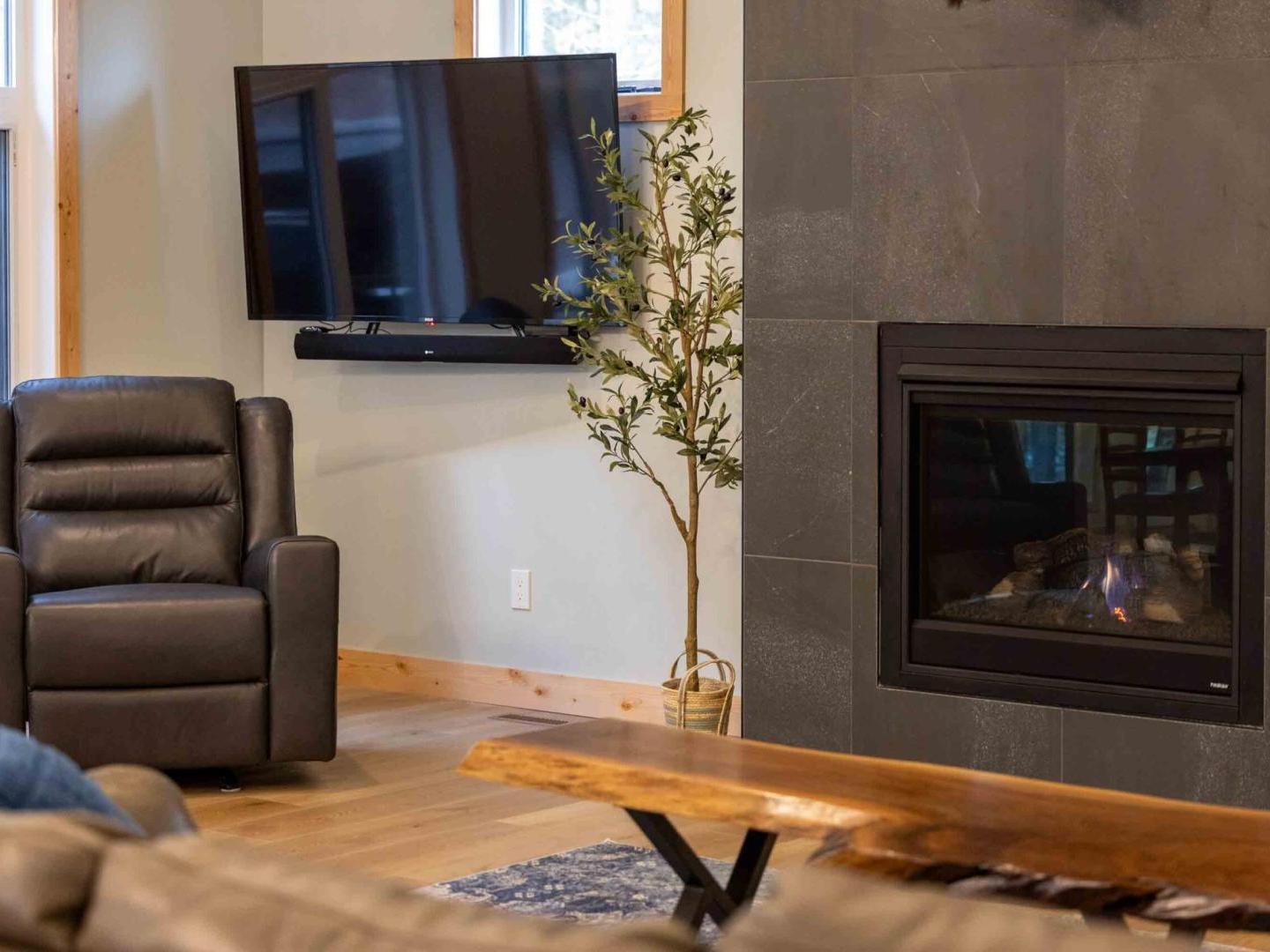 Spanning the main level of this 5 bedroom, 3.5 bathroom vacation home is an open Great Room anchored by a cozy living area with leather furnishings focused on a gas fireplace and wall-mounted television. The living area flows effortlessly into the adjacent kitchen, which is outfitted with high-end appliances, granite countertops, and a breakfast bar with seating for four. A nearby dining table offers space for six, making it easy to gather for meals after a day on the slopes. Step outside to the back patio to fire up the grill or soak in the private hot tub as you take in the crisp mountain air—an ideal end to any Fernie adventure.