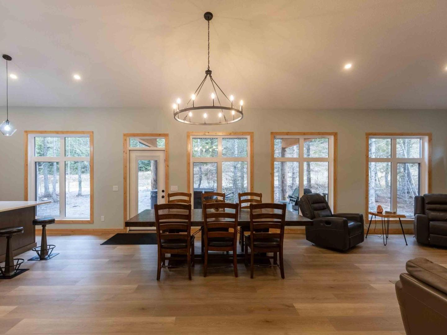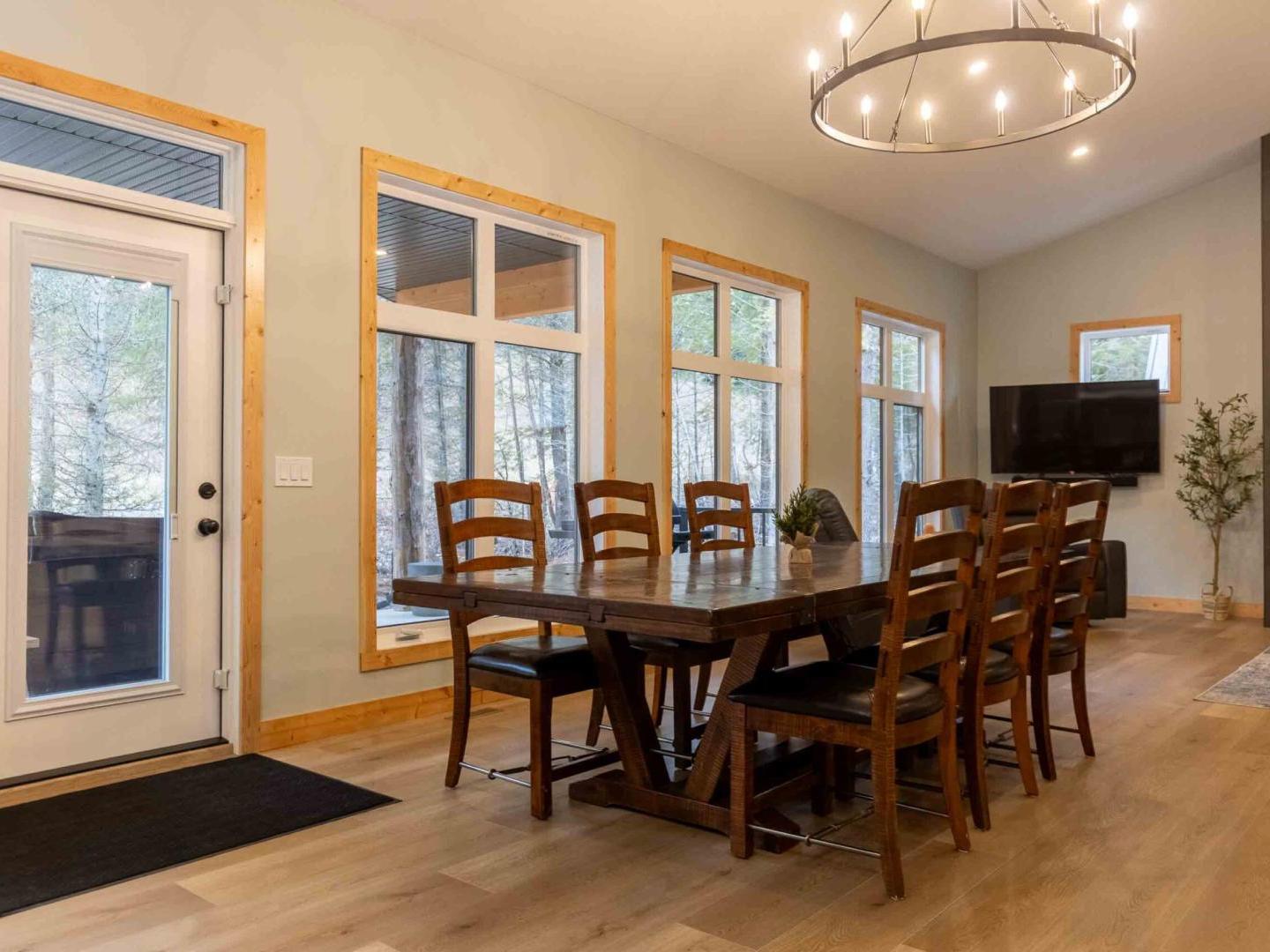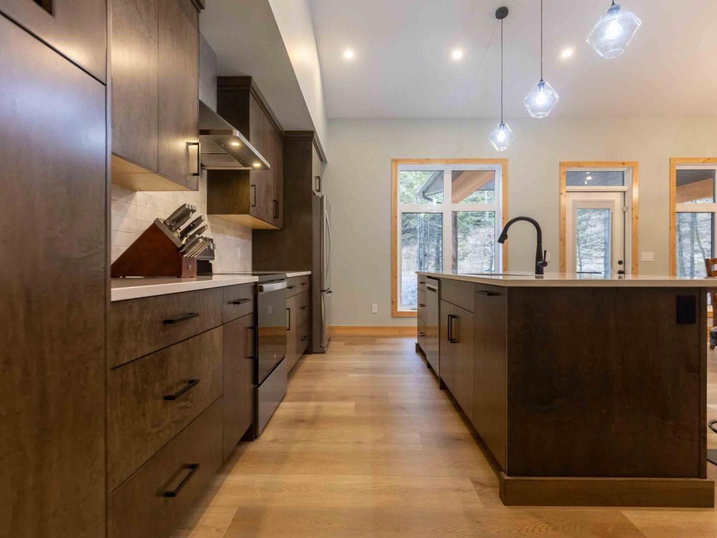 Spanning the main level of this 5 bedroom, 3.5 bathroom vacation home is an open Great Room anchored by a cozy living area with leather furnishings focused on a gas fireplace and wall-mounted television. The living area flows effortlessly into the adjacent kitchen, which is outfitted with high-end appliances, granite countertops, and a breakfast bar with seating for four. A nearby dining table offers space for six, making it easy to gather for meals after a day on the slopes. Step outside to the back patio to fire up the grill or soak in the private hot tub as you take in the crisp mountain air—an ideal end to any Fernie adventure.