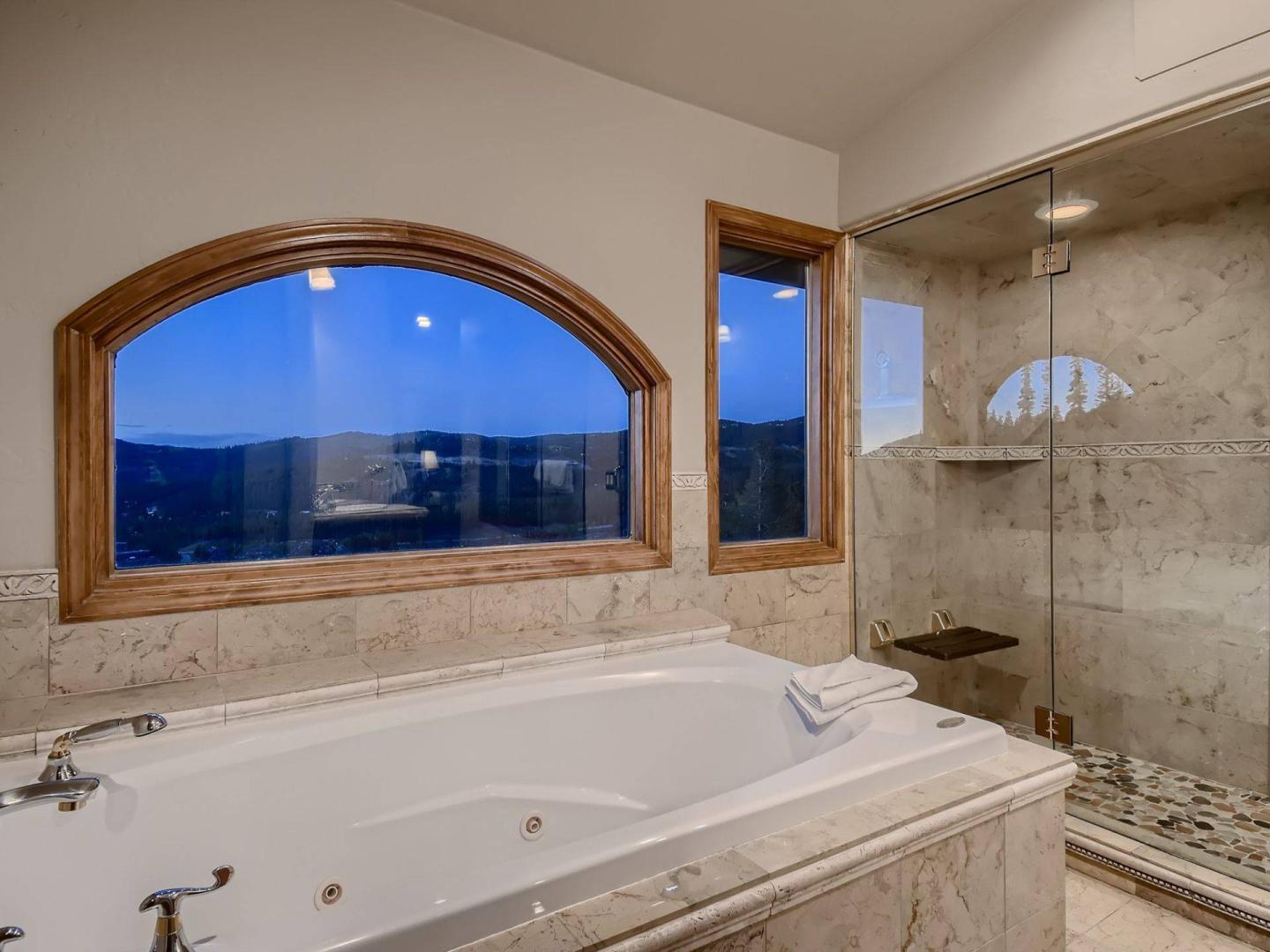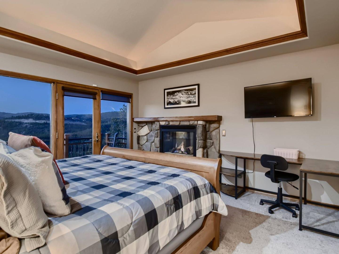 - Primary Suite: King Bed, private bathroom with jetted tub and steam shower, fireplace, TV