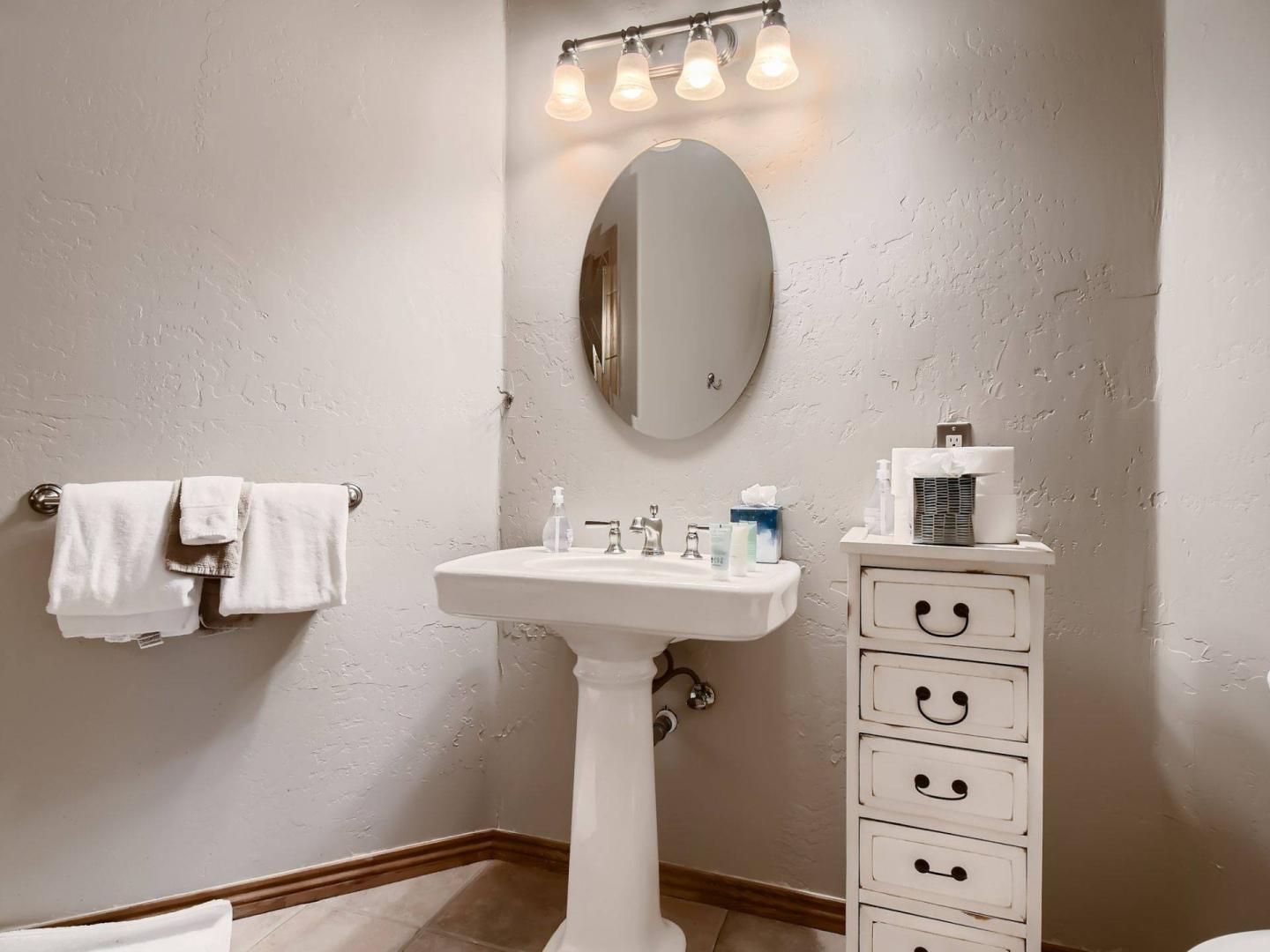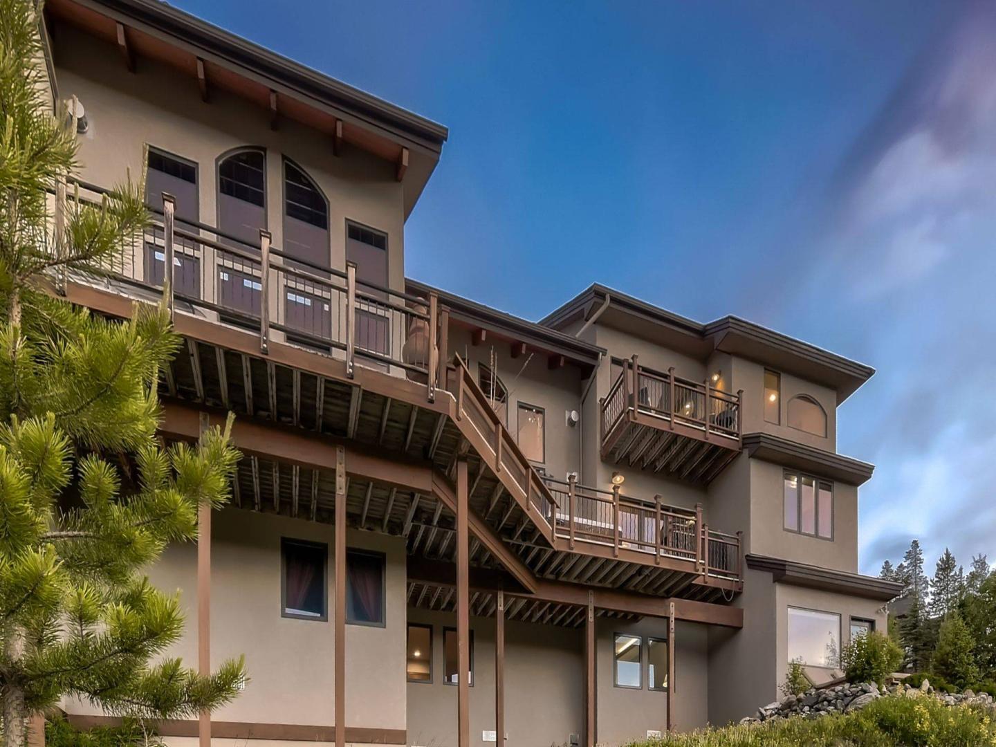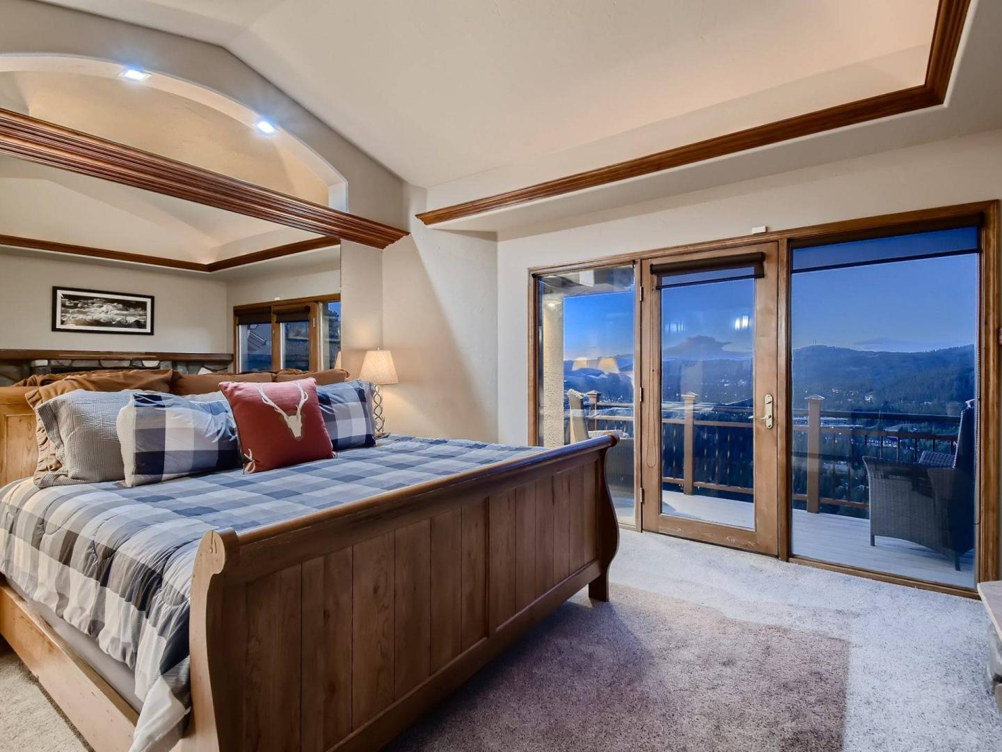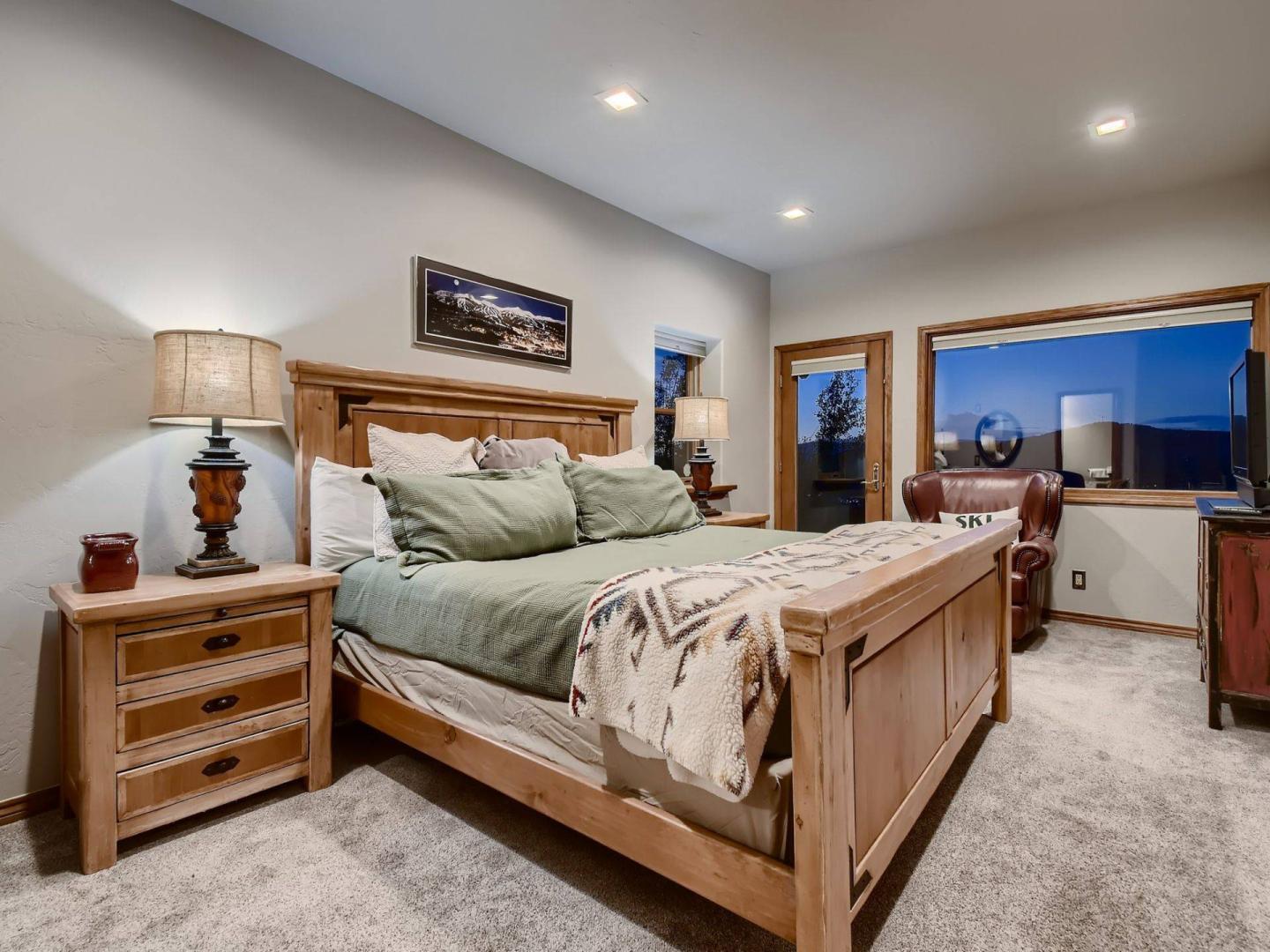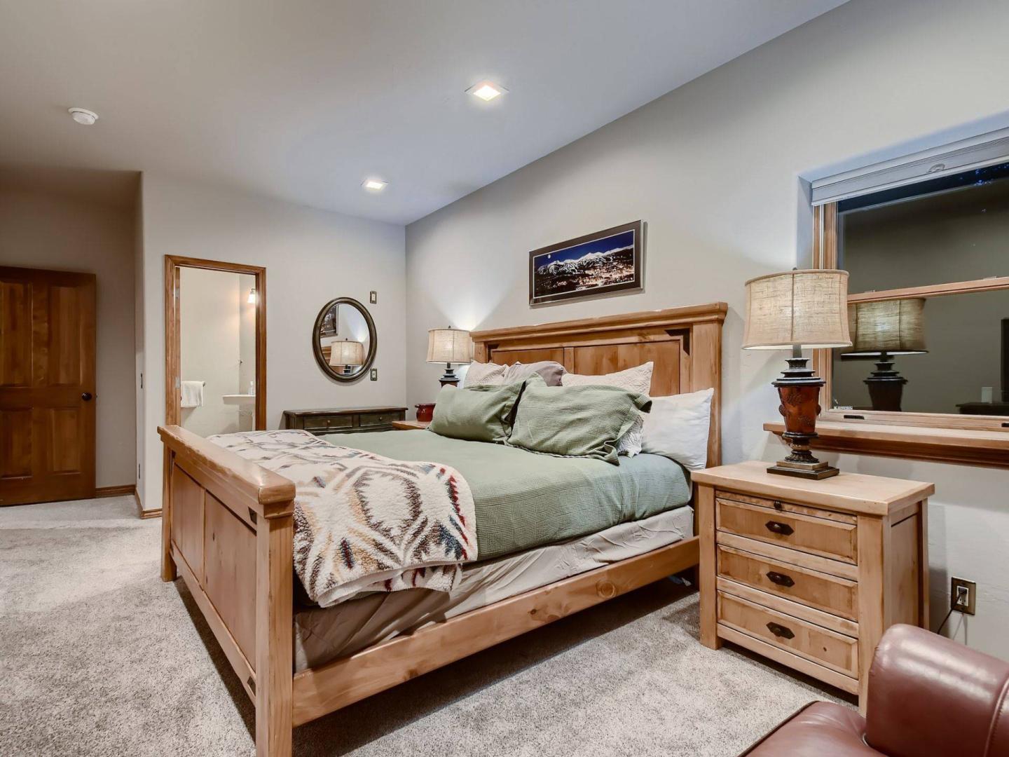 Accessed by a separate set of stairs off of the landing leading up to the loft and upper bedroom, the primary suite is outfitted with a King bed, gas fireplace, private deck, and private bathroom with a dual sink vanity, jetted tub, and steam shower. Three bedrooms are located on the lower level including another King suite with a private bathroom. Two bedrooms share a hall bathroom, one offers a King bed while the other is equipped with a Queen bed.