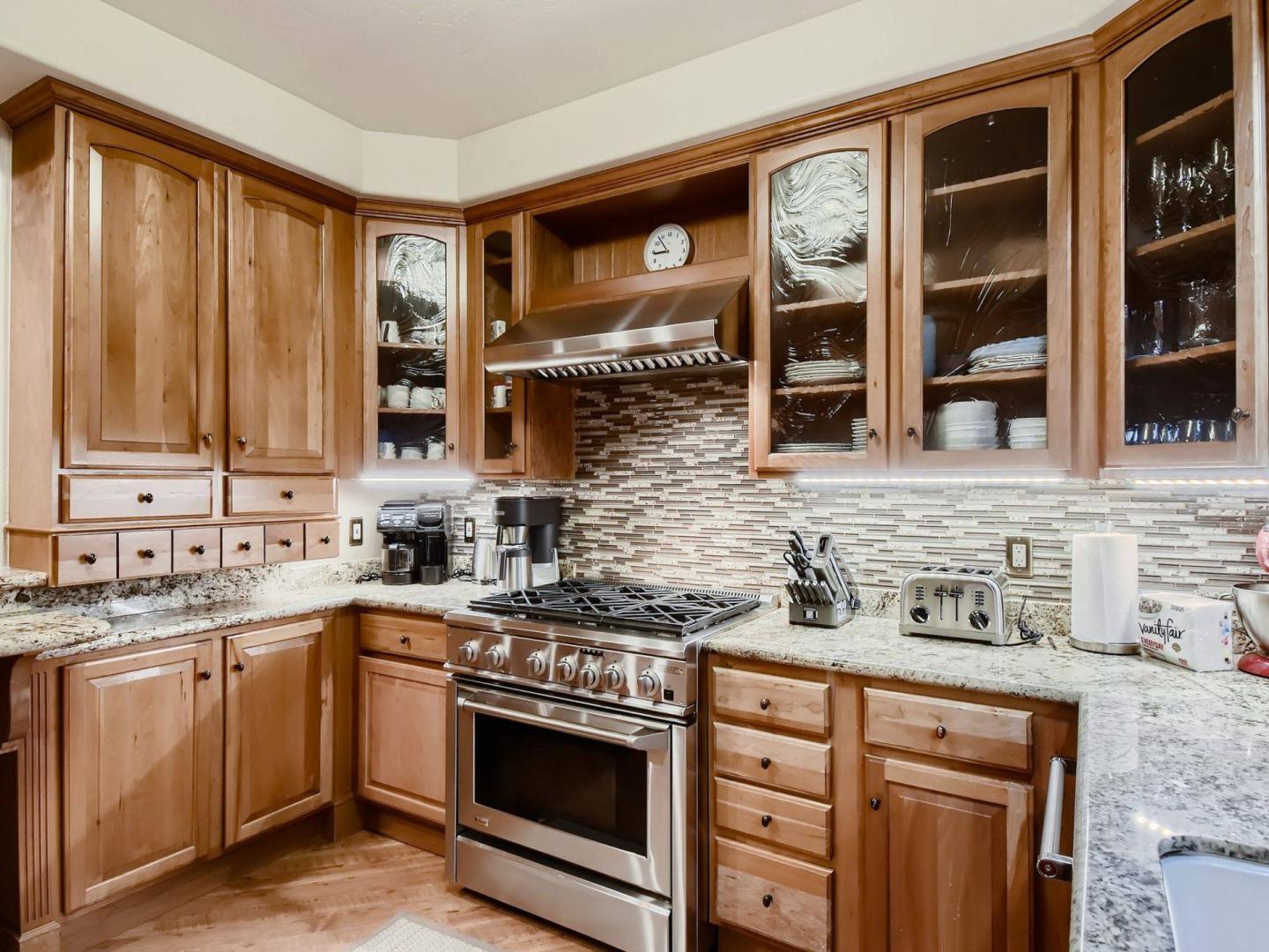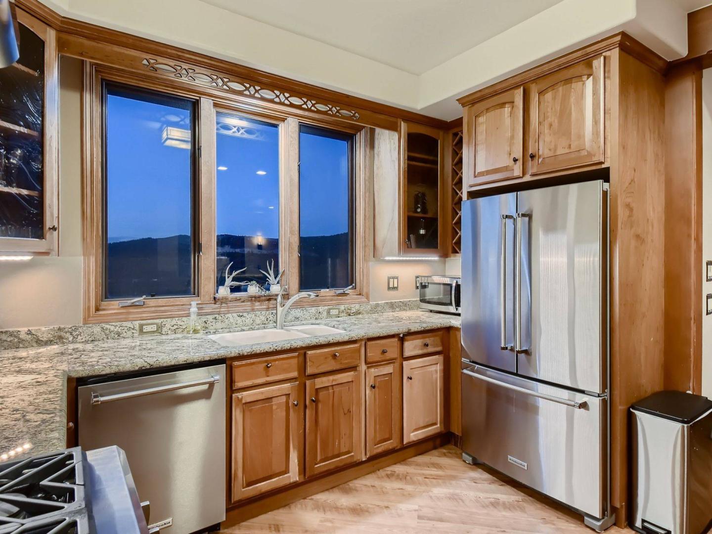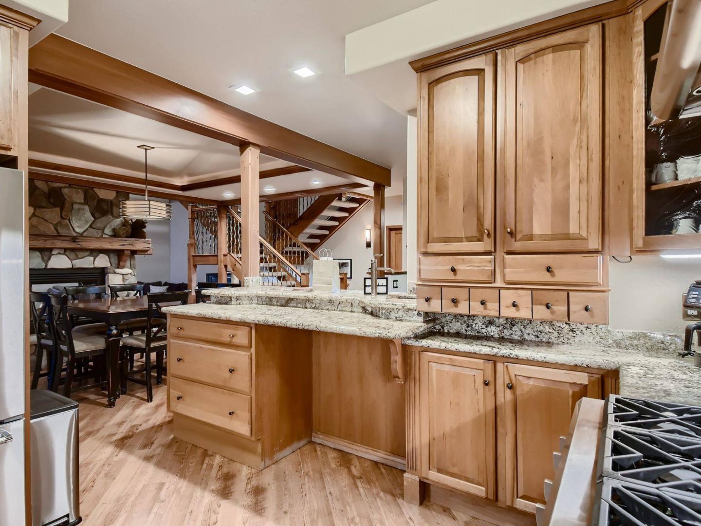 On the opposite side of the fireplace from the living room find a dining table with seating for 8 guests and the adjacent kitchen. Boasting stainless steel appliances and granite countertops, the kitchen is stocked for the chefs in the group to prepare tasty meals. In addition to the basic tools, you’ll find a slow cooker, food processor, stand mixer, air fryer, and blender. There’s a Keurig duo coffee machine, which makes single pods or you can fresh grind coffee and make a full pot. Another access point to the deck is off the dining area for convenience to the barbecue grill.