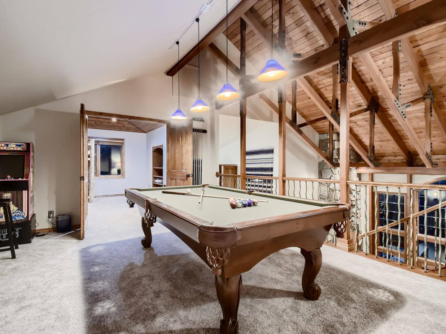 Overlooking the living room is a large loft area hosting a pool table and flatscreen television. Perfect for the kids, the upper level bedroom that is located off of the loft is furnished with two bunk beds, one with a Twin on top and Full on the bottom plus a Twin trundle bed that pulls out from underneath and the other with a Twin on top and bottom. The loft and bunk bedroom utilize the half bathroom on the main level or the full bathroom in the upper level primary bedroom.