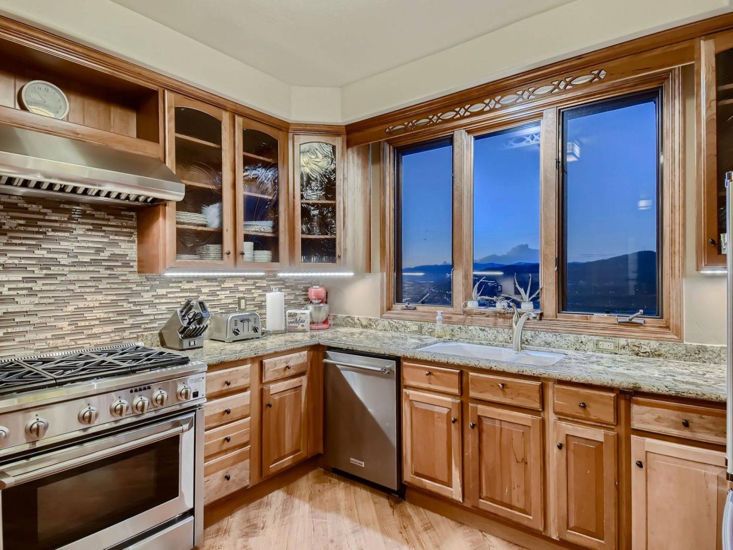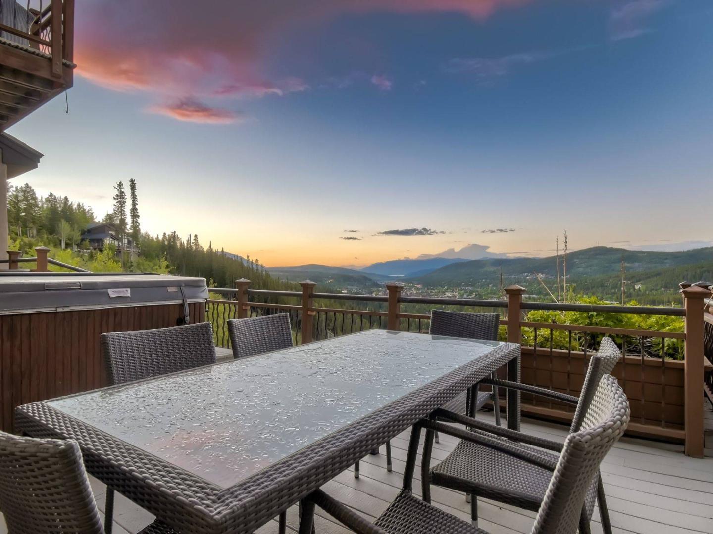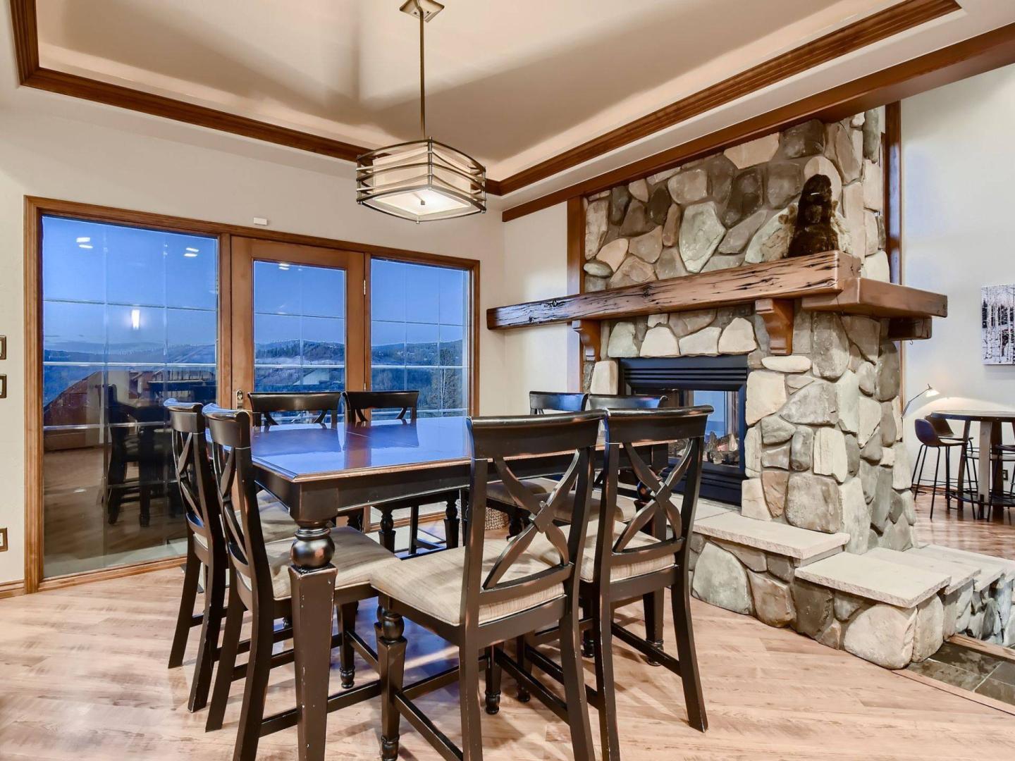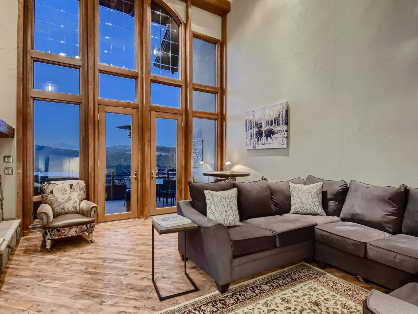 Upon entering this 5 bedroom, 3.5 bathroom private vacation home you encounter an expansive great room divided by an impressive river rock fireplace that rises two stories on the living room side. Vaulted ceilings and a wall of windows showcasing inspiring mountain views frame the comfortably furnishing living room centered on a flatscreen television and including a high-top bar table. Step out onto the deck through glass doors in the living room to get a closer look at those views while relaxing in the private hot tub.