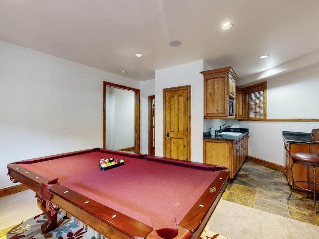 Located a half-level above the living area, the primary bedroom is appointed with a King bed, double-sided gas fireplace and private bathroom equipped with a dual-sink vanity, double-headed walk-in shower, and jetted tub framed by the double-sided fireplace. Also on this level, the guest bedroom is outfitted with a Full bed and attached bathroom. Another half level up, two guest bedrooms include private bathrooms, one is furnished with a King bed while the other has a Full bed. Set on the lower level is a guest bedroom with a King bed, private bathroom and separate room with a pool table and efficiency wet bar.