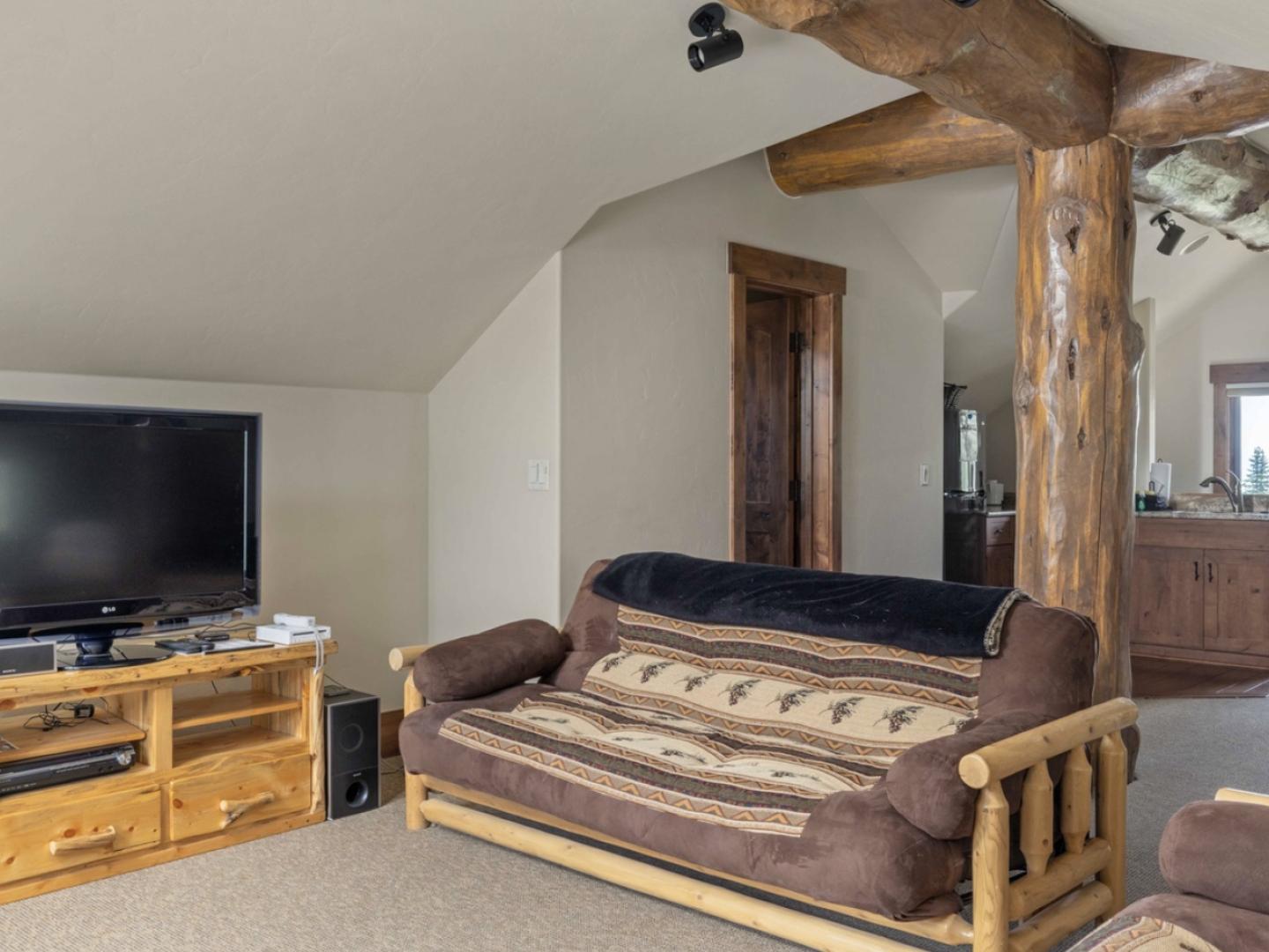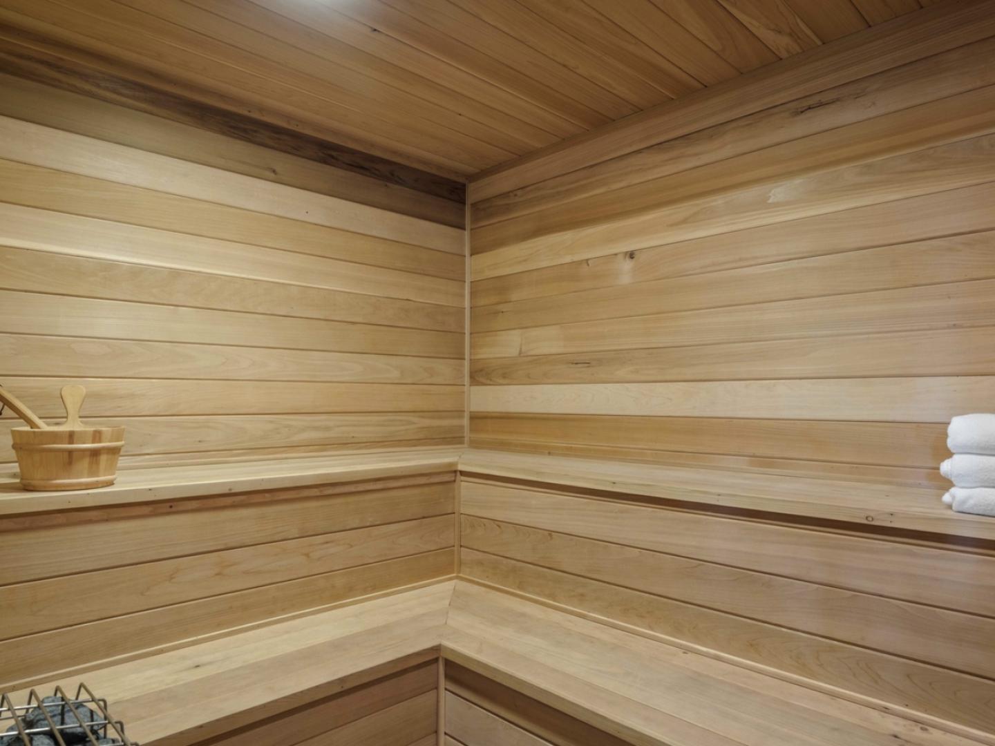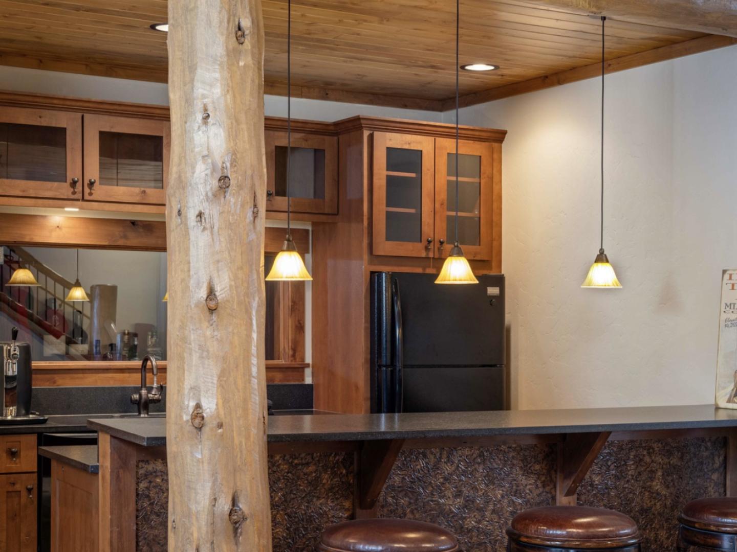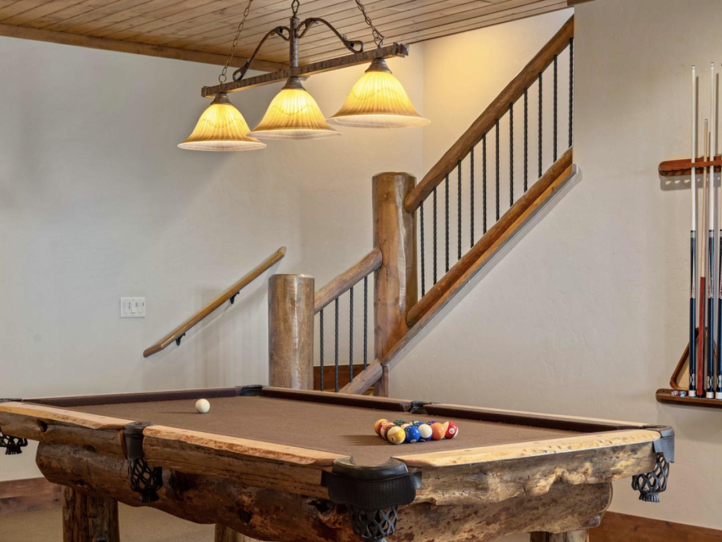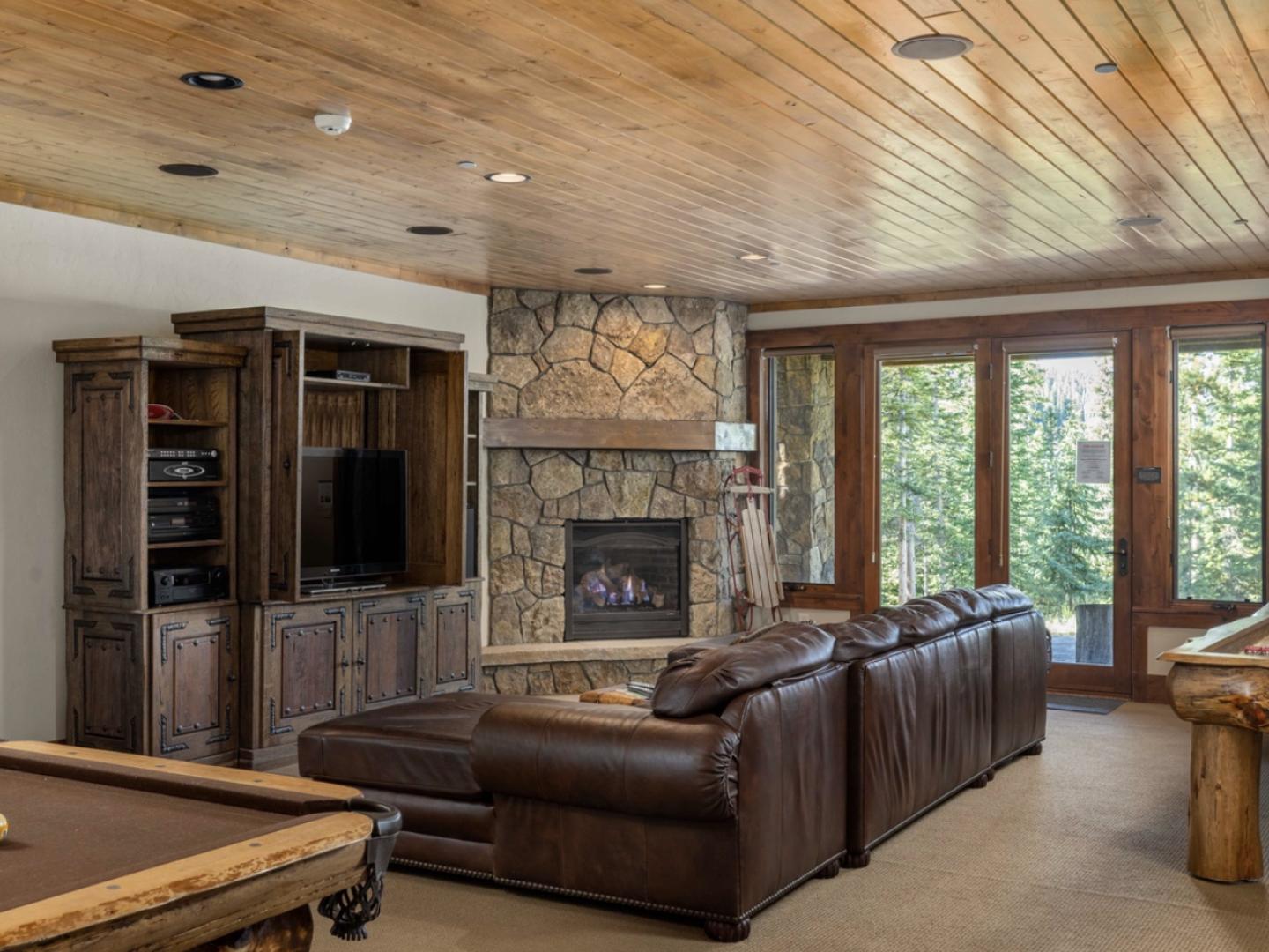 Downstairs, the lower-level game room is pure entertainment — large couch, shuffleboard, pool table, TV/entertainment system, a wet bar with three stools, and a full kitchenette. A private sauna adjoins this casual hangout for the ultimate post-adventure unwind.