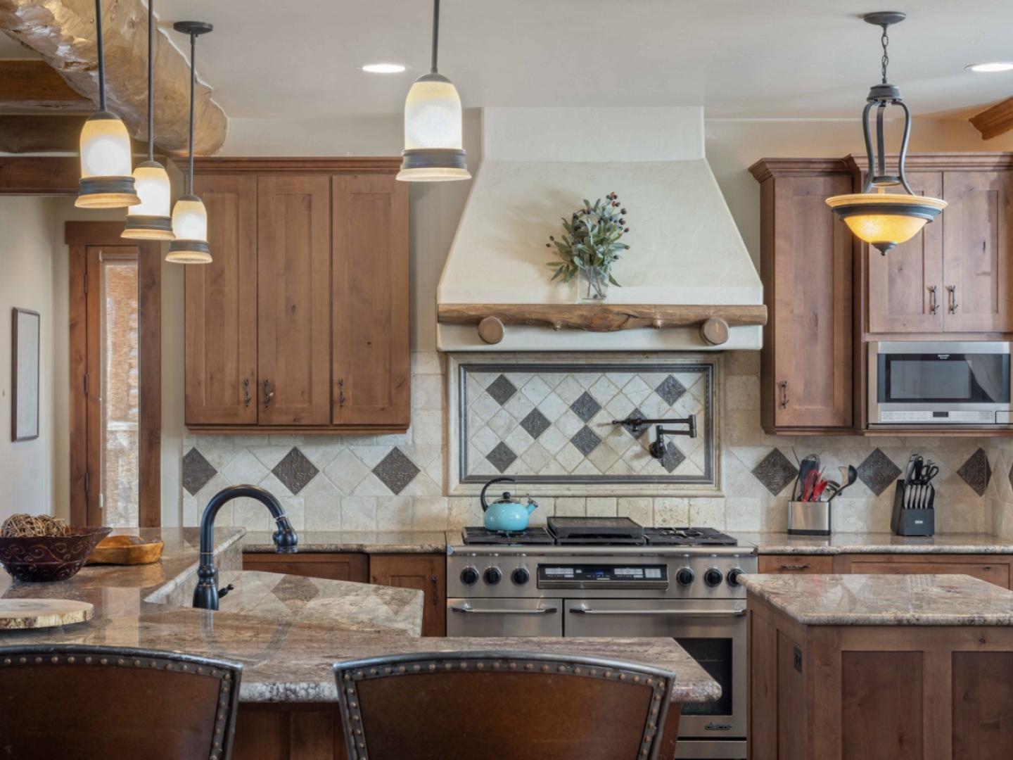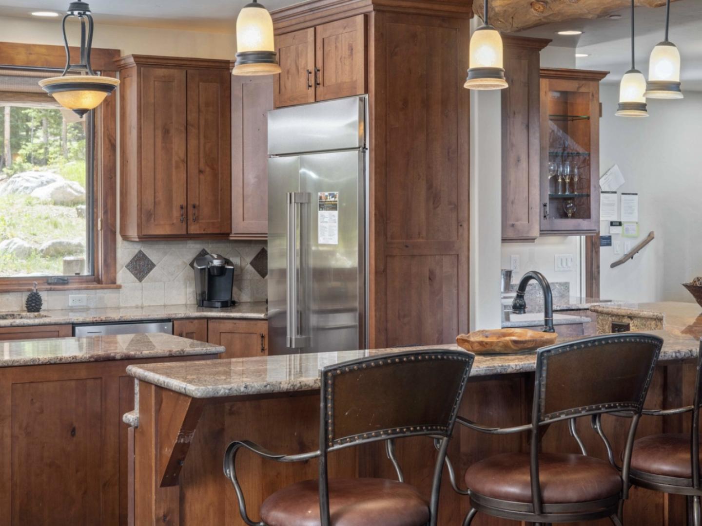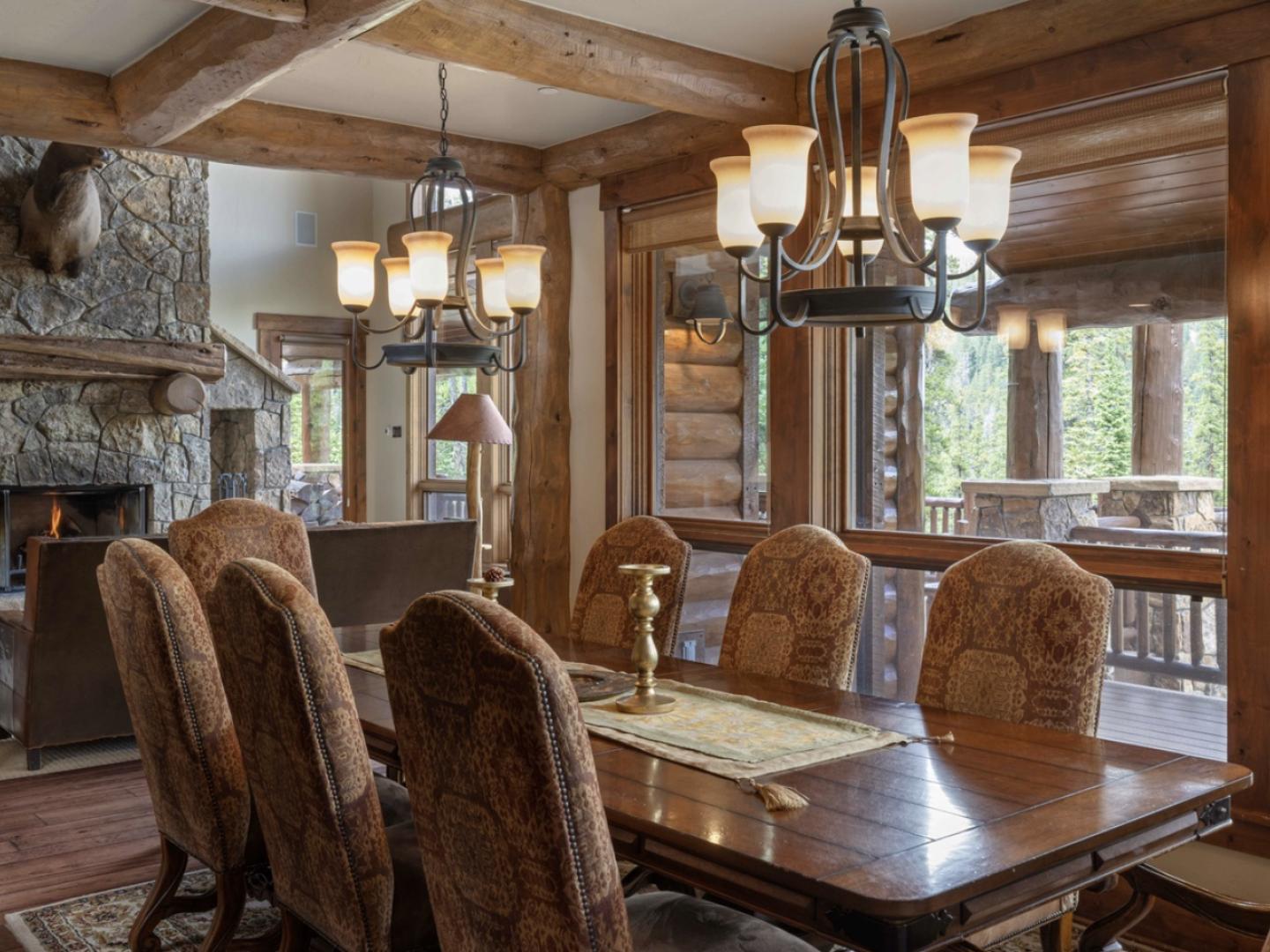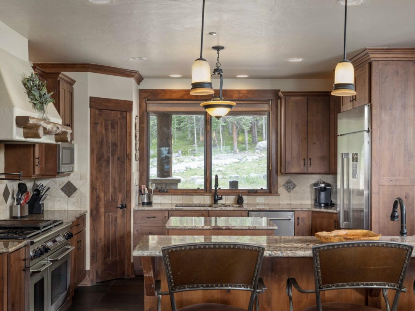 The chef-ready kitchen and adjoining dining room are made for gathering: a long wooden table seats eight in plush, high-back chairs while a granite breakfast bar adds seating for six. Wrought-iron chandeliers and rich wood details pay homage to Colorado’s Old West heritage, while the open plan keeps the entire group connected.