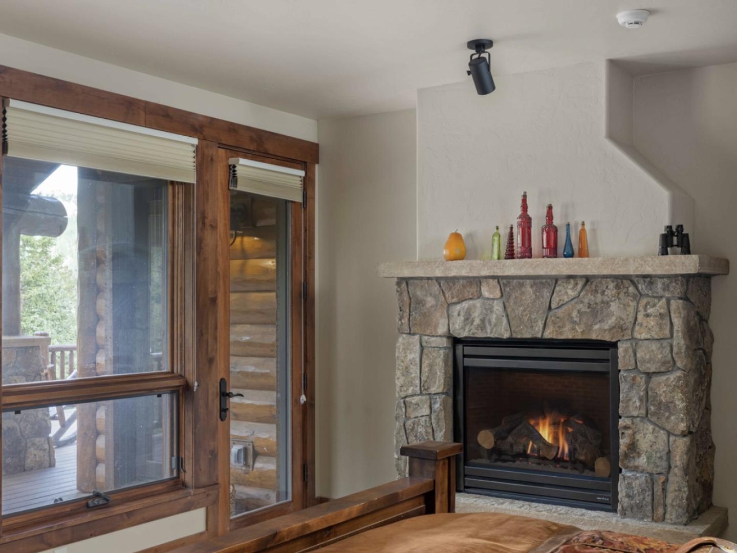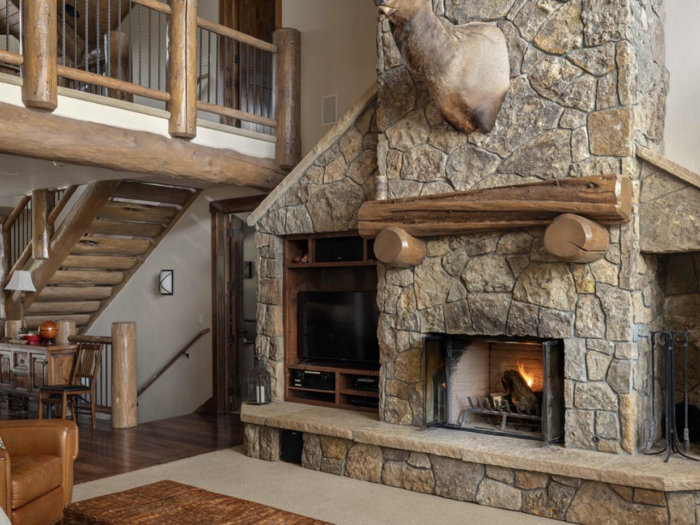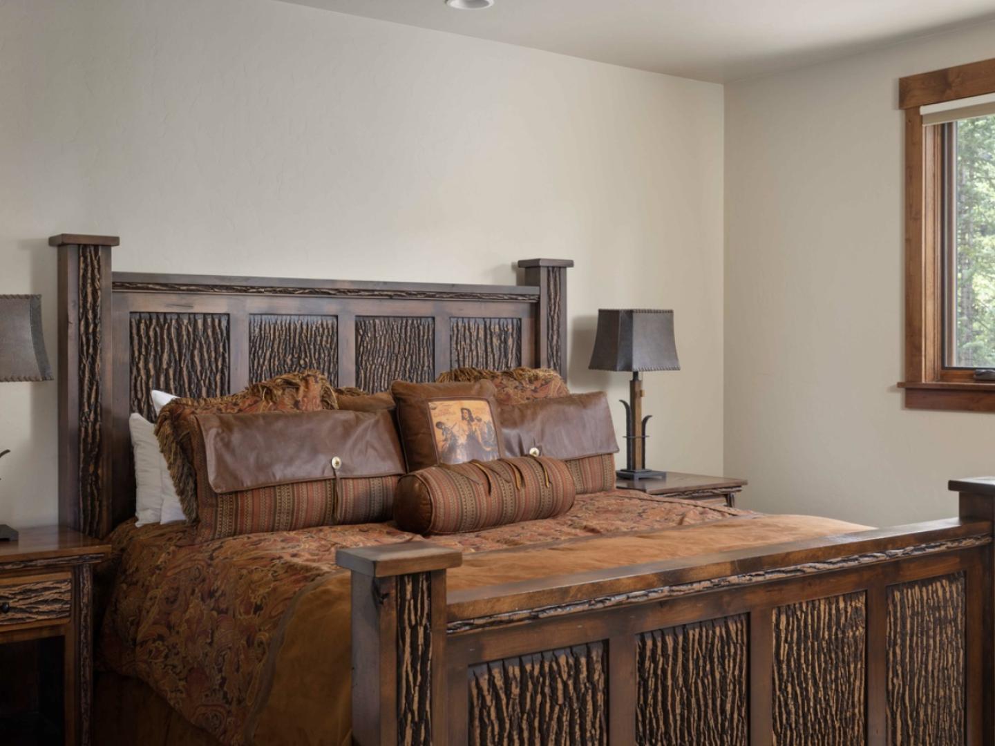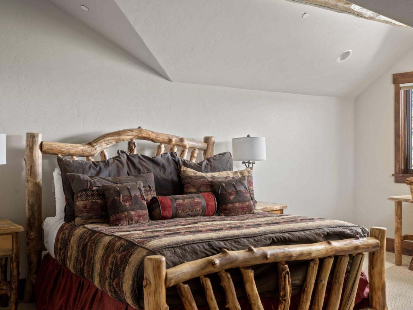The chef-ready kitchen and adjoining dining room are made for gathering: a long wooden table seats eight in plush, high-back chairs while a granite breakfast bar adds seating for six. Wrought-iron chandeliers and rich wood details pay homage to Colorado’s Old West heritage, while the open plan keeps the entire group connected.
