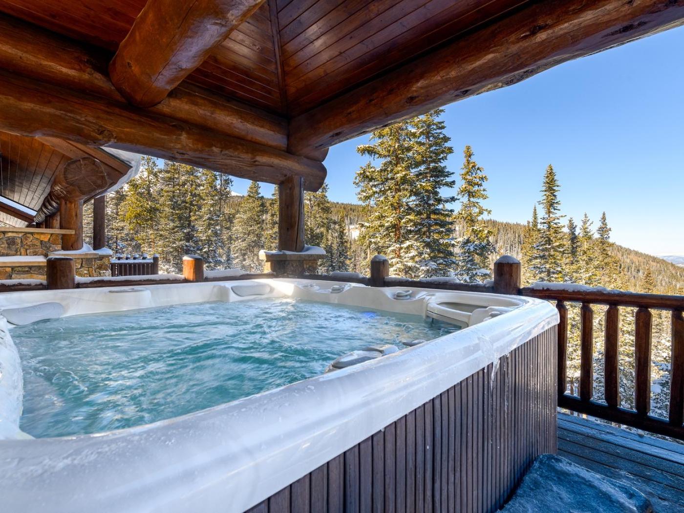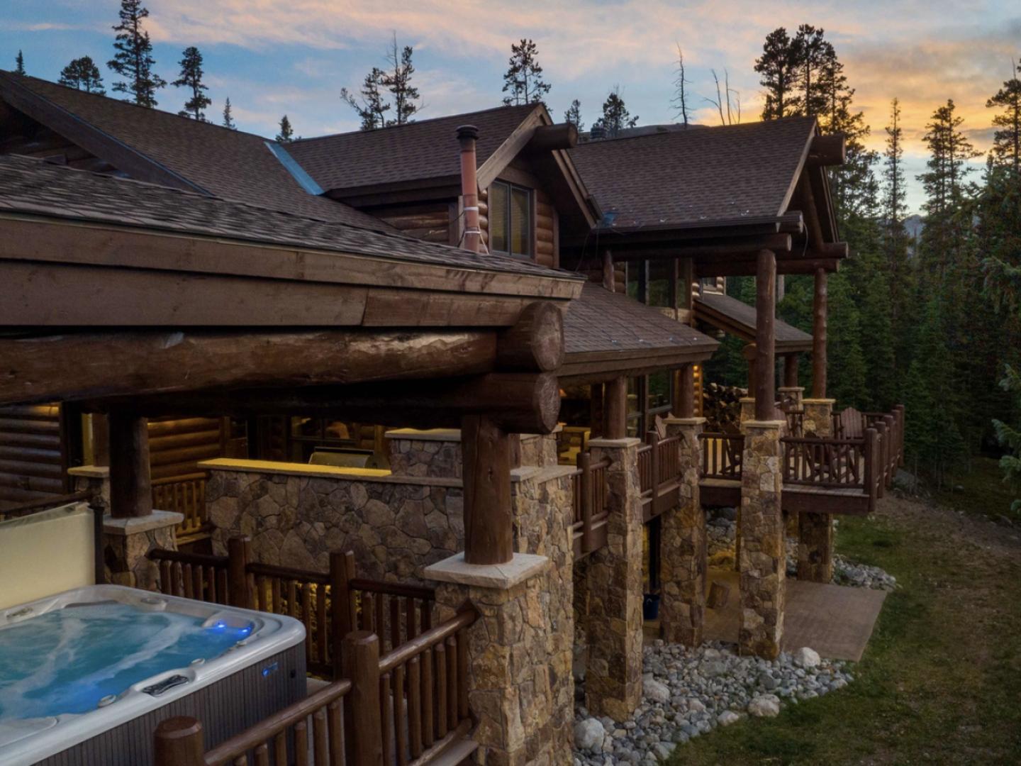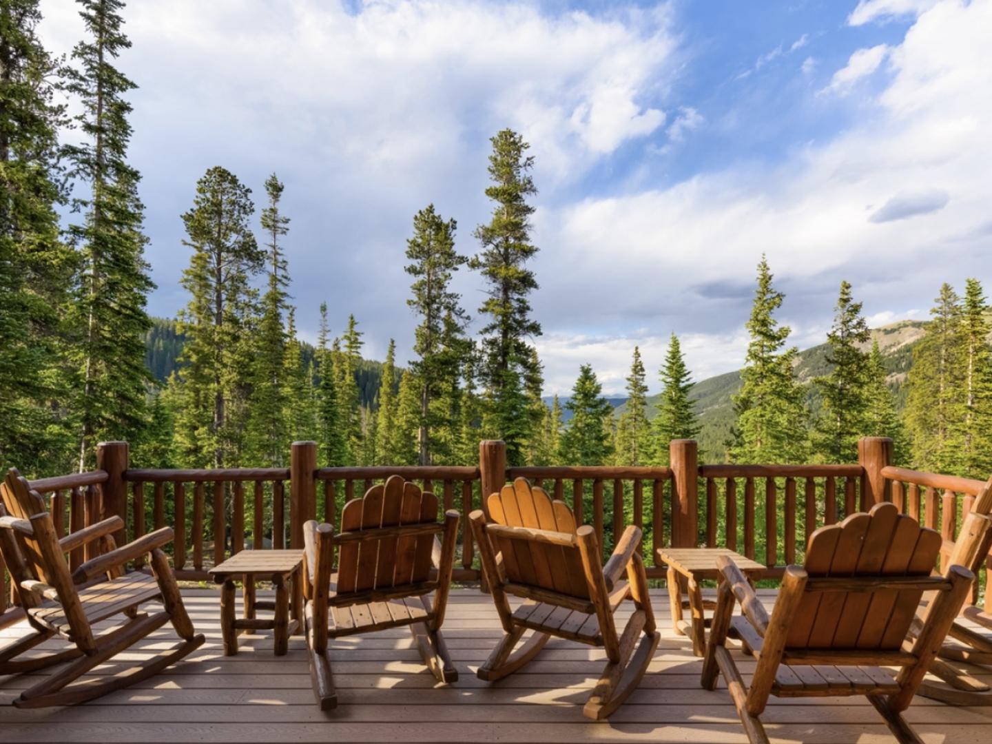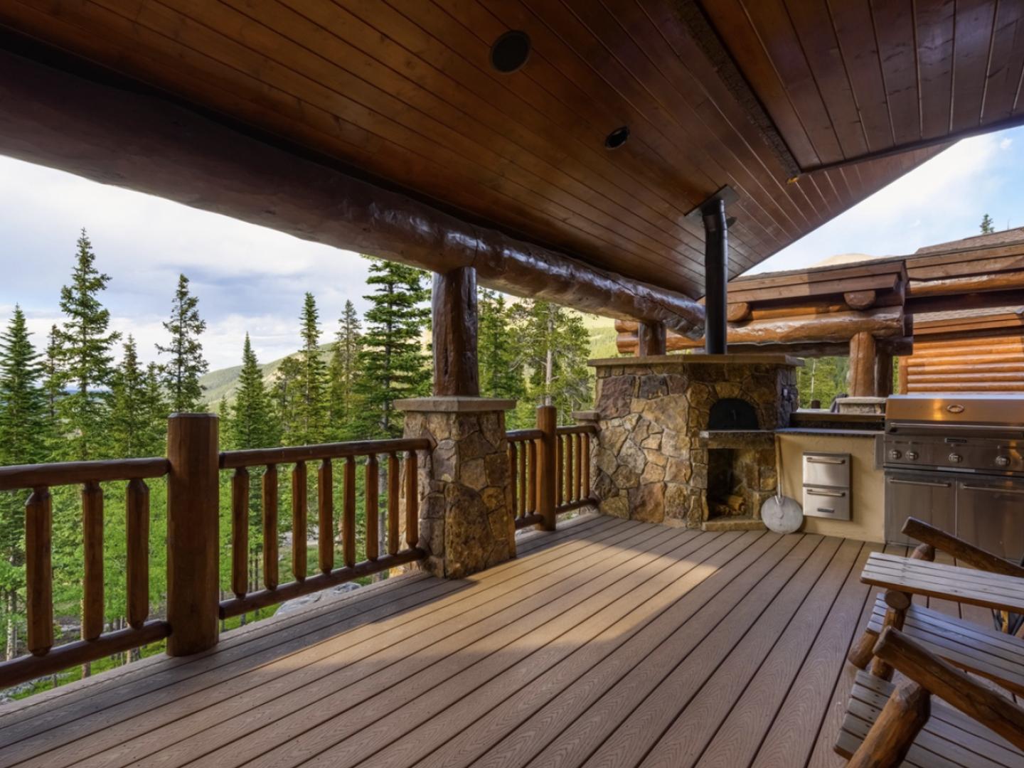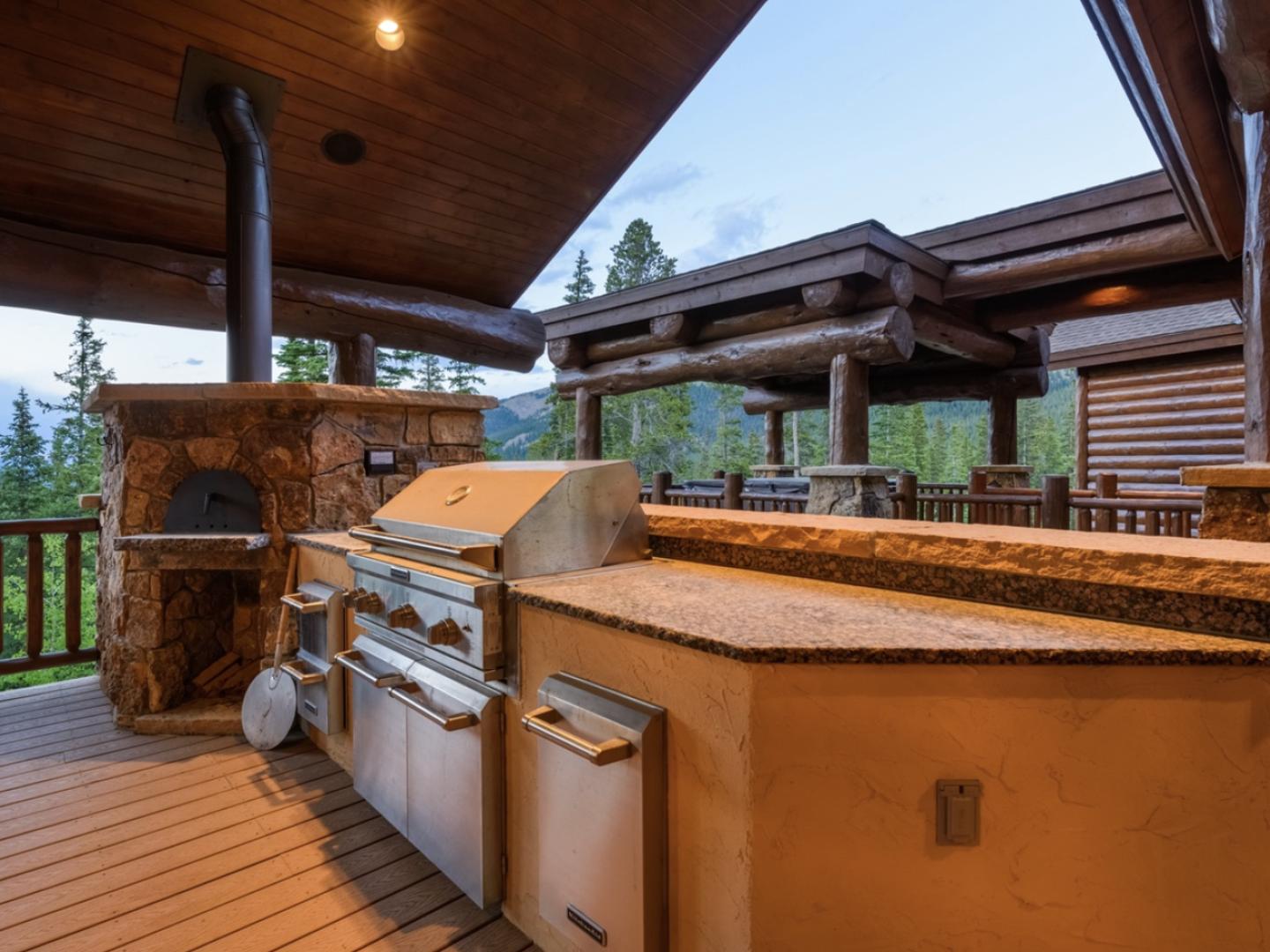 Outdoors, a breezeway to the garage doubles as an outdoor kitchen and lounge with a grill, stone pizza oven, and counter space — perfect for cookouts and relaxed evenings on the rocking chairs overlooking the mountains. The expansive backyard includes rustic stump seating and a hot tub set among the evergreens for quiet, starry-sky soaks.