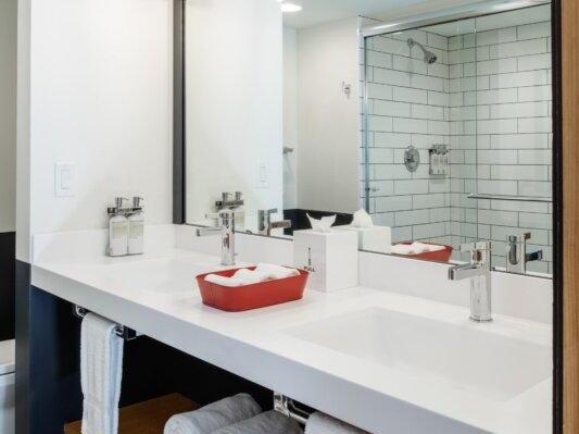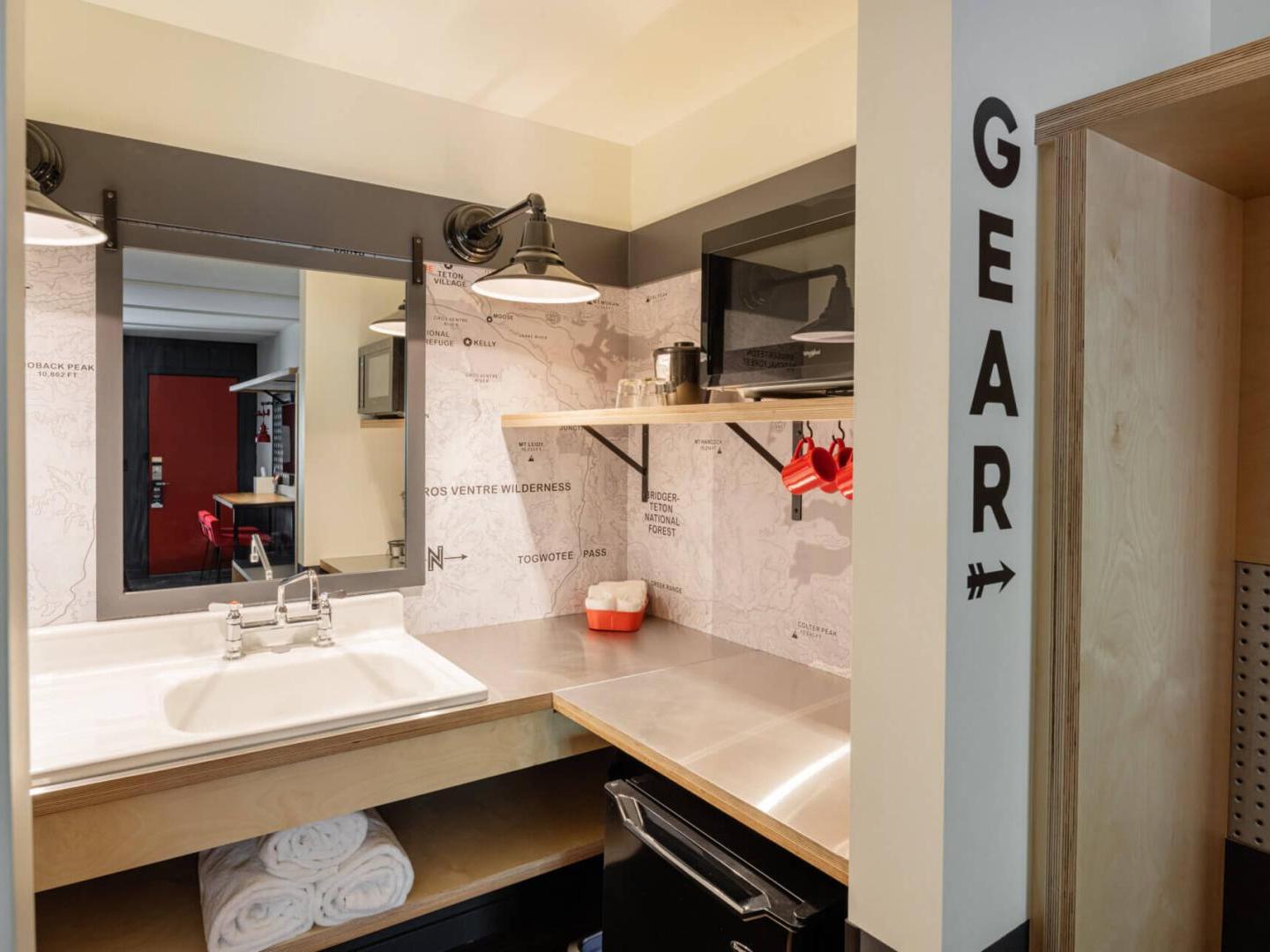 Deluxe Rooms with Platform Bunks: Designed like contemporary cabins, these 275 to 300 square foot guest rooms are both functional and restful. Choose from the Queen with Platform Bunk for a group of two or three, or the Deluxe Double Queen with Two Platform Bunks, that sleeps up to five people. Each cozy retreat boasts a mini fridge and microwave, with ample space to store everyone’s gear.
