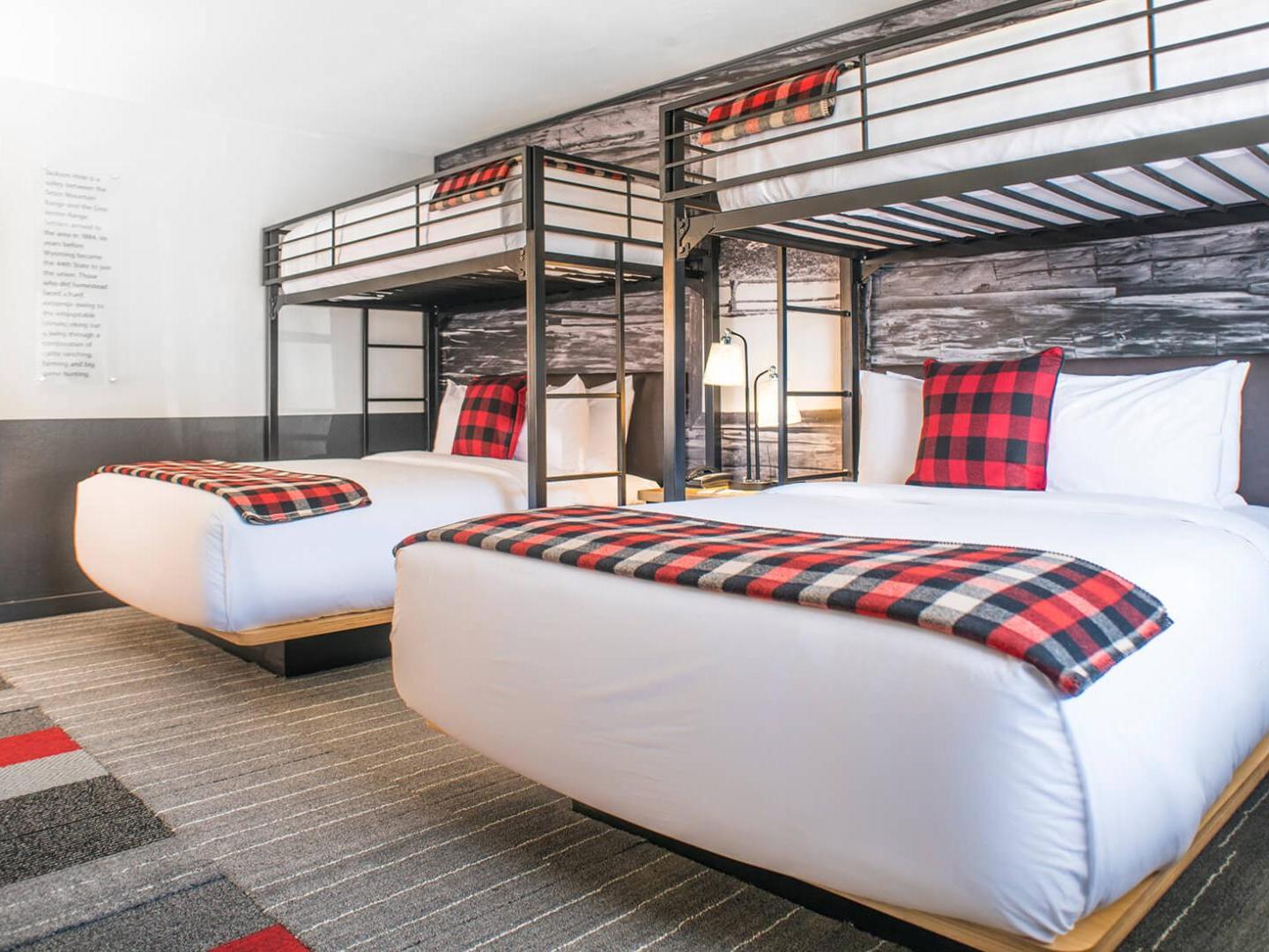 Two Queen Room with Two Twin Bunks sleep up to 6 and offer two queen beds and two twin sized bunk beds and include a full bath, air conditioning, coffee maker, mini fridge, microwave, as well as ample storage for your gear and all of our thoughtful amenities.