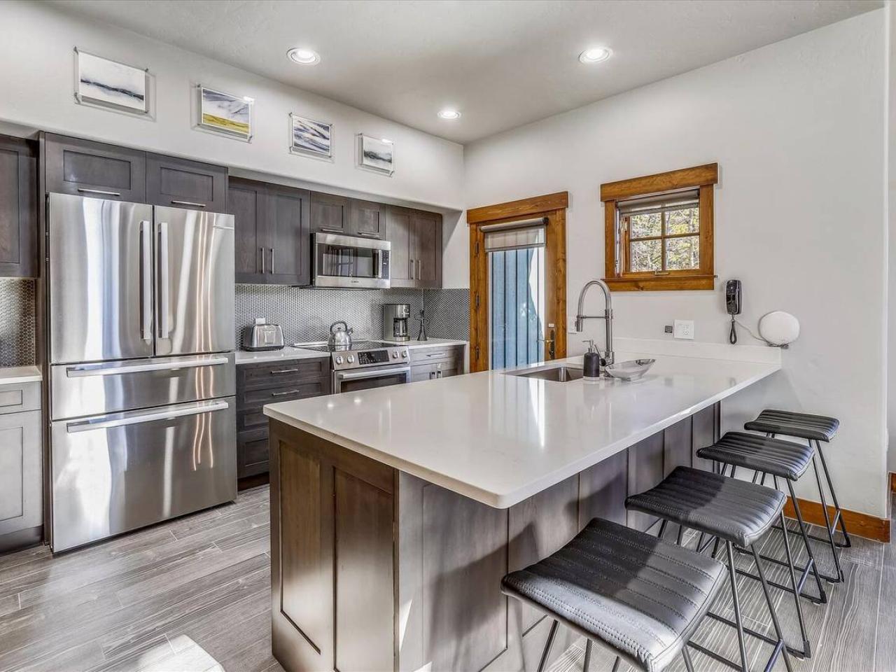 Two-Bedroom Townhome-Offering one-story of luxury, the two-bedroom townhomes feature a private entrance and a private garage. The spacious living rooms boast vaulted ceilings and cozy seating. Adjacent you will find a full gourmet kitchen with stainless steel appliances and a breakfast bar. With a master suite, two full bathrooms and a sleeper sofa, these spacious rentals are nicely equipped to accommodate up to six guests.