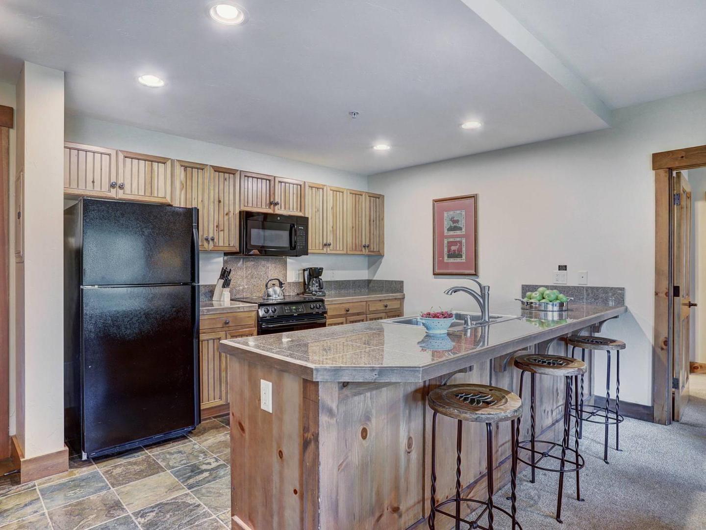 One-Bedroom Condominium- Up to four guests can sleep comfortably in these 700 square foot rentals. A sleeper sofa is located in the living area featuring a large screen television and cozy seating. The full kitchen offers granite countertops and a breakfast bar and an adjacent dining area boasts a table to enjoy meals or snacks.