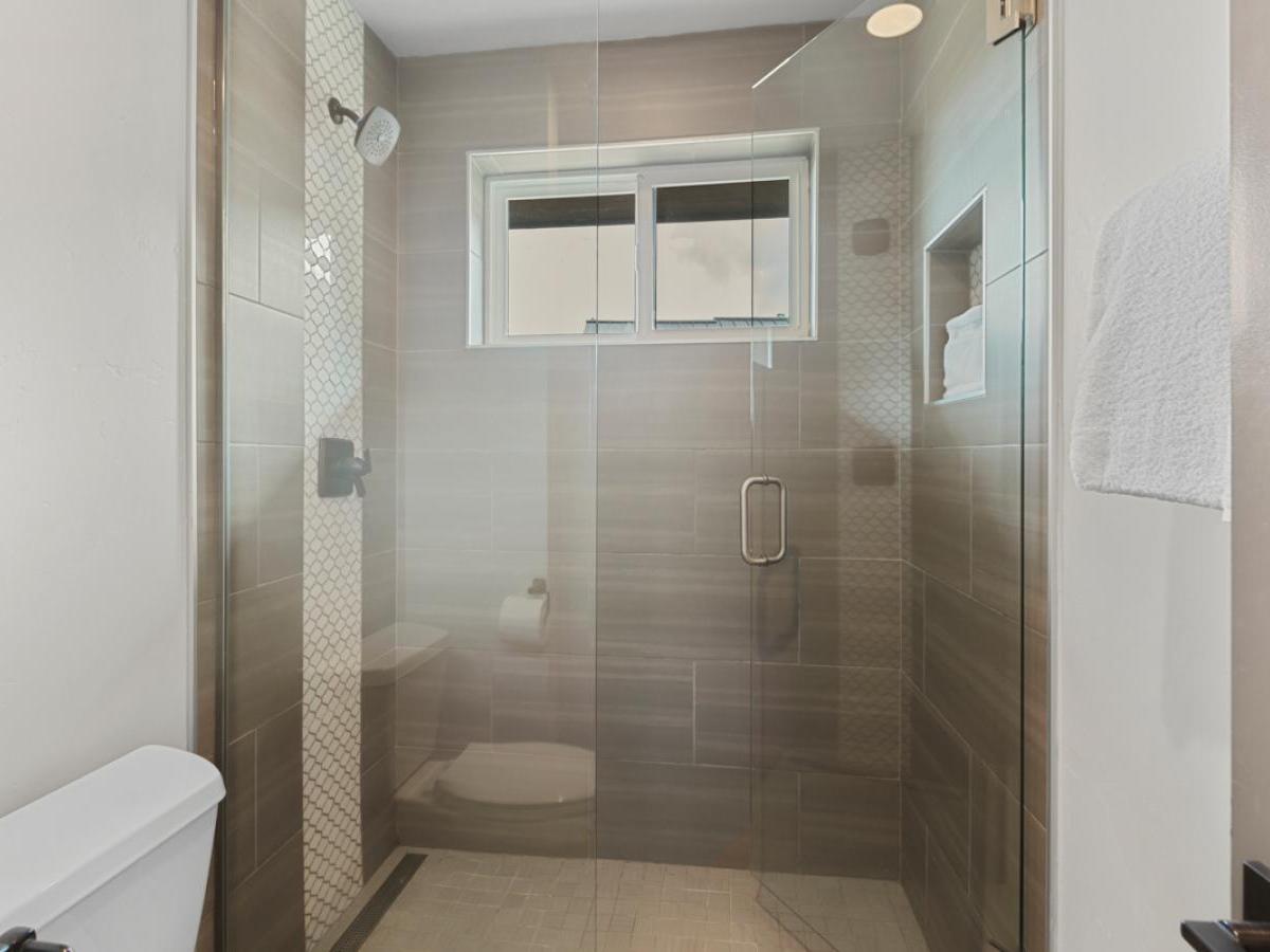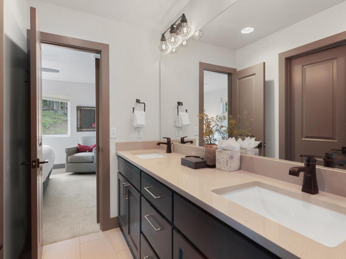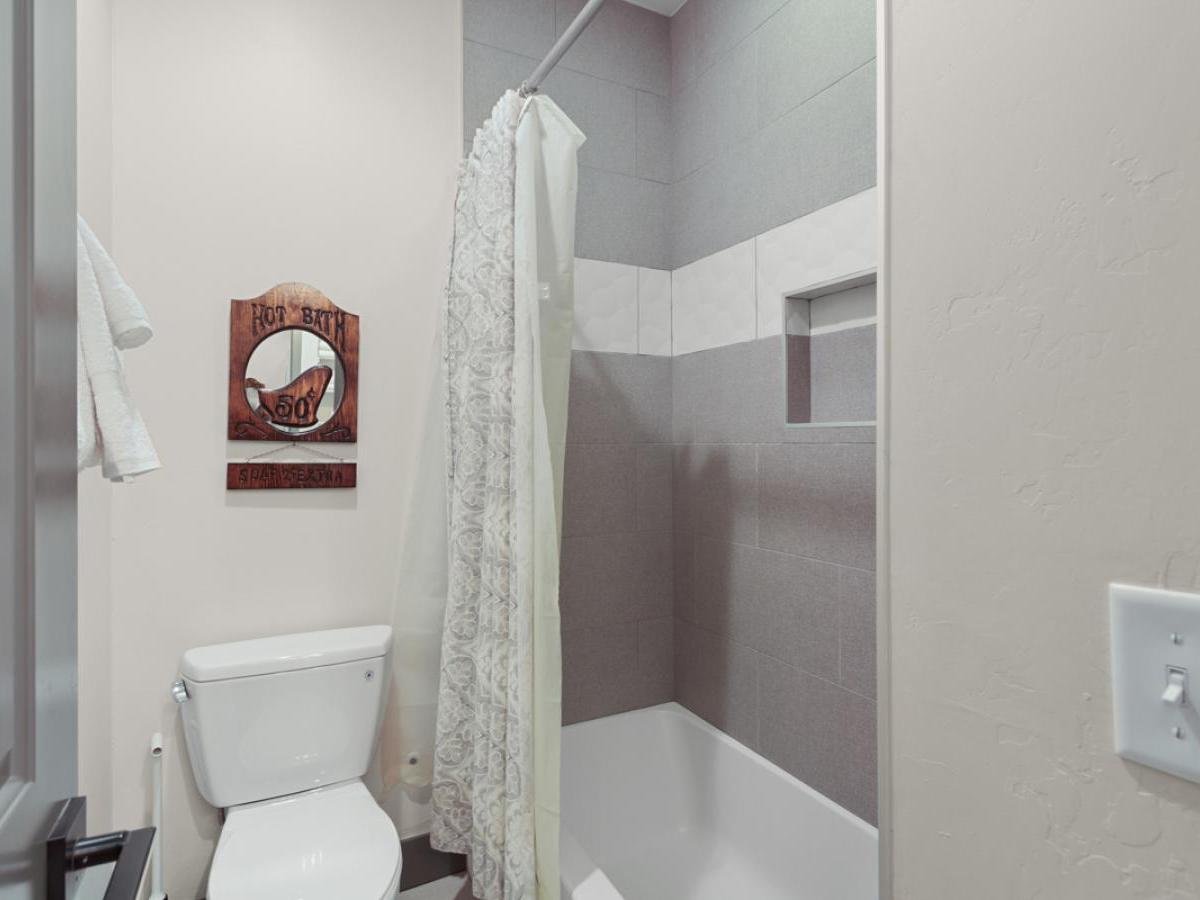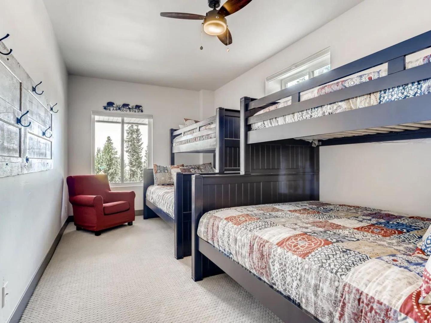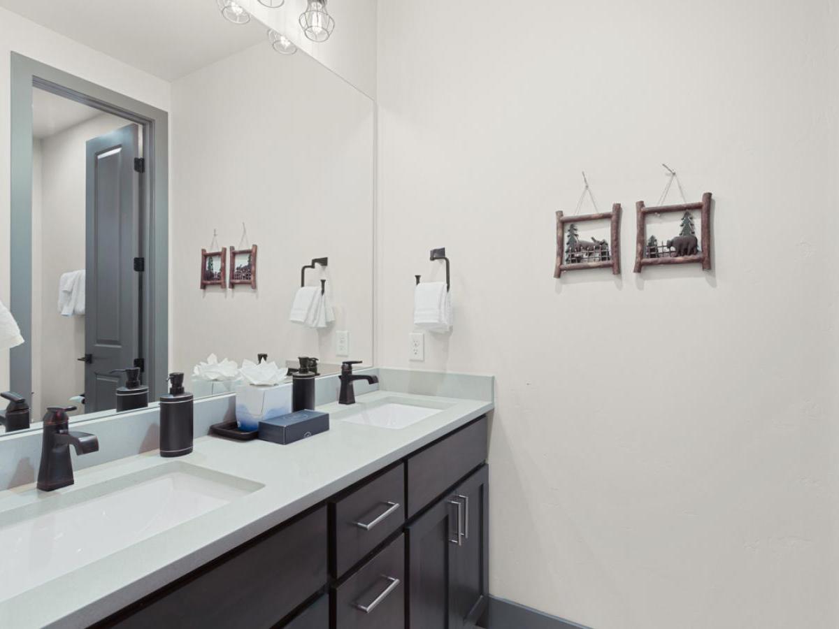 Located on the main level, the primary bedroom is appointed with a King bed, private deck and private bathroom with a dual-sink vanity and walk-in shower with a soaking tub. Furnished with two sets of Twin over Twin bunk beds, the lower level guest bedroom shares a bathroom with the game area. Two upper level bedrooms are equipped with King beds and enjoy private bathrooms.