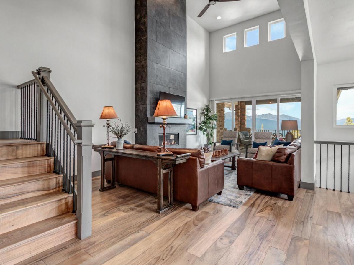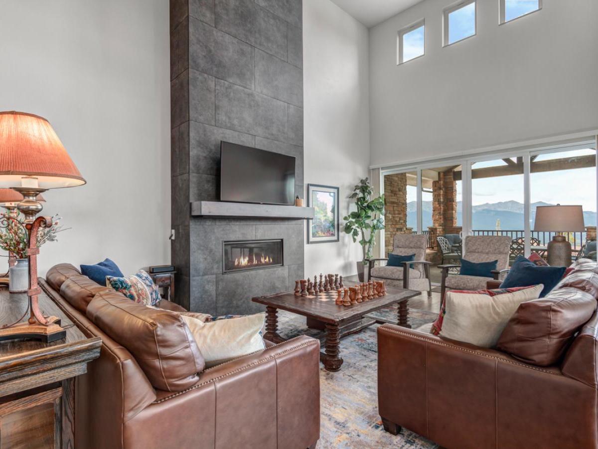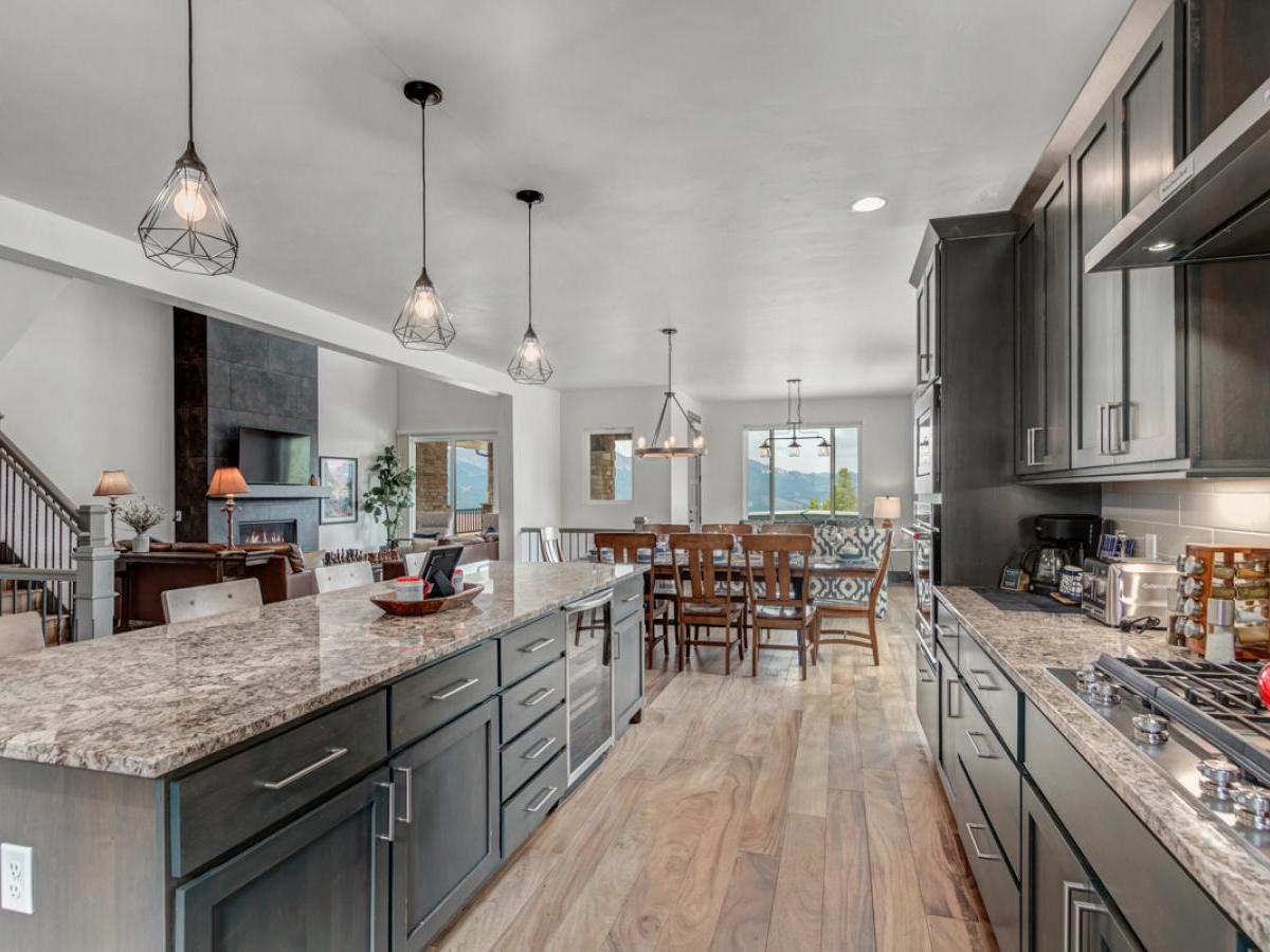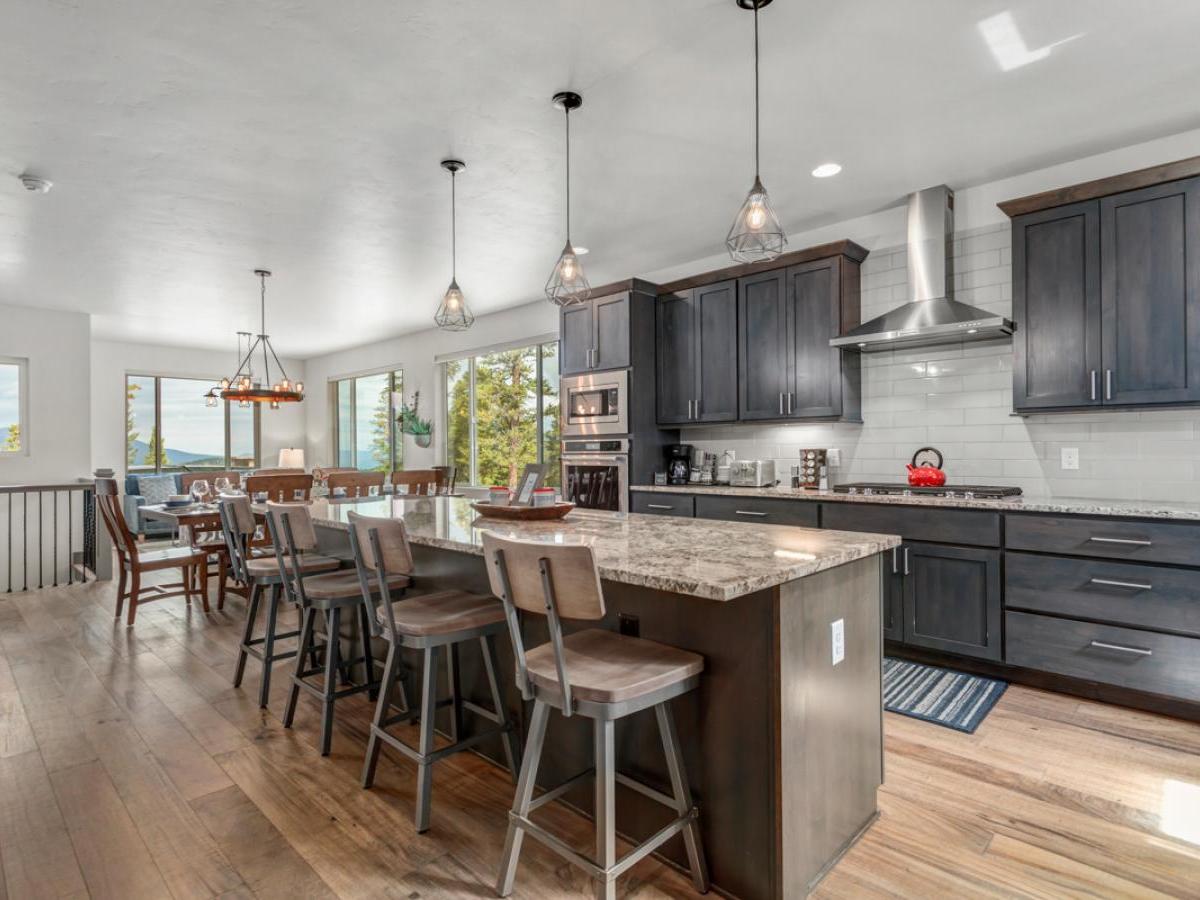 Two-story vaulted ceilings and a wall of windows, showcasing breathtaking mountain views, frame the living room of this 4 bedroom, 3.5 bathroom duplex vacation home offering leather furnishings centered on a gas fireplace set beneath a wall-mounted television. This space flows seamlessly to the dining area with seating for 8 guests and the gourmet kitchen appointed with granite countertops, high-end appliances, and a wine cooler—plus an expansive 4-seat breakfast bar for prepping meals or making cocktails. Off of the kitchen is a den space with 2 blue accent chairs and a couch.
