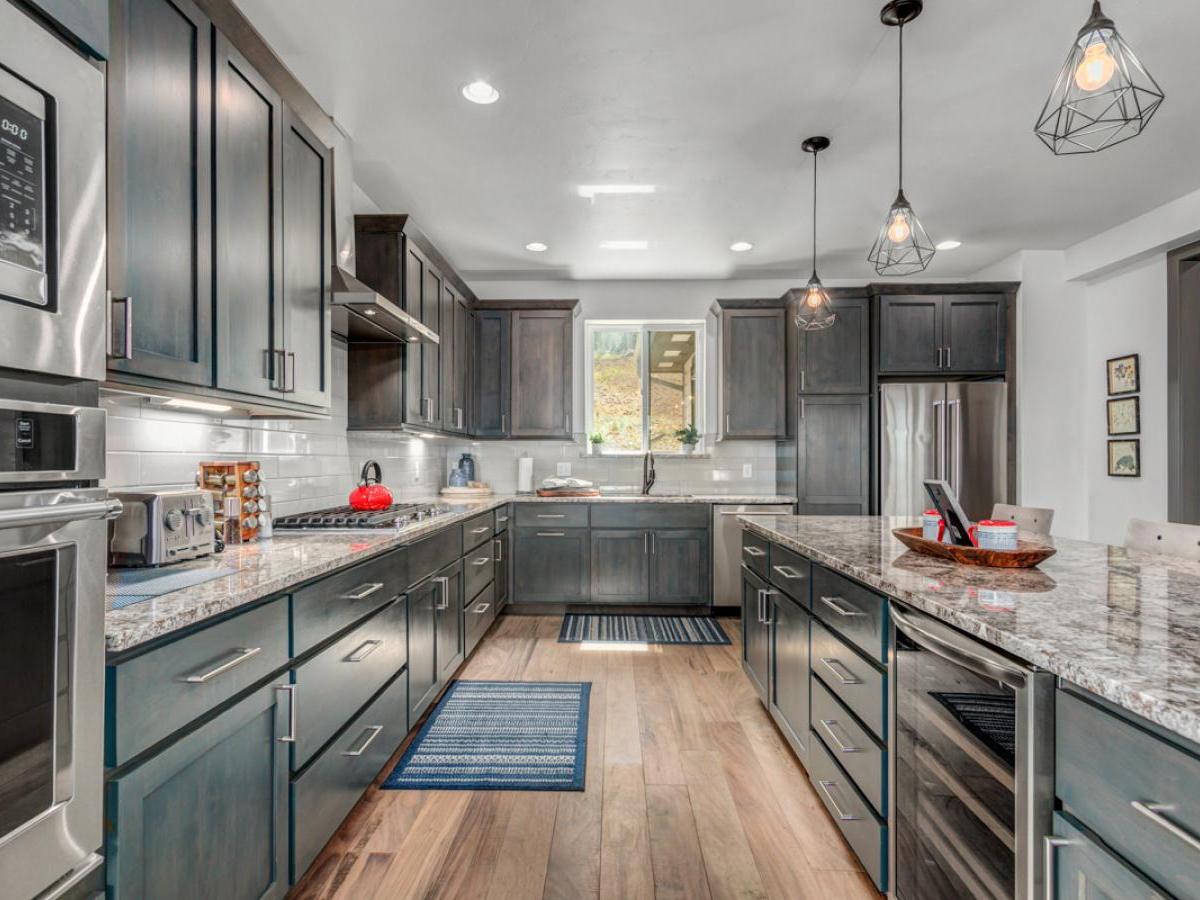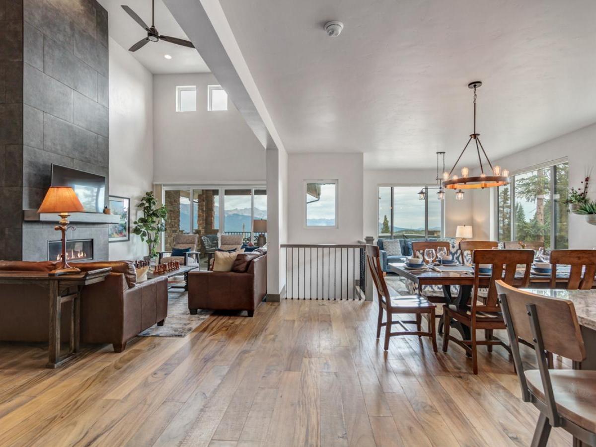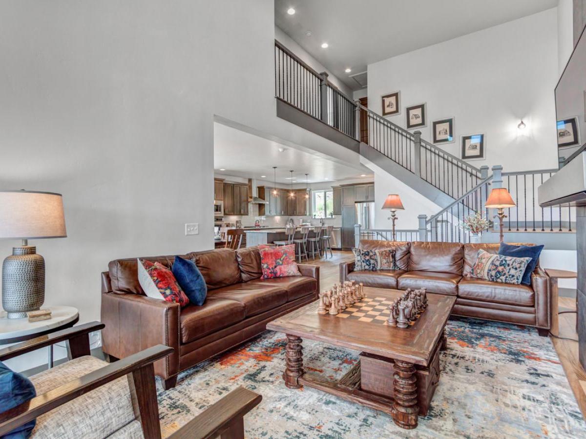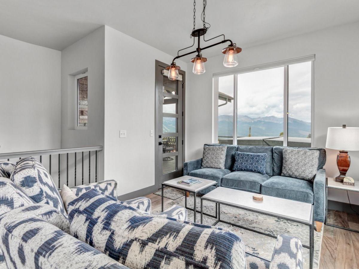 Two-story vaulted ceilings and a wall of windows, showcasing breathtaking mountain views, frame the living room of this 4 bedroom, 3.5 bathroom duplex vacation home offering leather furnishings centered on a gas fireplace set beneath a wall-mounted television. This space flows seamlessly to the dining area with seating for 8 guests and the gourmet kitchen appointed with granite countertops, high-end appliances, and a wine cooler—plus an expansive 4-seat breakfast bar for prepping meals or making cocktails. Off of the kitchen is a den space with 2 blue accent chairs and a couch.
