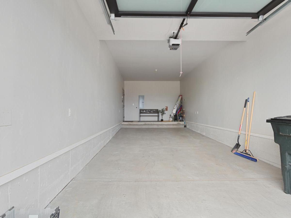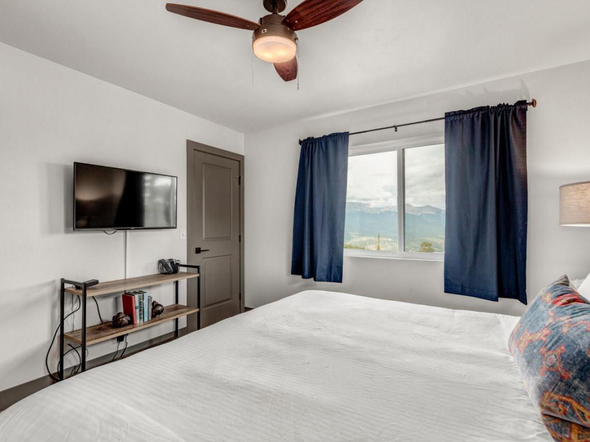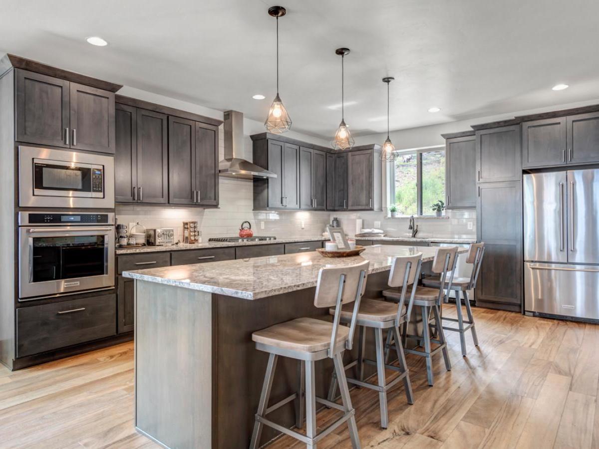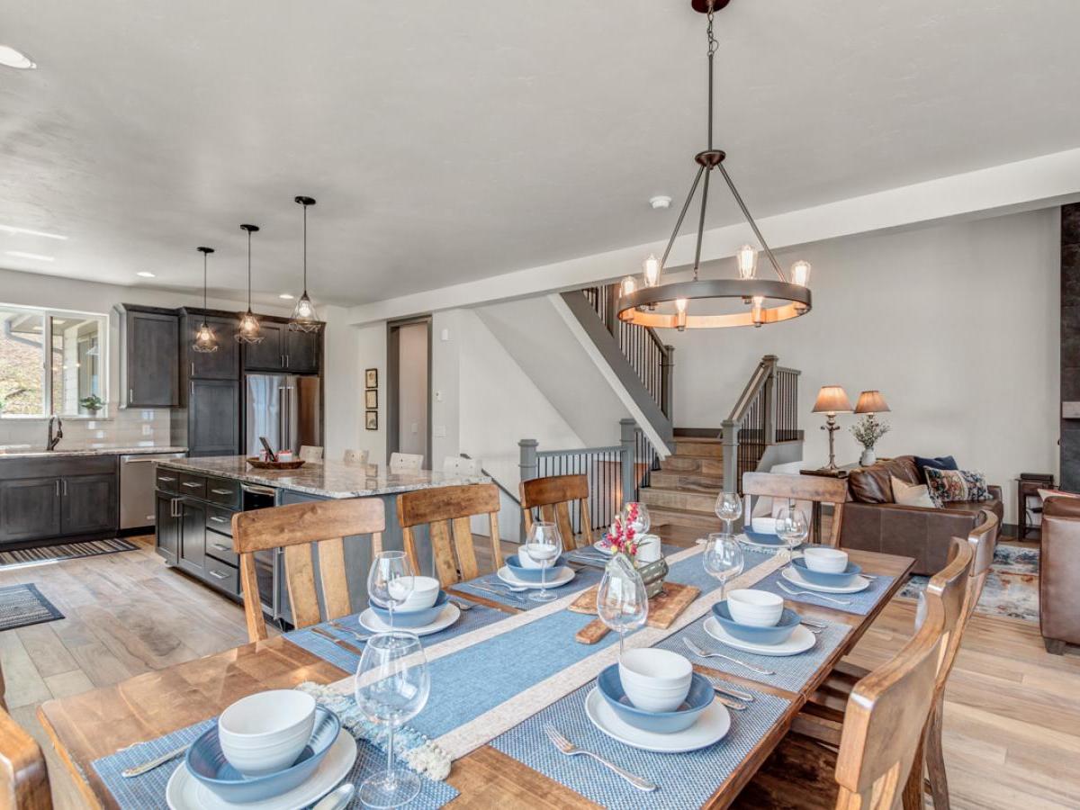 Two-story vaulted ceilings and a wall of windows, showcasing breathtaking mountain views, frame the living room of this 4 bedroom, 3.5 bathroom duplex vacation home offering leather furnishings centered on a gas fireplace set beneath a wall-mounted television. This space flows seamlessly to the dining area with seating for 8 guests and the gourmet kitchen appointed with granite countertops, high-end appliances, and a wine cooler—plus an expansive 4-seat breakfast bar for prepping meals or making cocktails. Off of the kitchen is a den space with 2 blue accent chairs and a couch.