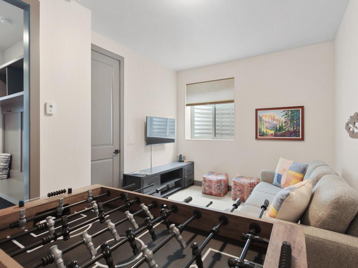 Step outside to the covered deck to grill up a meal on the barbecue, indulge in an alfresco meal around the 6-seat table, soak in the private hot tub, or simply take in the ski-slope view! Located on the entry level off of the gear area is a game room with a sofa set in front of a wall-mounted television and a Foosball table.