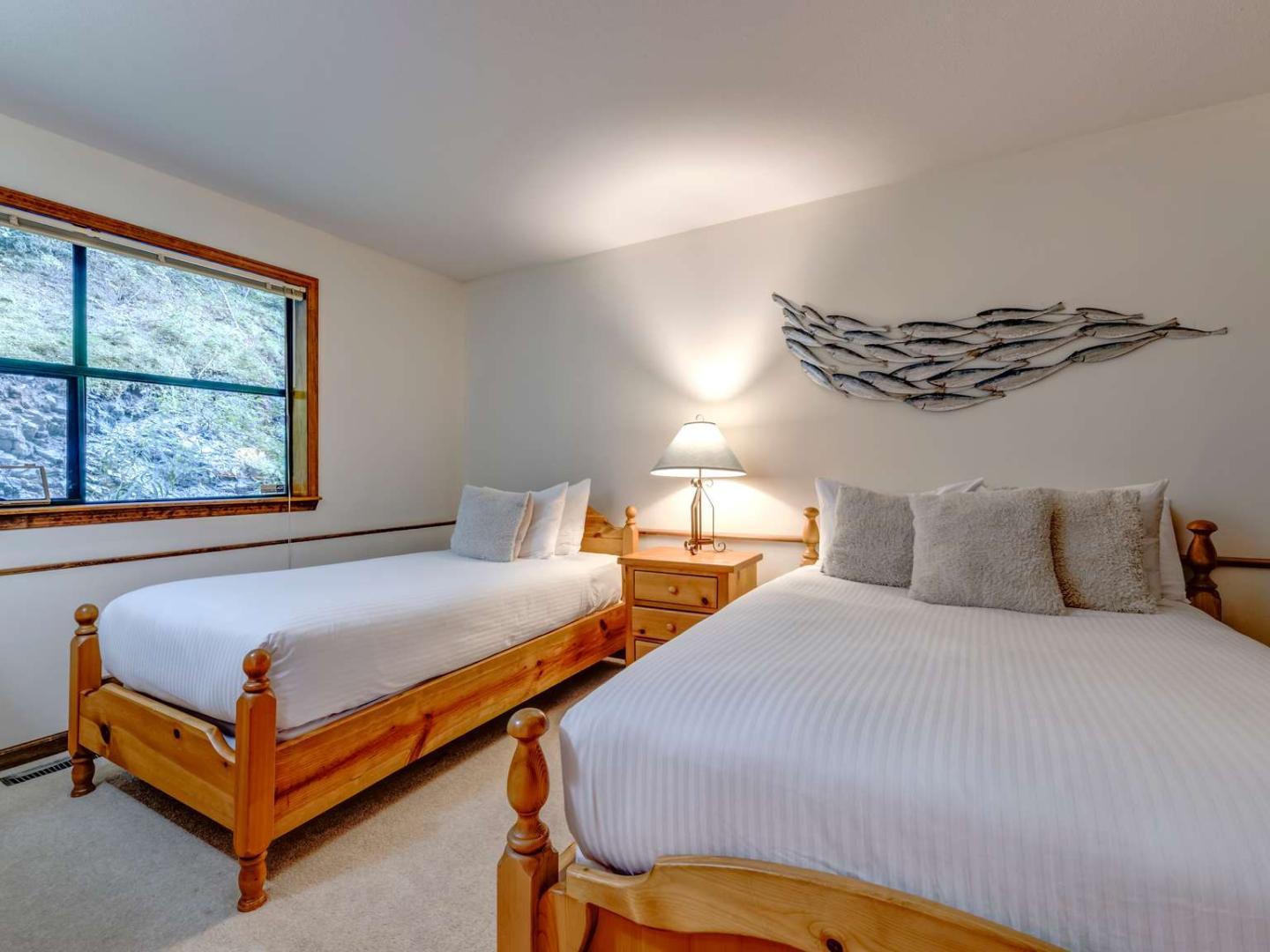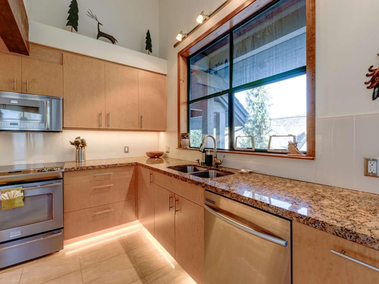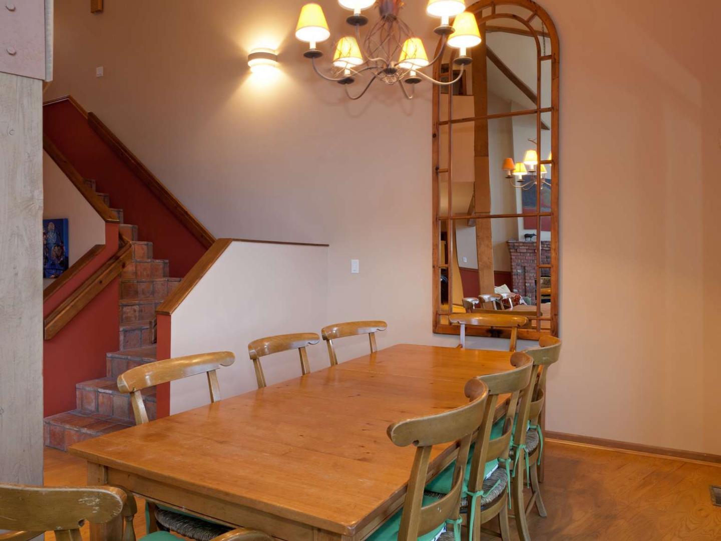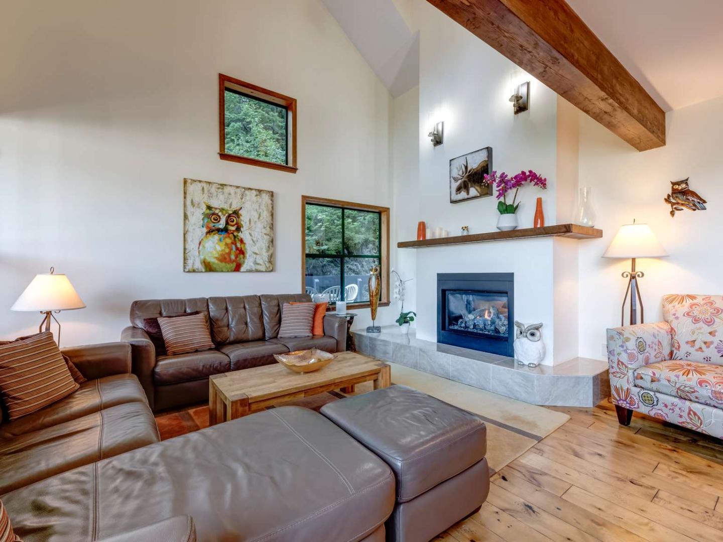 Comfortably furnished and open, the main level Great Room of the Northern Lights Townhomes incorporate a living room, kitchen and dining area into a space that is inviting for the entire group to entertain. Quality furnishings are set in front of a stone fireplace and under vaulted ceilings in the living room which is framed by large windows exposing breathtaking views of the surrounding mountains. Bedrooms are distributed over the multiple levels of the spacious units providing an added level of privacy for guests wanting some time away from the group. Most Northern Lights units feature a second living area or den and many include a private hot tub on the deck.