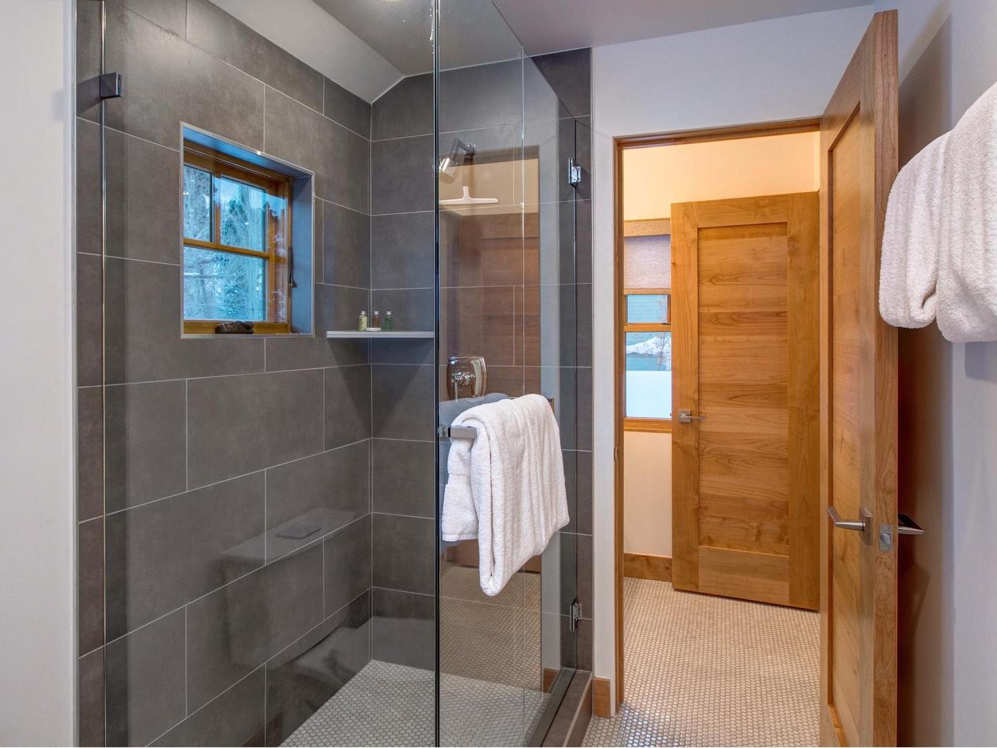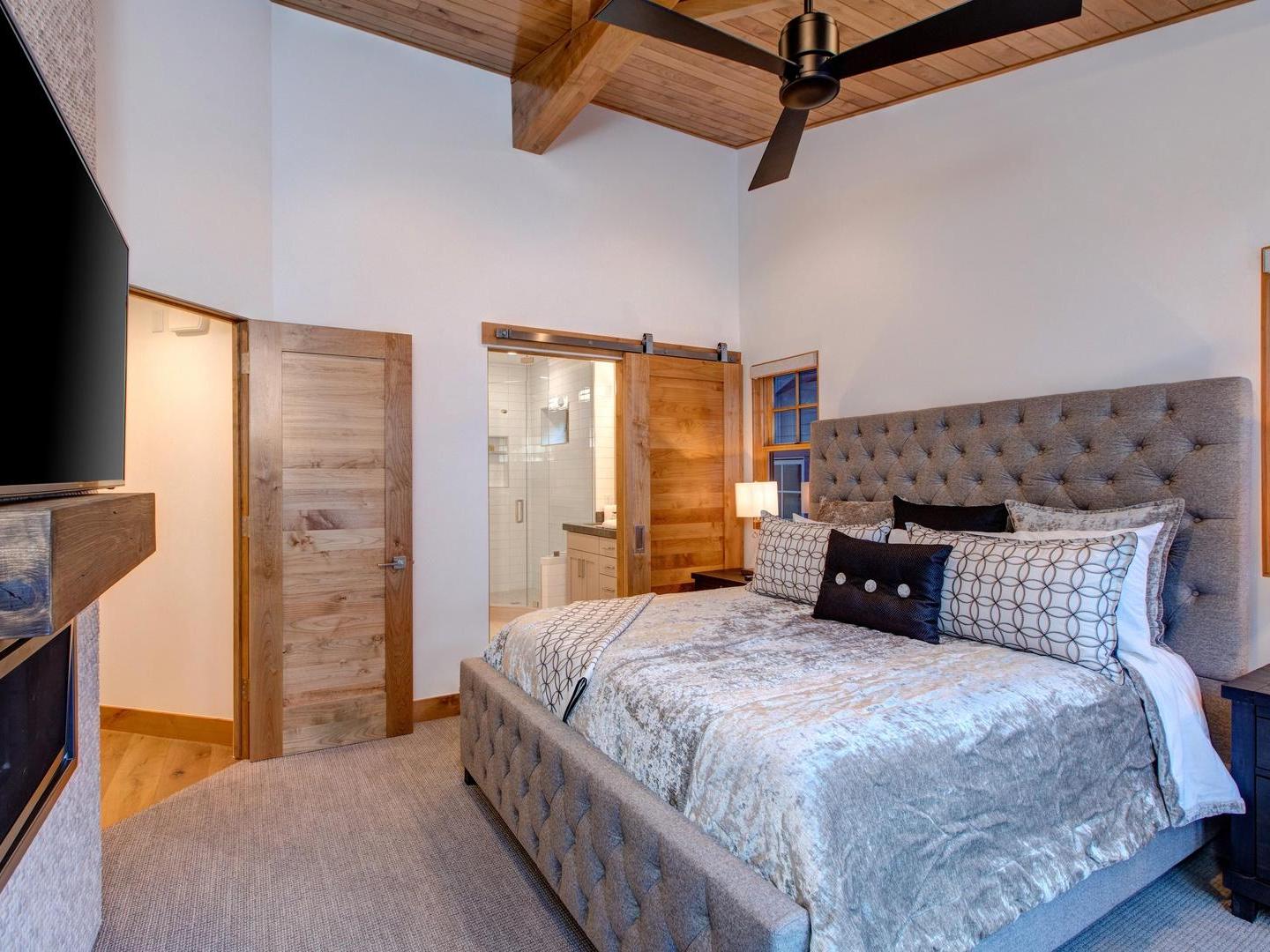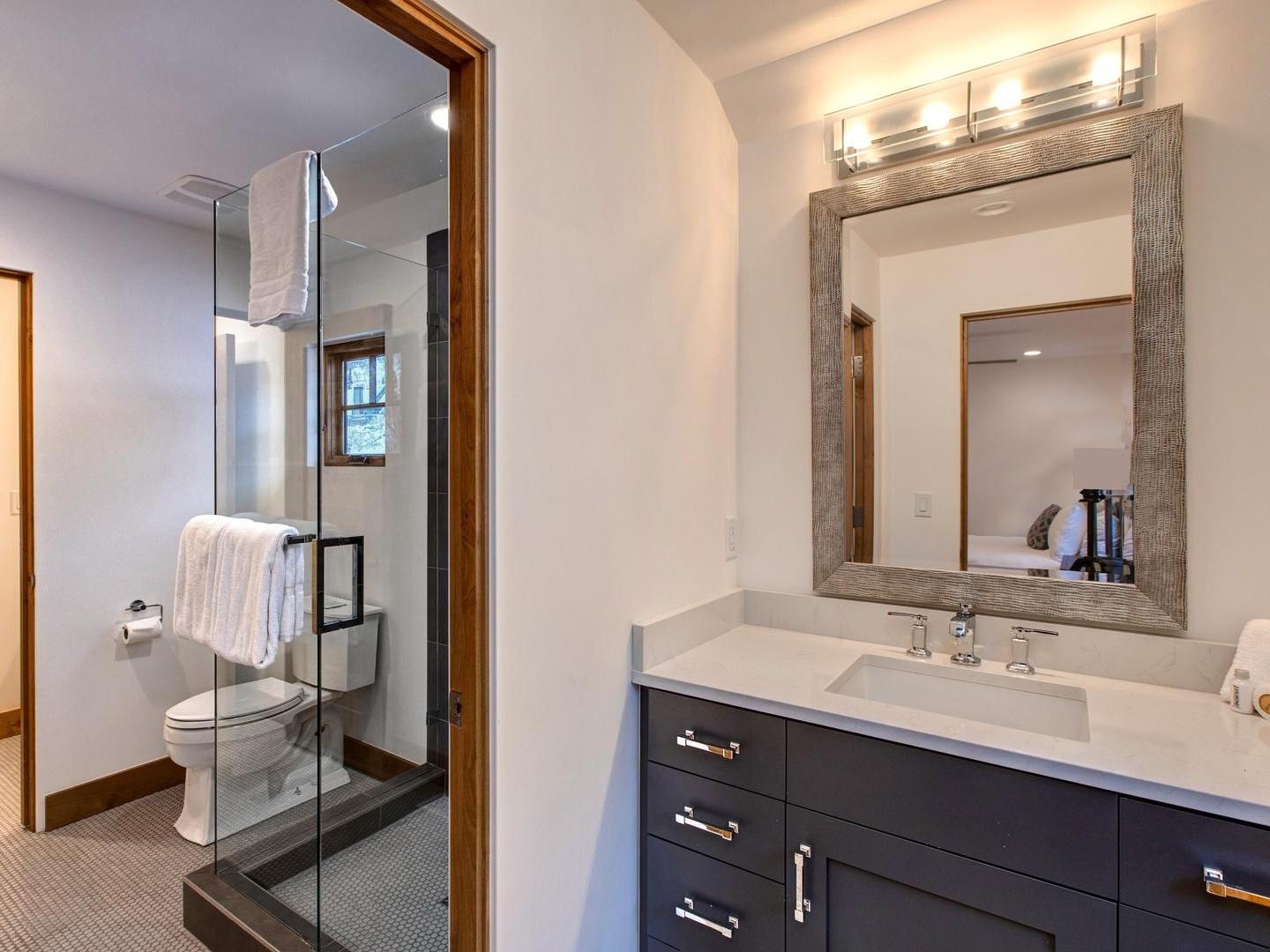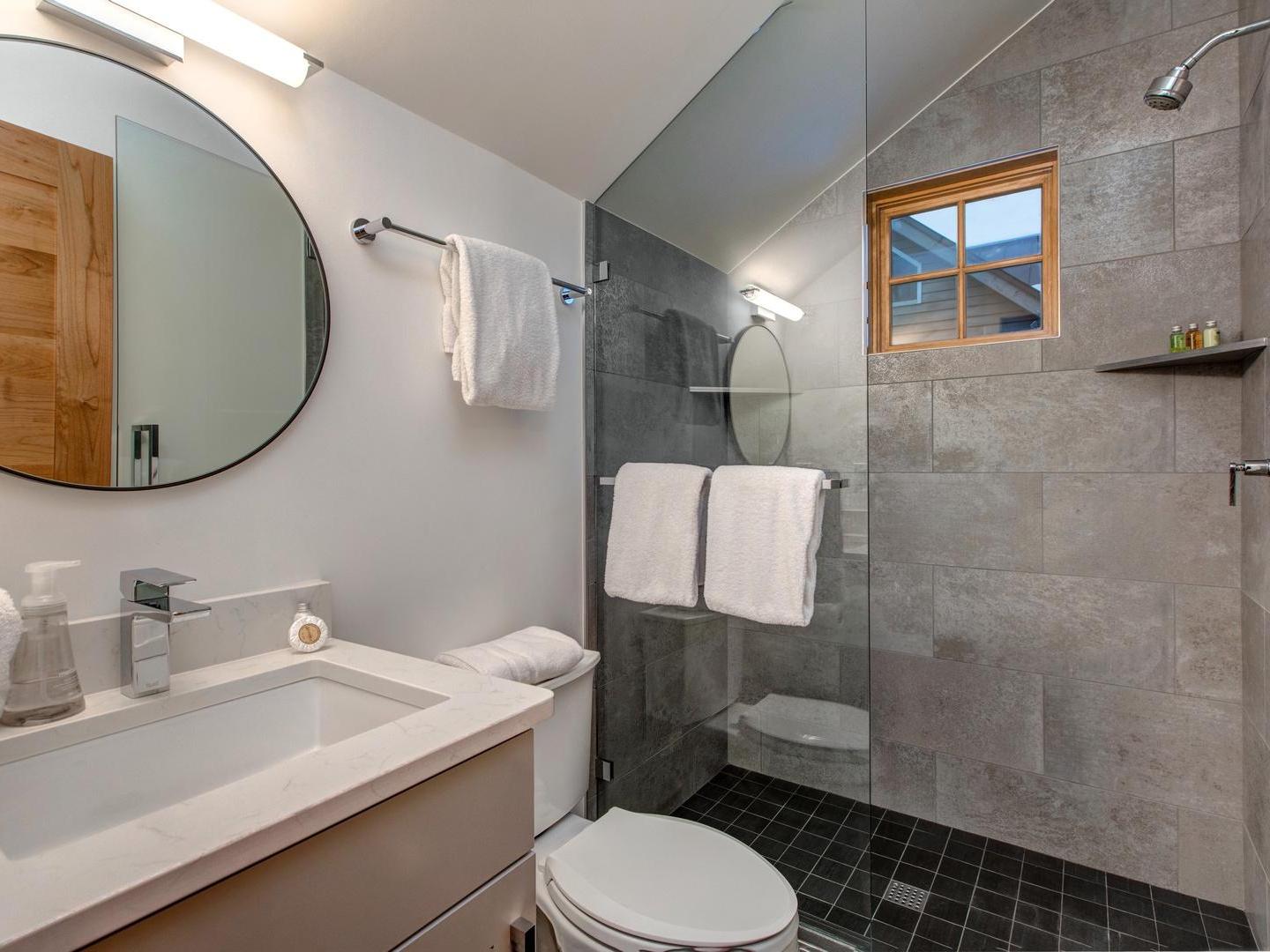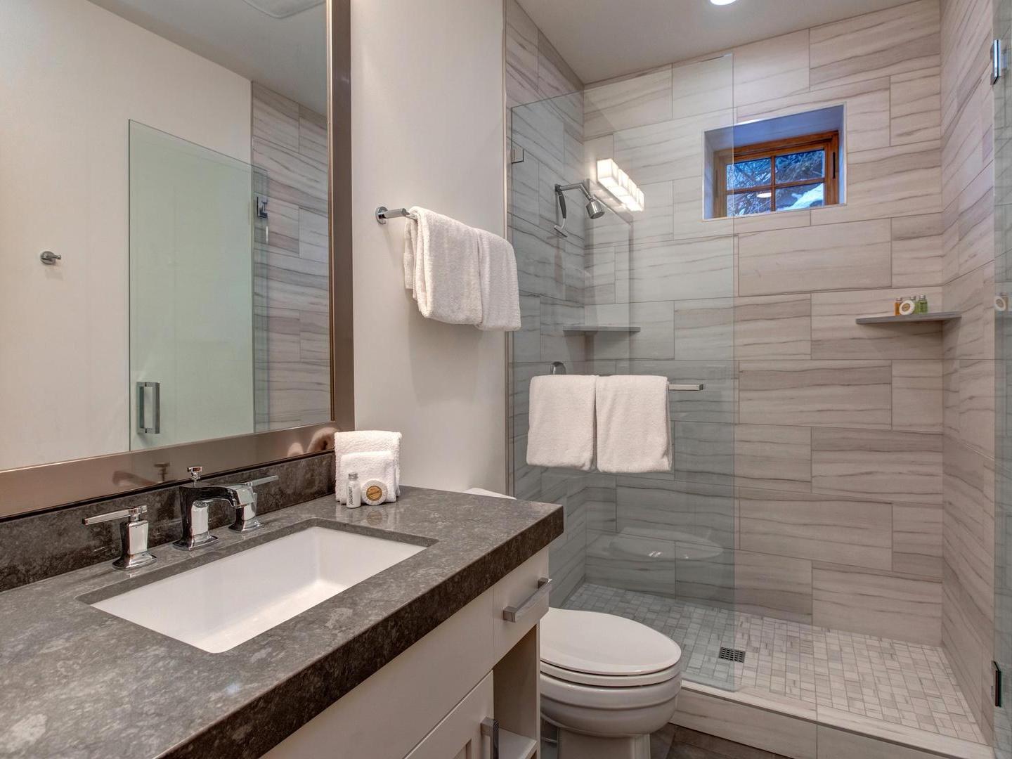 Six bedrooms are split between the second and third level of the home with 3 on each floor. Level two is home to the primary suite offering a King bed, gas fireplace, private deck, and private bathroom with a soaking tub and steam shower. One of the guest bedrooms on this level is outfitted with a King bed, gas fireplace, private deck, and private bathroom with a walk-in shower. The third guest bedroom is furnished with a Queen bed and offers a private bathroom. All three bedrooms on the third level include private bathrooms, two are furnished with Queen beds while the final bedroom offers two Twin beds.