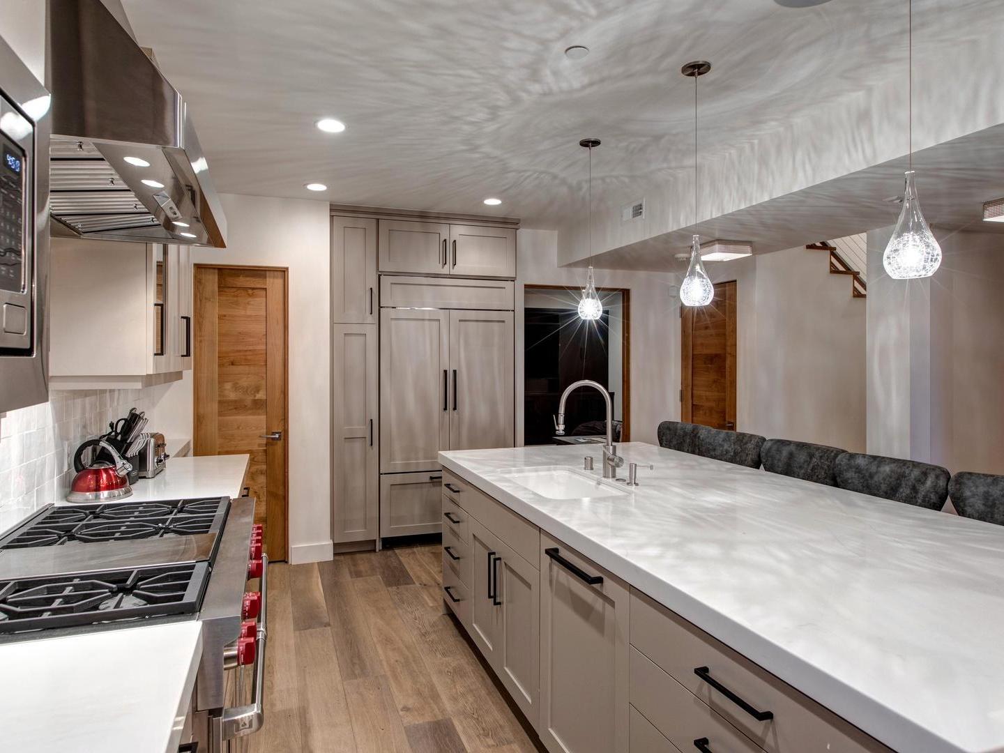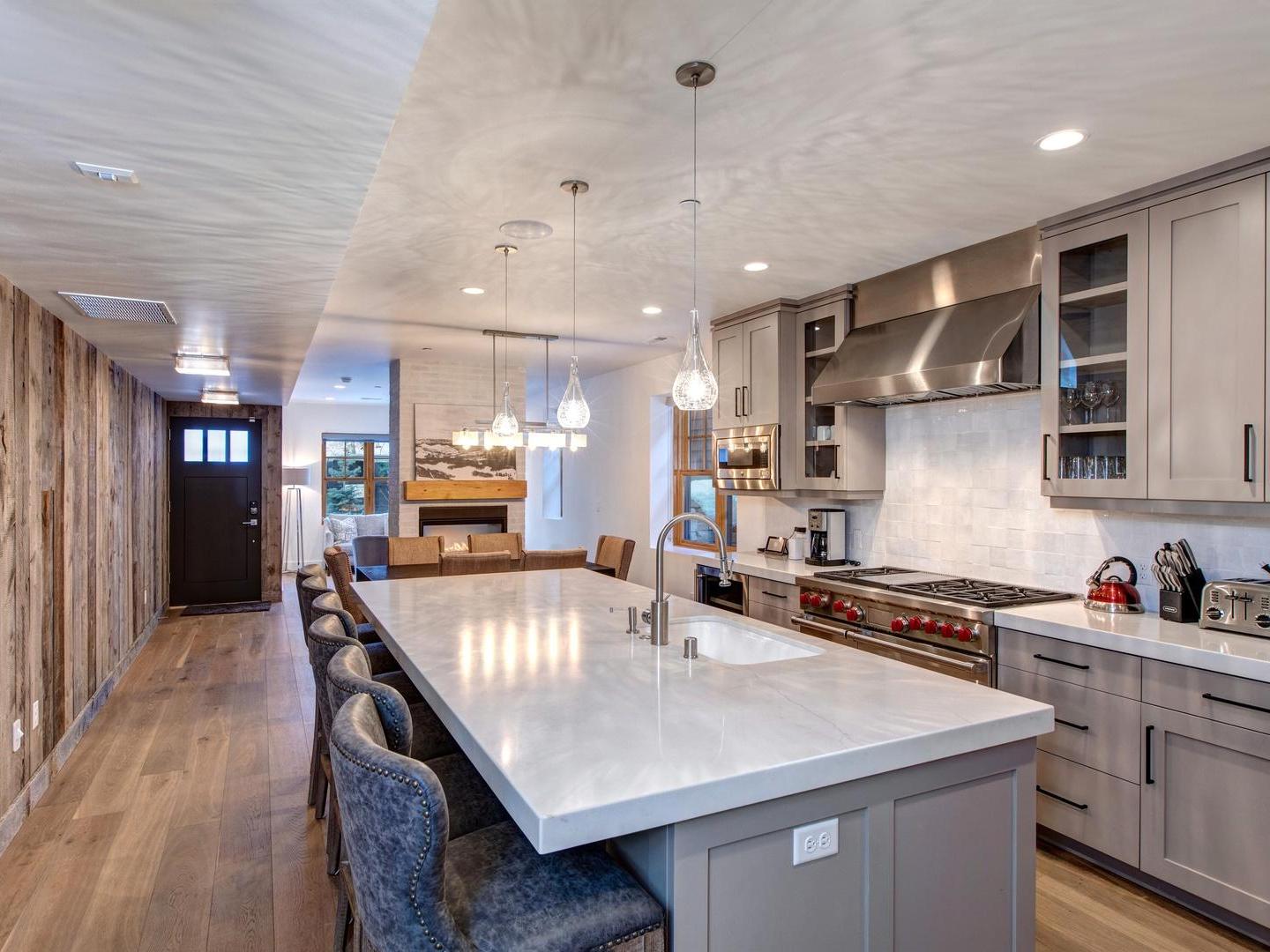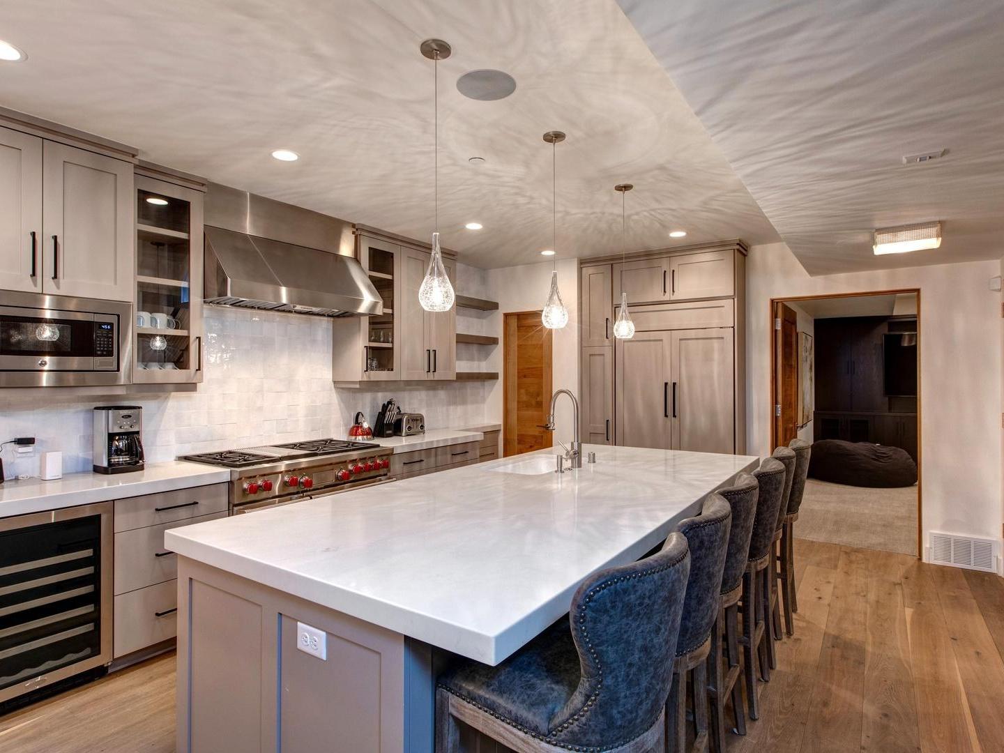 Spread over four levels with multiple living spaces, this 6 bedroom vacation home with 6.5 bathrooms presents the ideal retreat for groups of up to 12 guests. Enter on the main level which features a cozy sitting area with a double-sided gas fireplace on one end and an inviting den with a large screen television on the other end. Between the living areas is a dining table with seating for 6 guests that sits on the opposite side of the fireplace and a gourmet kitchen featuring a large breakfast bar that seats an additional 6 guests. Chefs in the group will love the kitchen boasting Wolf and Sub-Zero appliances and beautiful polished stone countertops.