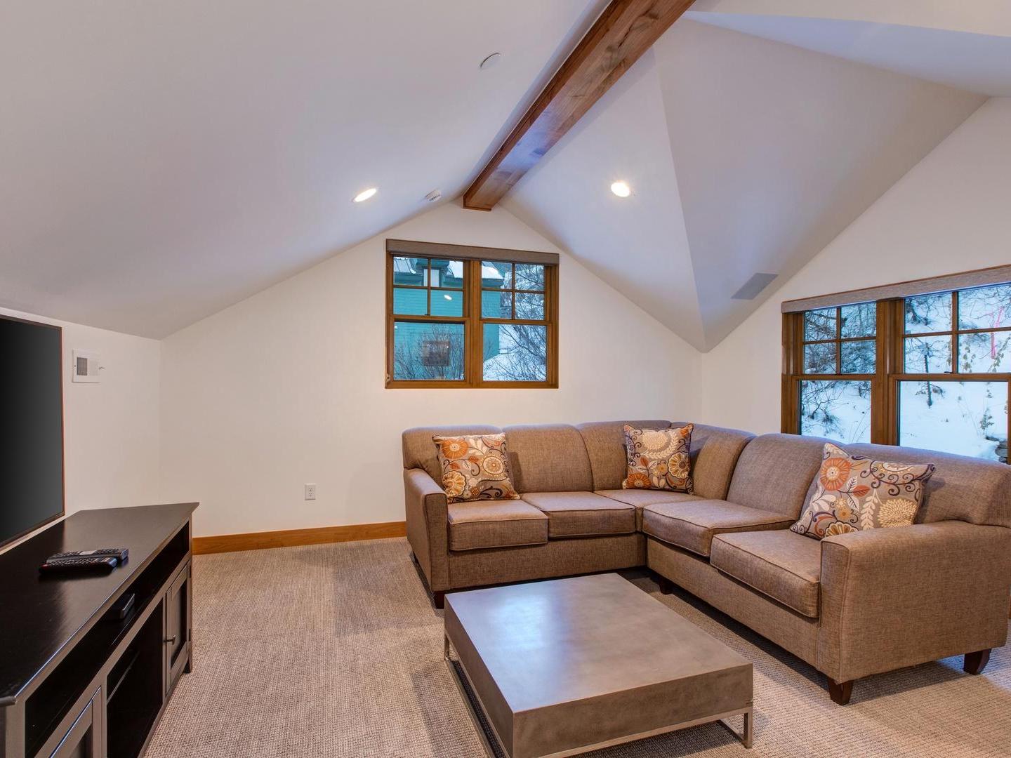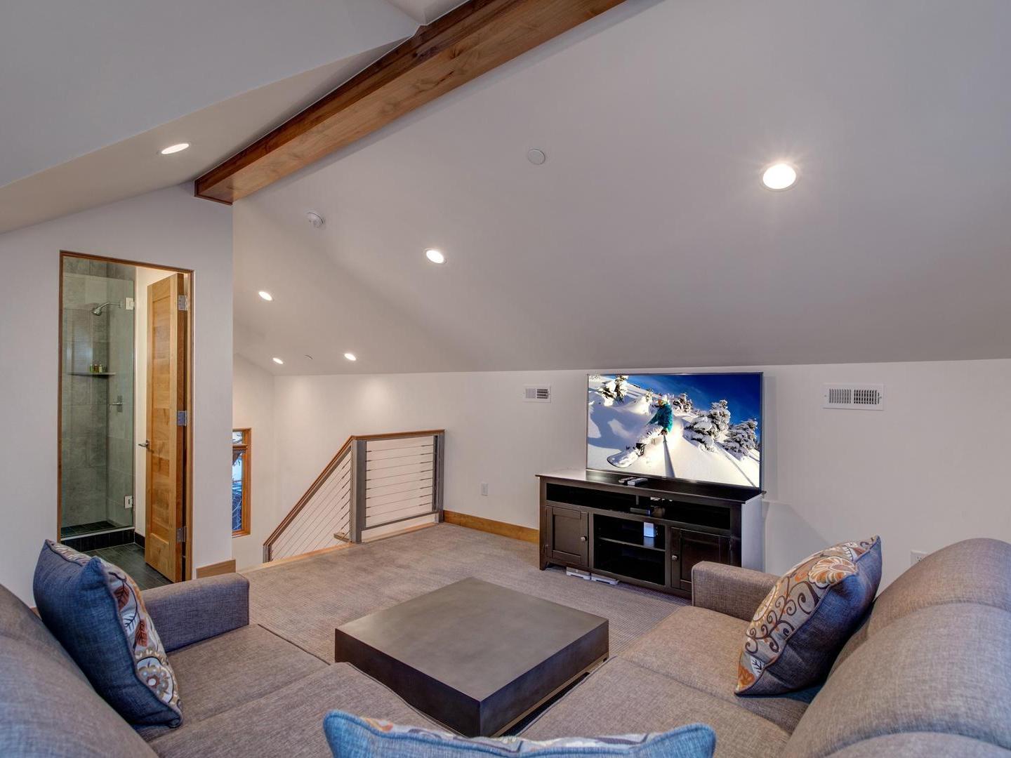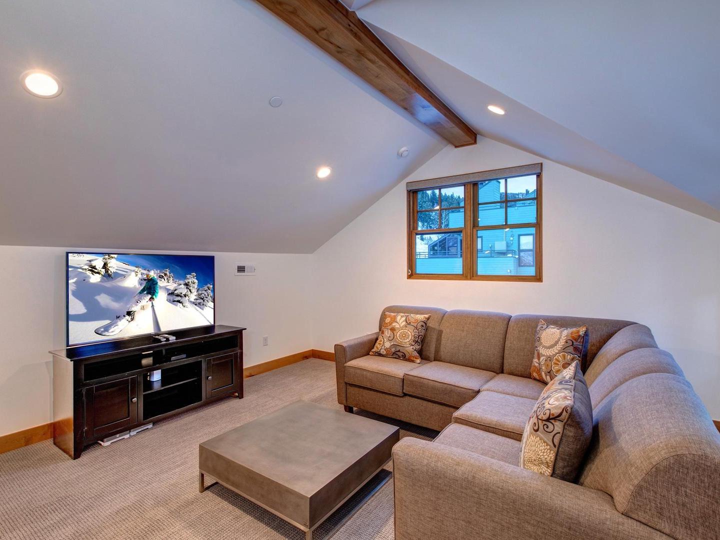 Occupying the uppermost level of the residence is a lofted family room with a sectional sofa, flatscreen television and private bathroom. Step out on to the rooftop from the third level to relax in the private hot tub under the stars.