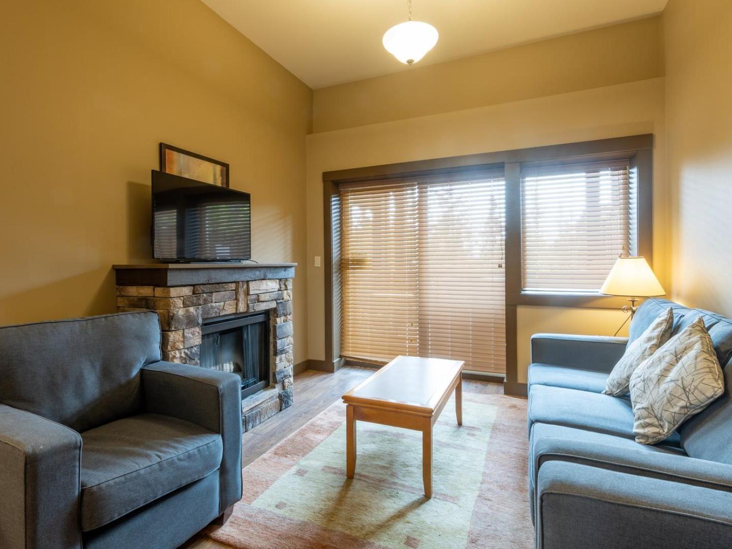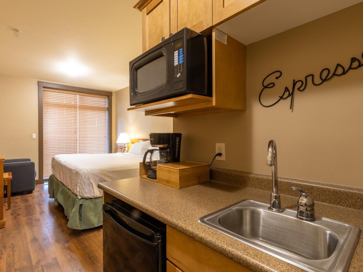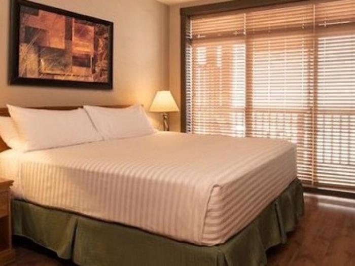 Guest rooms are cozy retreats at 400 square feet with a King bed, efficiency style kitchenette with mini-fridge, coffee maker and microwave, and a bathroom appointed with granite countertop and combination shower/tub. One and two bedroom suites are 700 square feet and 1,00 square feet, respectively, and feature living rooms with gas fireplaces and balconies, dining areas, washer/dryer, and fully equipped kitchen offering stainless steel appliances and granite countertops. For the ultimate in luxury, choose a two bedroom suite with private hot tubs on the balcony.