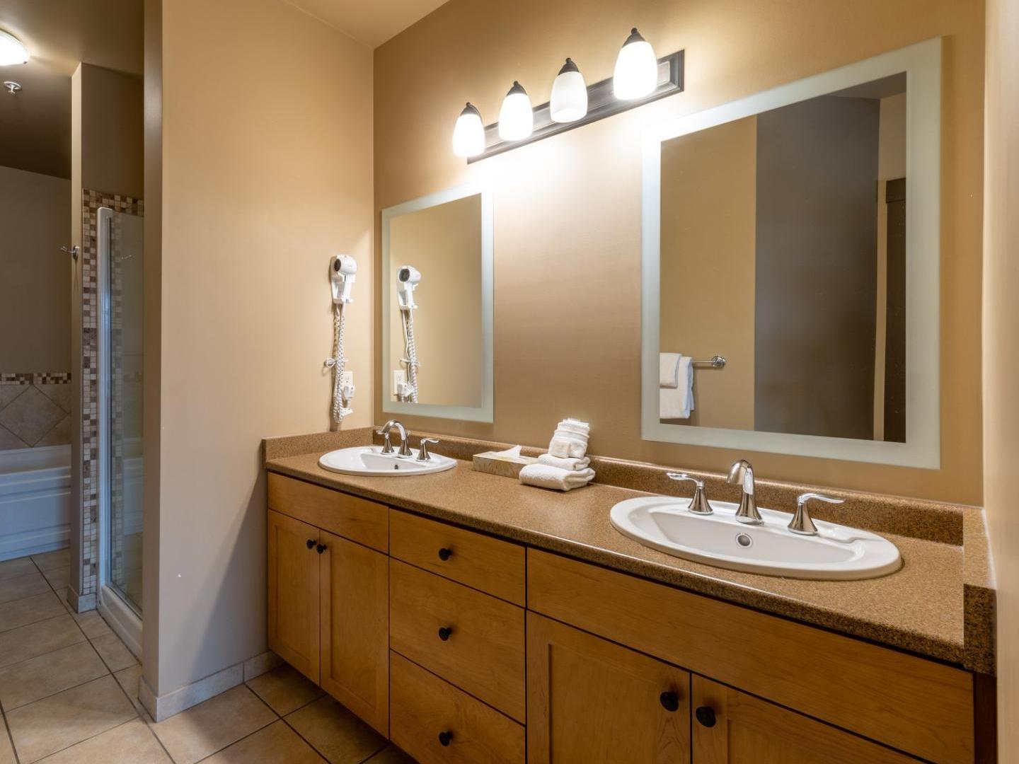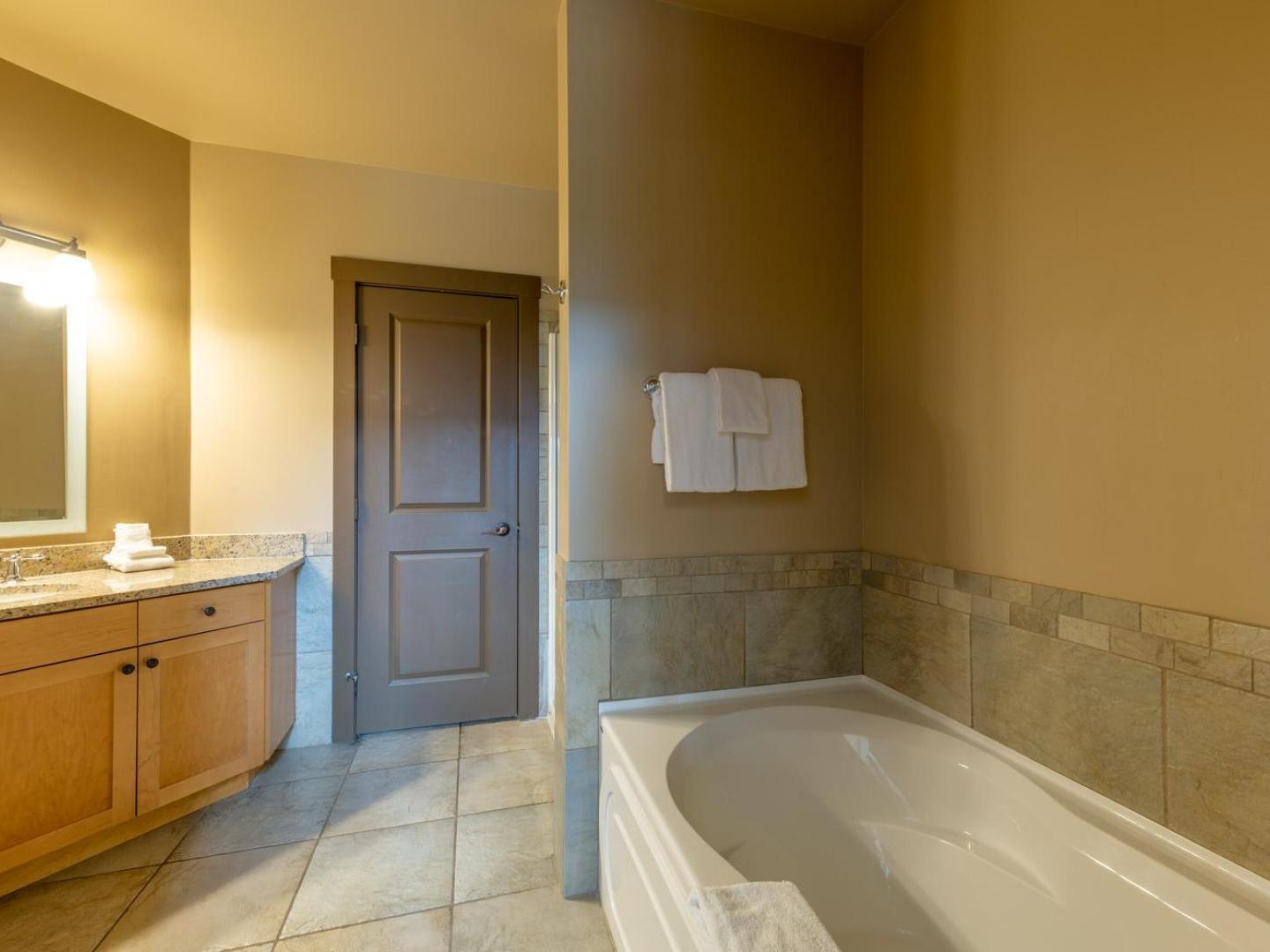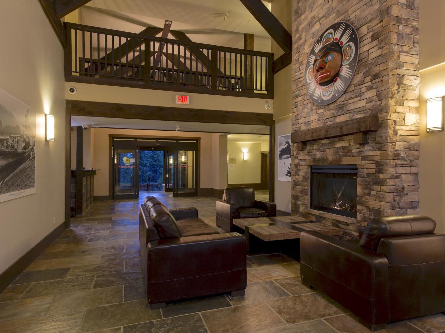 Guest rooms are cozy retreats at 400 square feet with a King bed, efficiency style kitchenette with mini-fridge, coffee maker and microwave, and a bathroom appointed with granite countertop and combination shower/tub. One and two bedroom suites are 700 square feet and 1,00 square feet, respectively, and feature living rooms with gas fireplaces and balconies, dining areas, washer/dryer, and fully equipped kitchen offering stainless steel appliances and granite countertops. For the ultimate in luxury, choose a two bedroom suite with private hot tubs on the balcony.