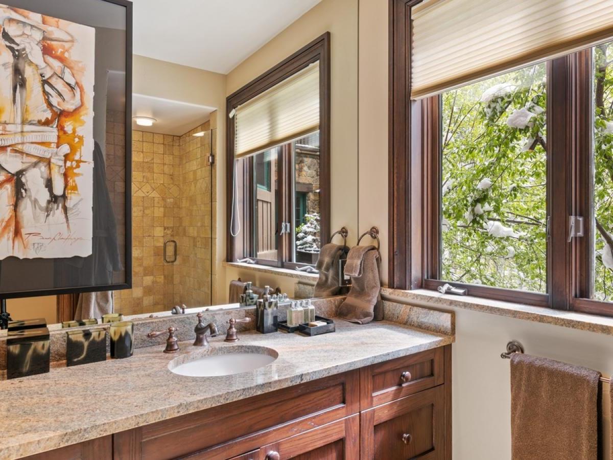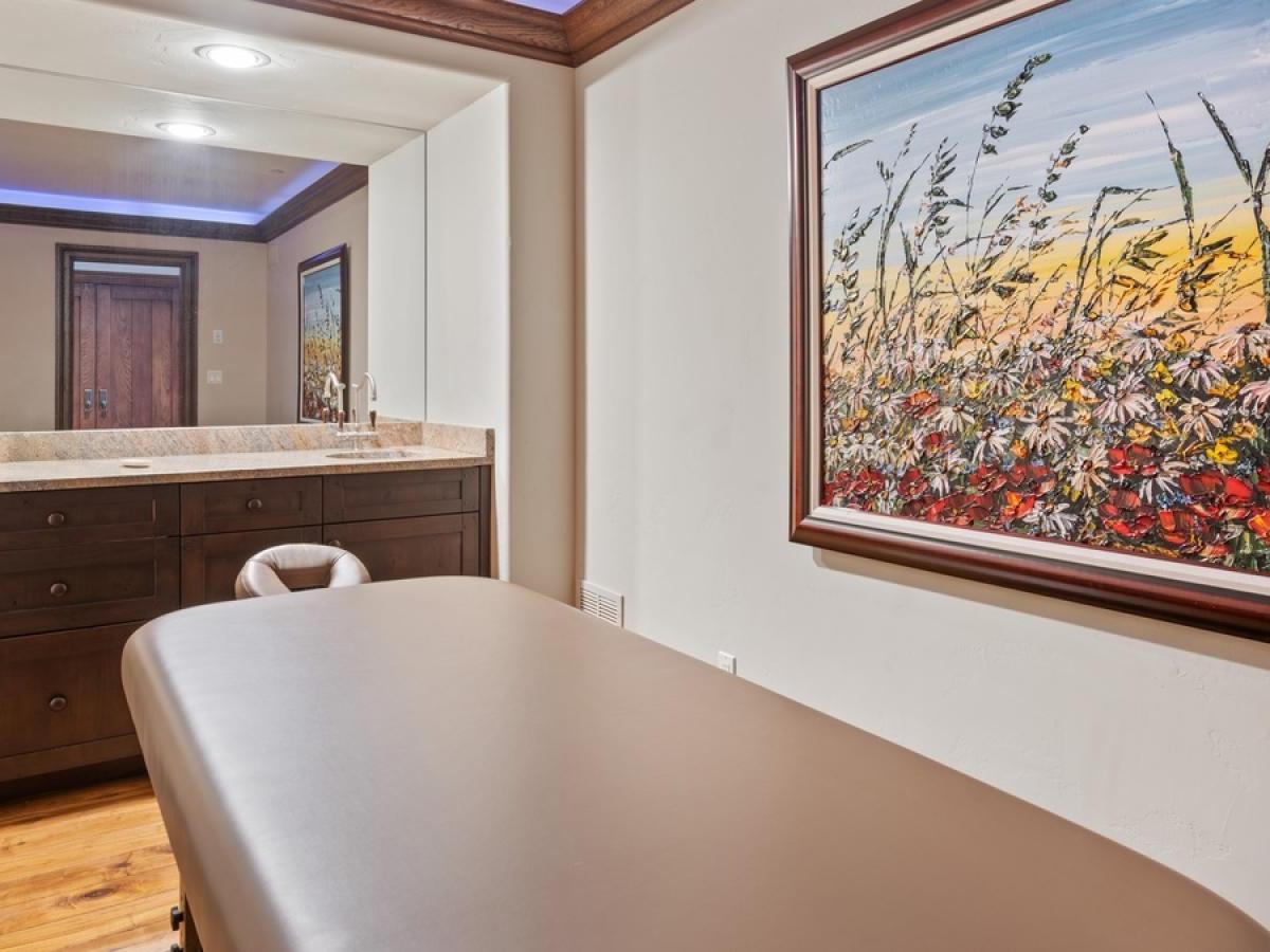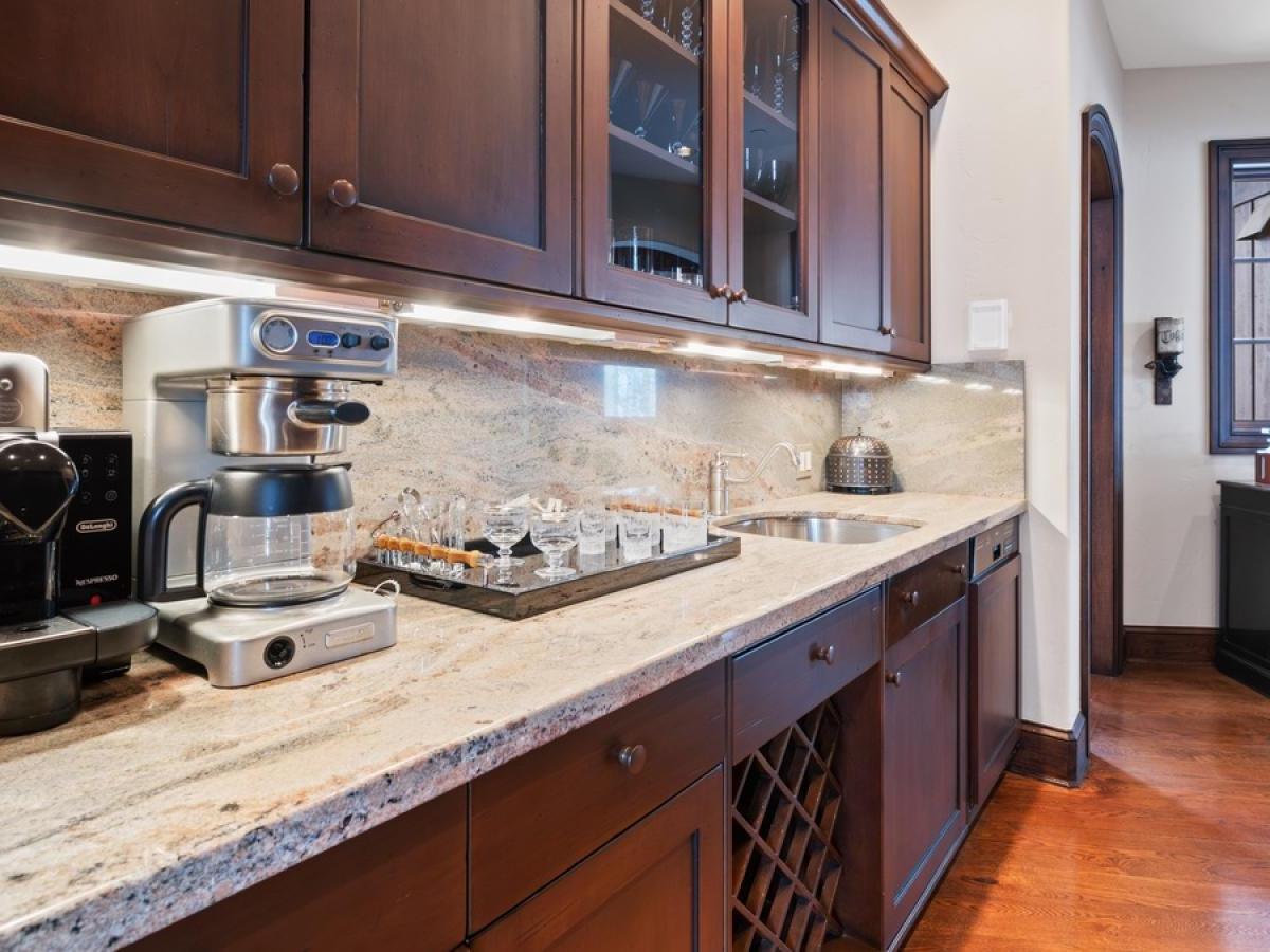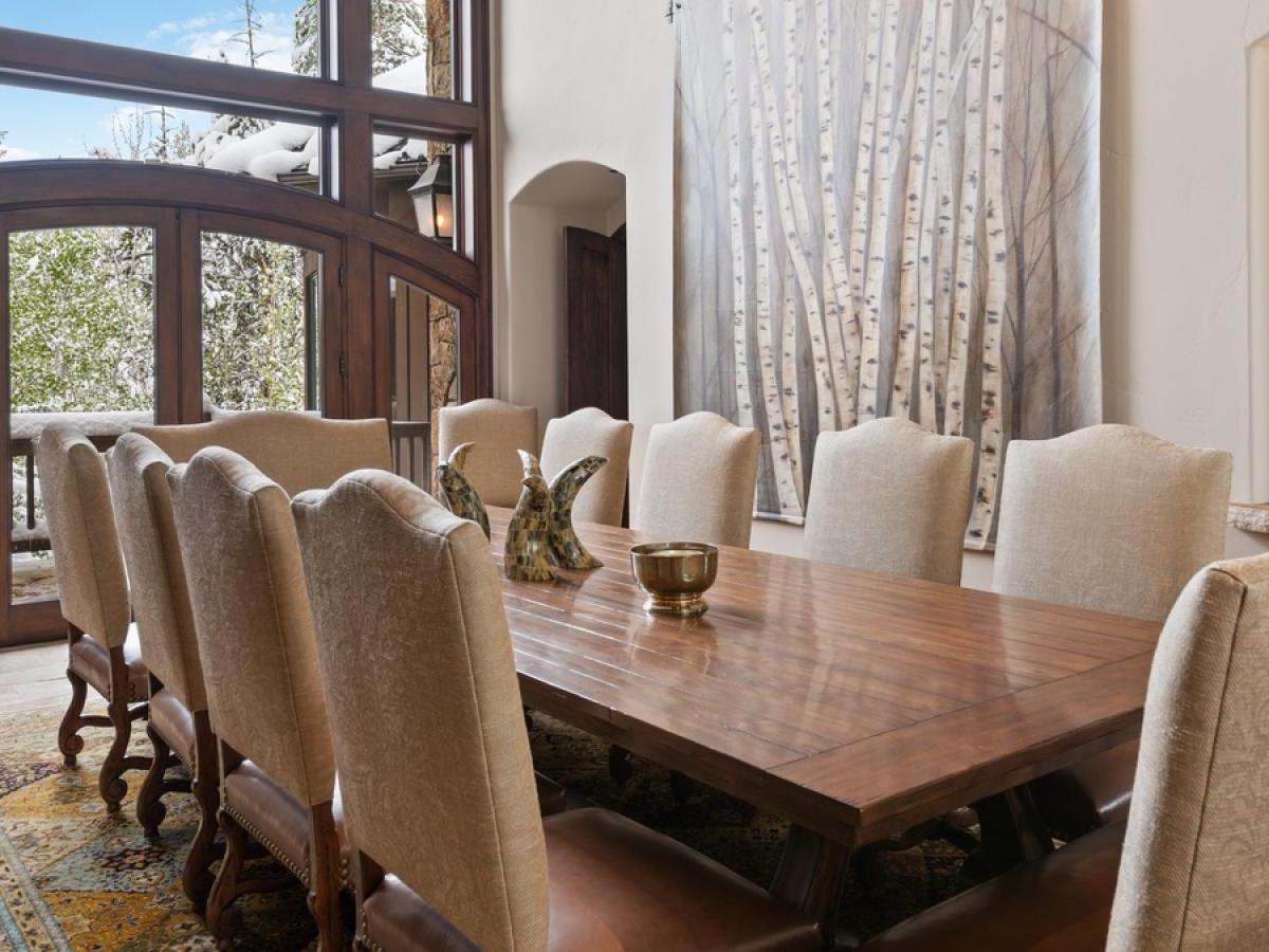 Outside, you will find getting to and from the ski slopes ultimately convenient via the private ski trail accessing the Elkhorn Chairlift below. Upon returning you will appreciate the outdoor areas that are ideally outfitted for enjoyment. Soothe the aching muscles in the oversized pool/hot tub, roast marshmallows around the fire pit, swing in front of the outdoor fireplace, and grill out in the comprehensive outdoor kitchen set under a covered area with heaters.