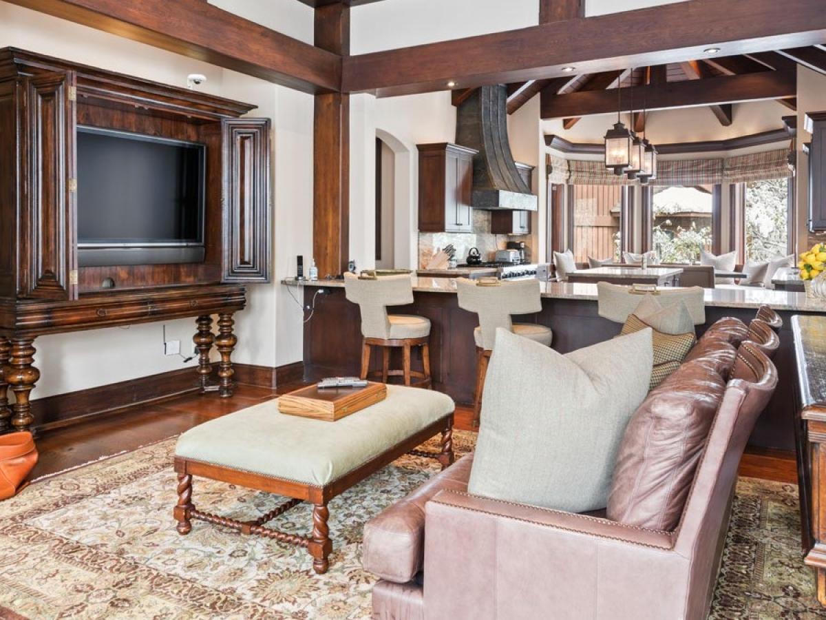 Impressive and grand, the expansive Great Room of this 7 bedroom, 9 bathroom estate invites the entire group of up to 14 guests to gather and entertain in comfort and style. Designer furnishings rest under vaulted ceilings, framed by massive walls of windows, and focus on a magnificent stone fireplace in the sprawling living room. This space flows into a professionally appointed gourmet kitchen with an adjacent sitting area with a flatscreen television, breakfast nook, and formal dining room.