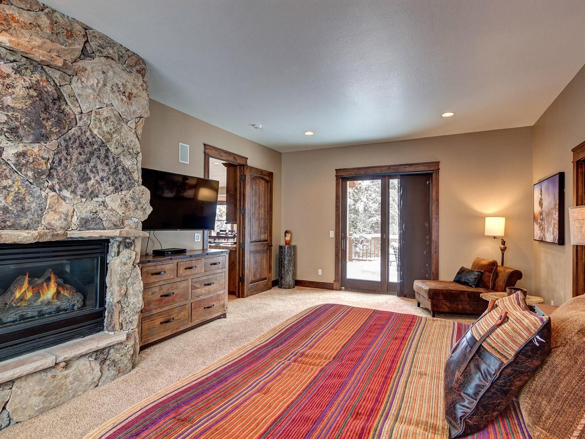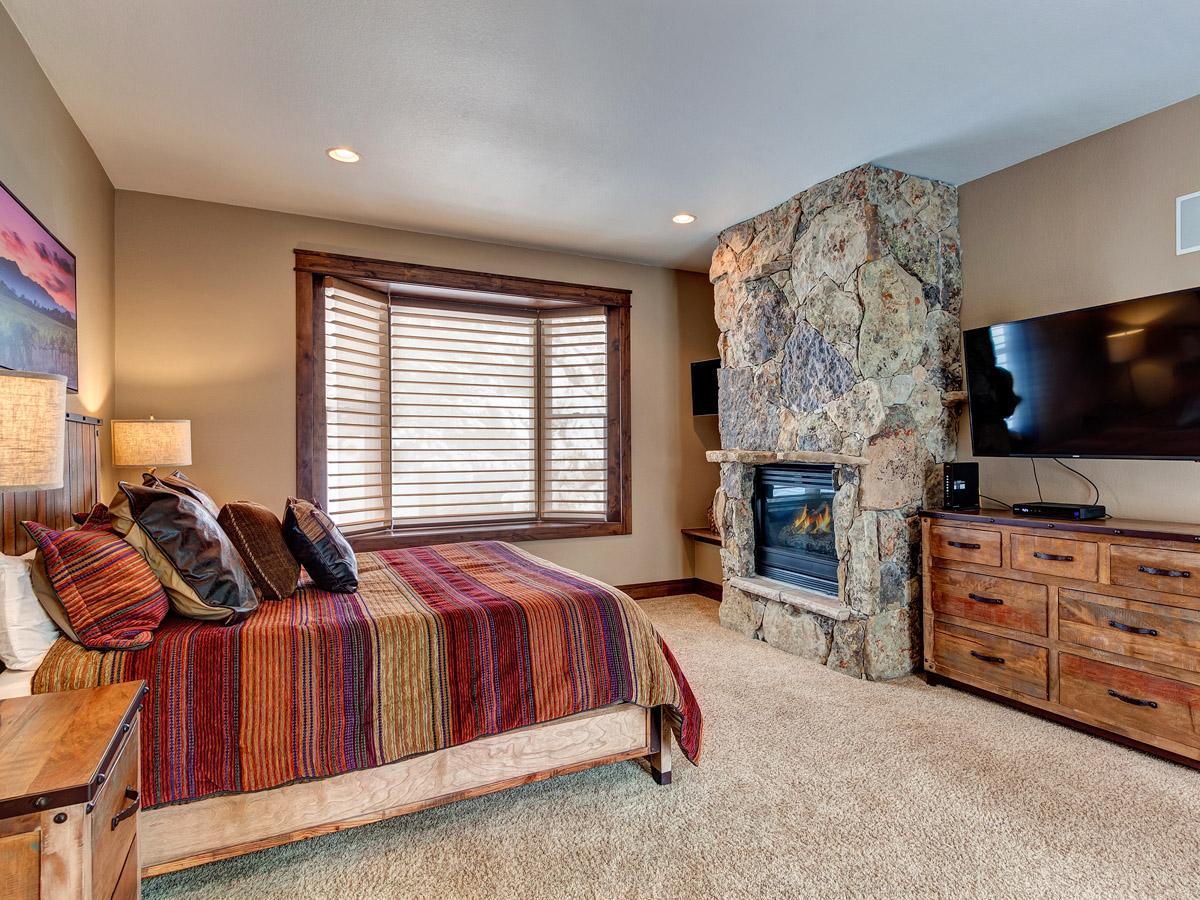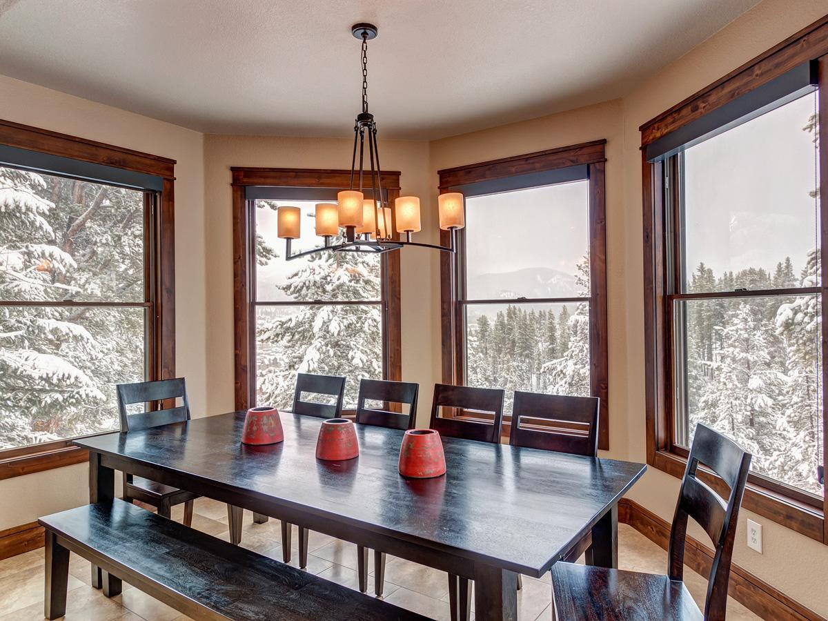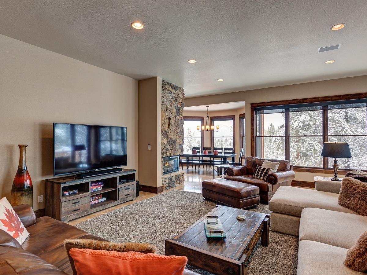 On the main level, there are two separate spaces to hang out and relax after an exciting day on the slopes or walking around town. An inviting living room boasts several sofas, a flat screen television and a gas fireplace, while a cozy den area is comfortably furnished and features a wood-burning fireplace. Open and bright with tons of natural light, the gourmet kitchen is appointed with granite countertops, high-end appliances and a cozy breakfast bar with three stools. Enjoy warmth from the gas fireplace, which also heats the living room and adjacent dining area with seating for ten guests.