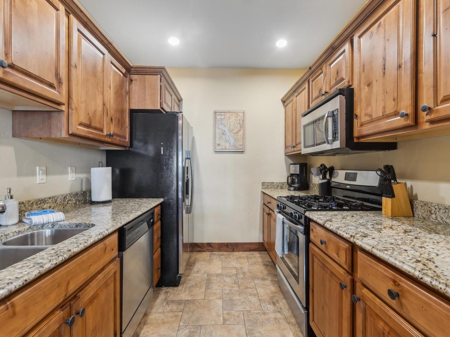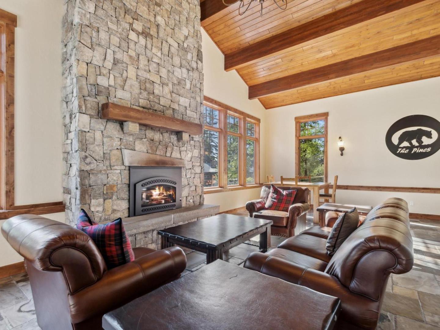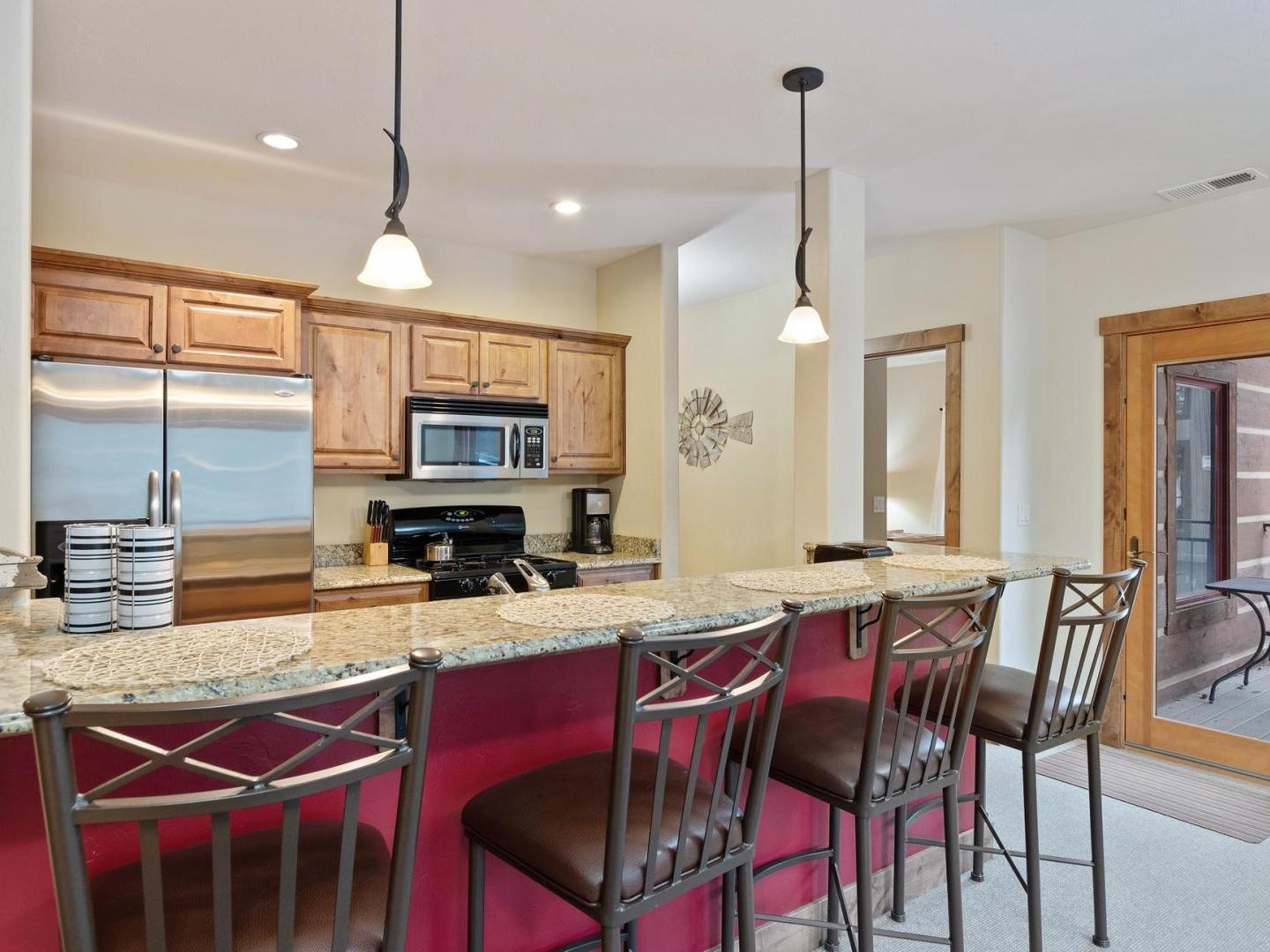 Tastefully appointed and open, the living areas feature comfortable furnishings centered on a gas fireplace and television with access to the patio or deck. Overlooking the living room, the kitchens are fully equipped with all of the essentials, breakfast bar seating, and a dining table located between the kitchen and living room.