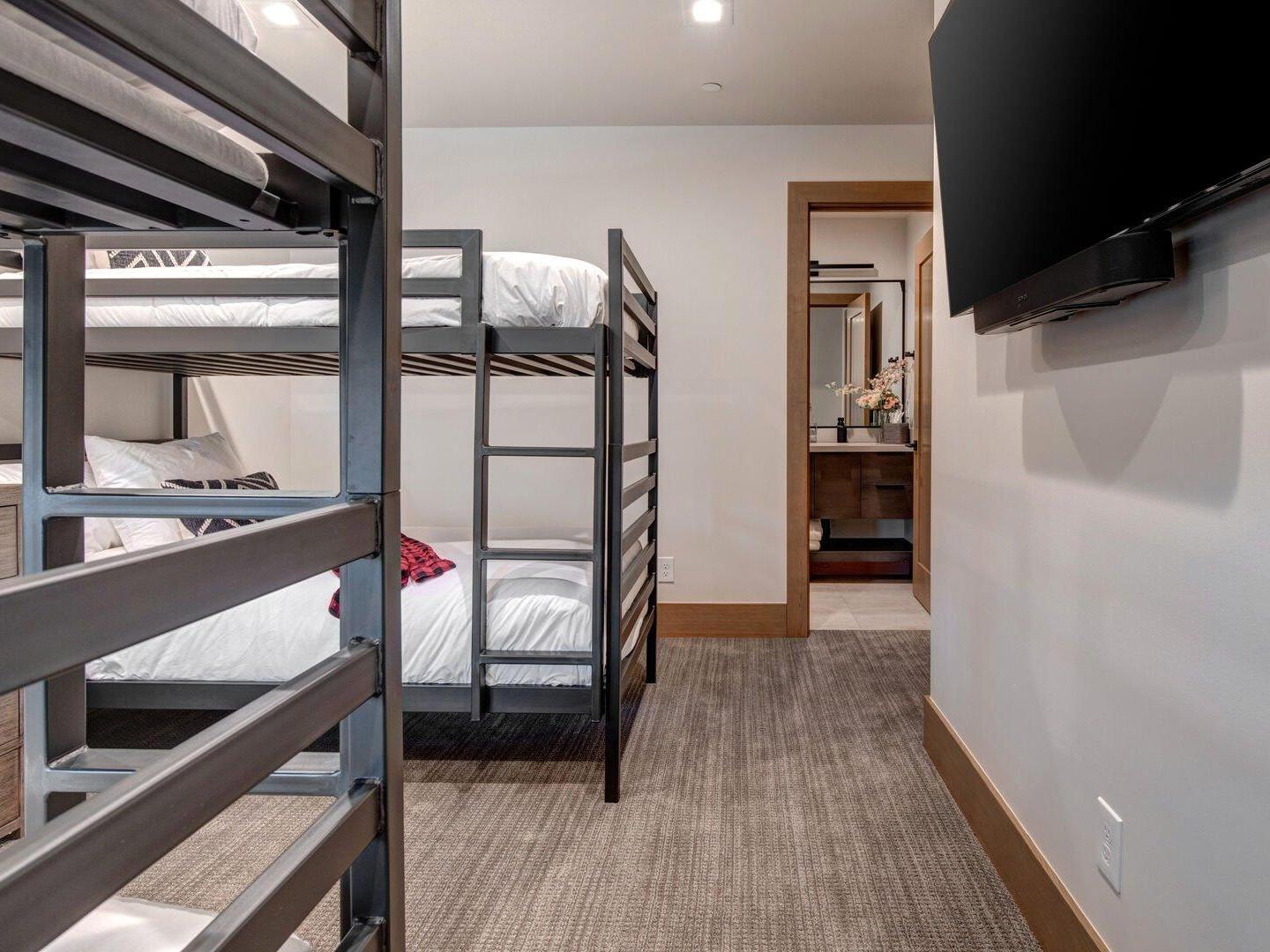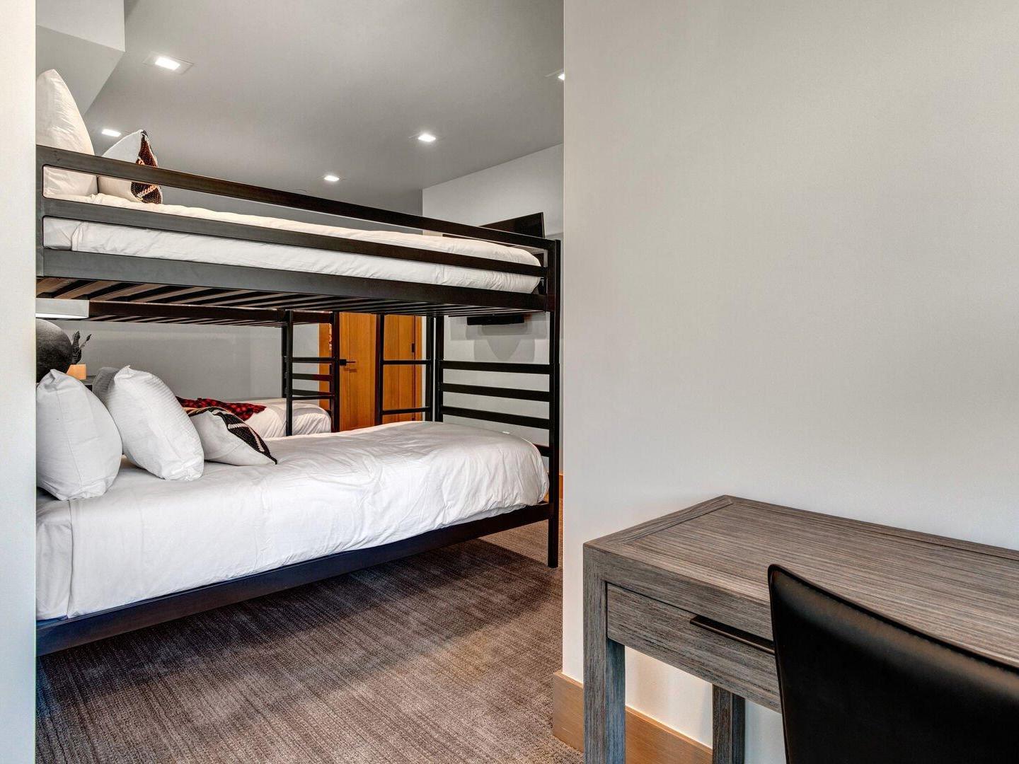 On the third level, two guest bedrooms with King beds each feature private bathrooms, while a third guest bedroom with a Queen bed shares a bathroom. The first level features a bunk room off the theater room, outfitted with two sets of Twin over Twin bunk beds, a desk area, and a private bathroom.