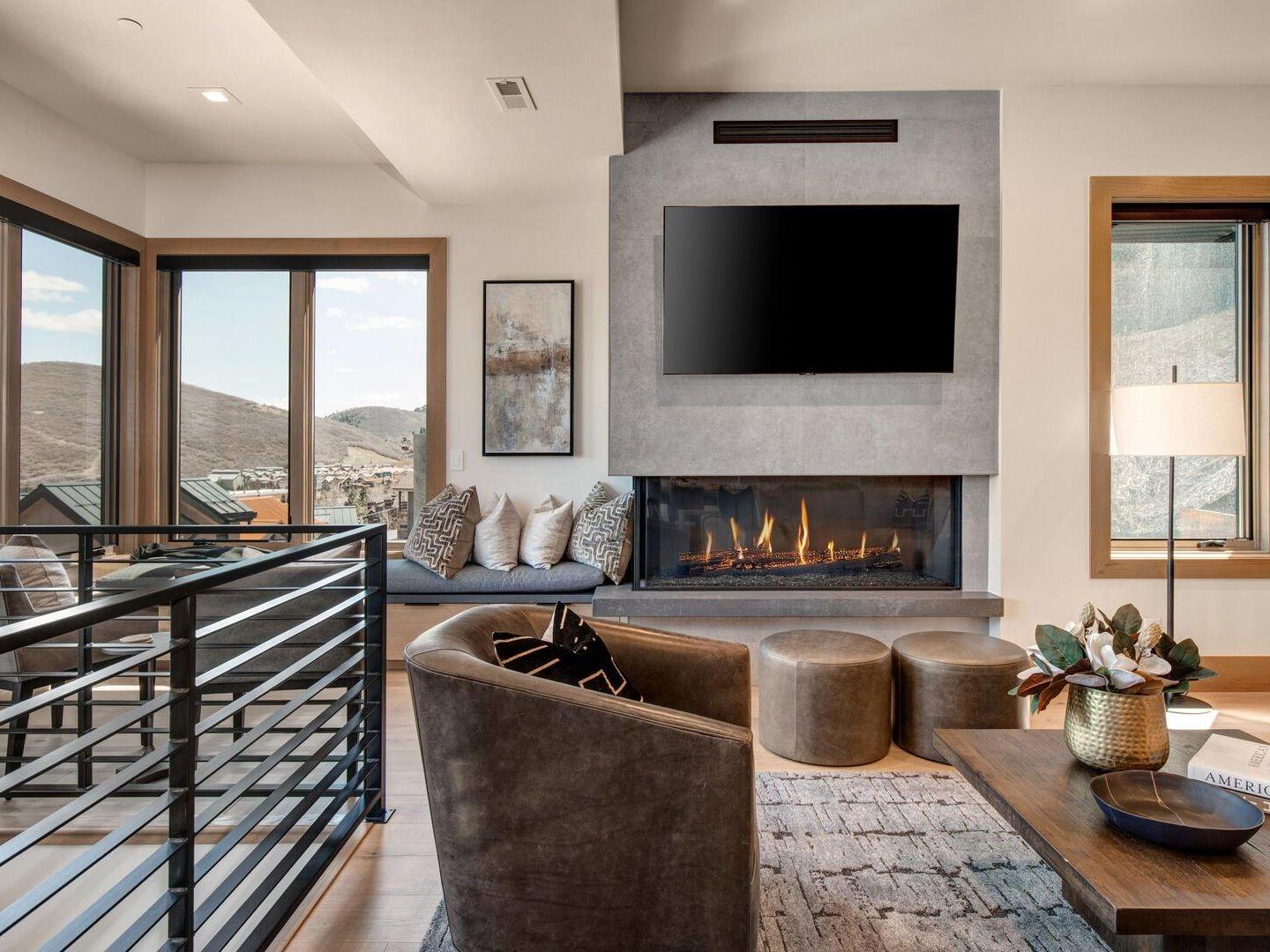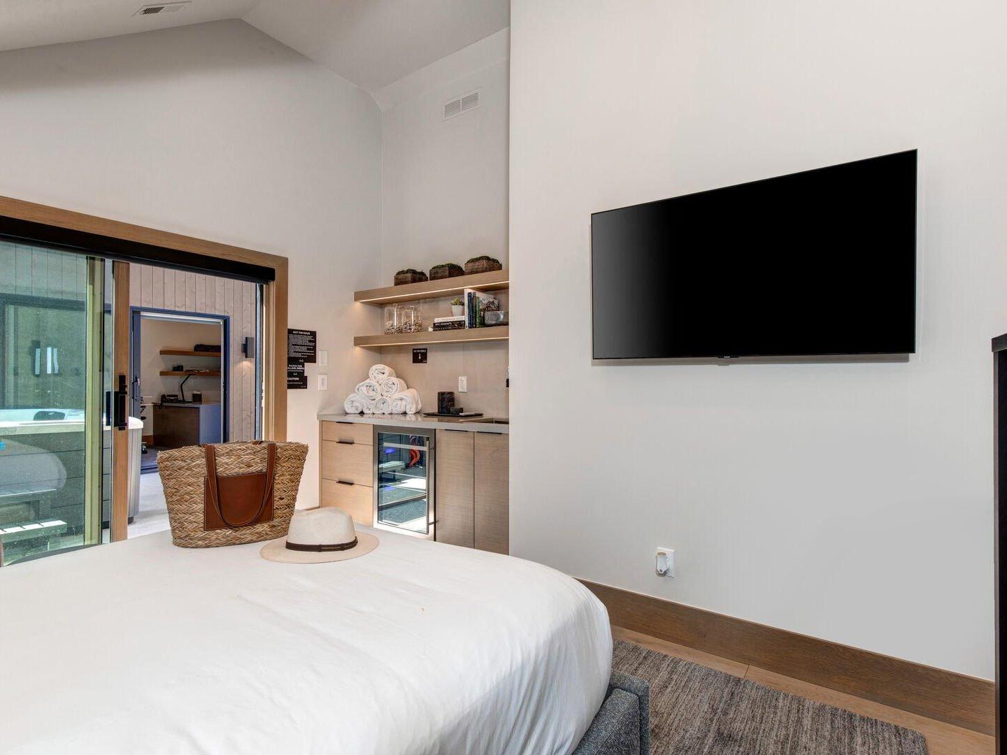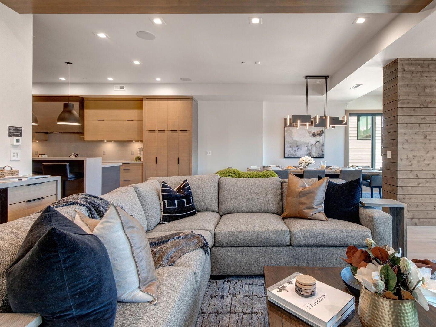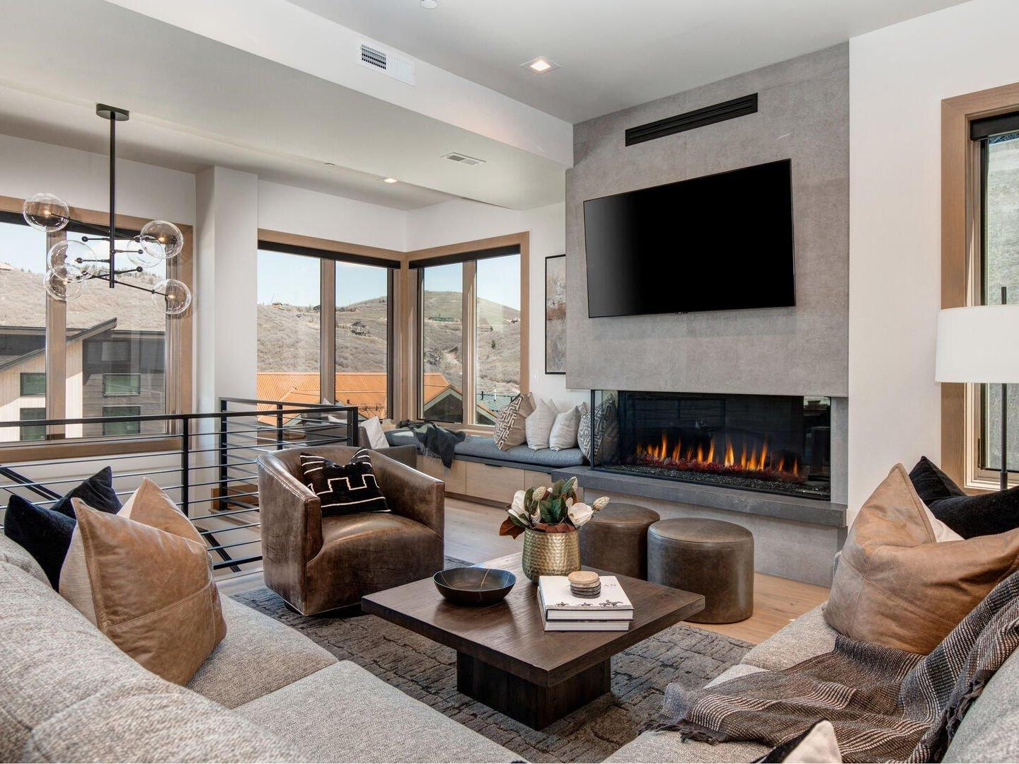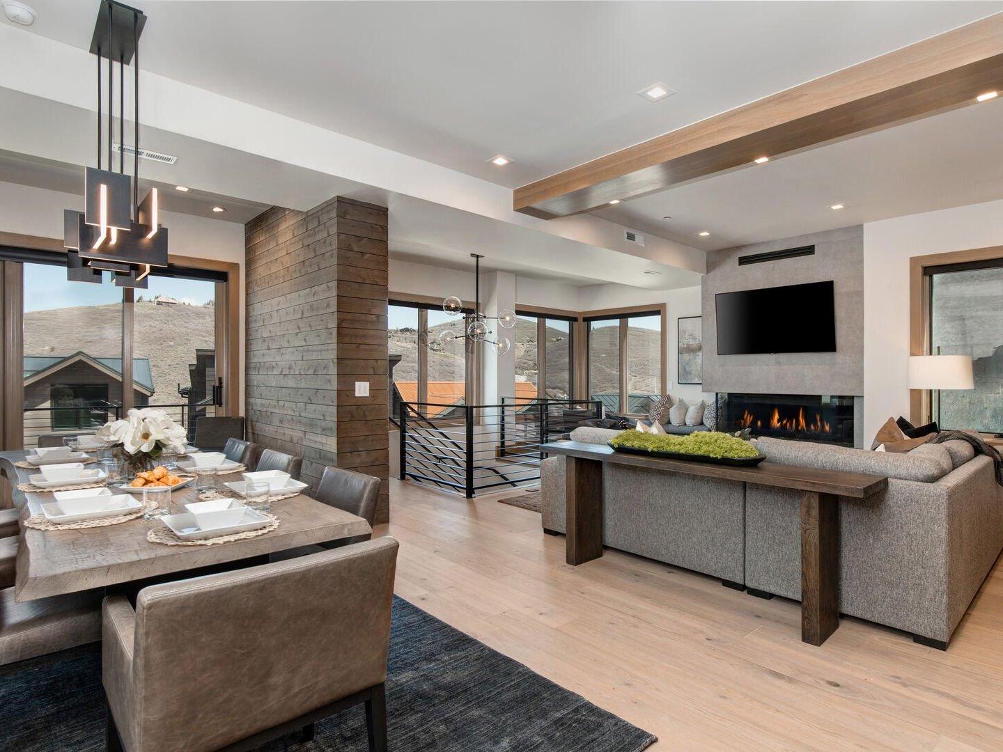 Gather, entertain, and unwind in the cozy living room of this 6-bedroom, 5-full, and 3-half bathroom contemporary mountain retreat. Comfortable furnishings are centered around a gas fireplace and wall-mounted television, with a convenient wet bar just off to the side. The adjacent dining table seats 8, while the breakfast bar offers 4 additional spots. The gourmet kitchen, with sleek cabinetry, polished-stone countertops, and high-end appliances, overlooks the dining and living areas, creating a perfect space for entertaining.
