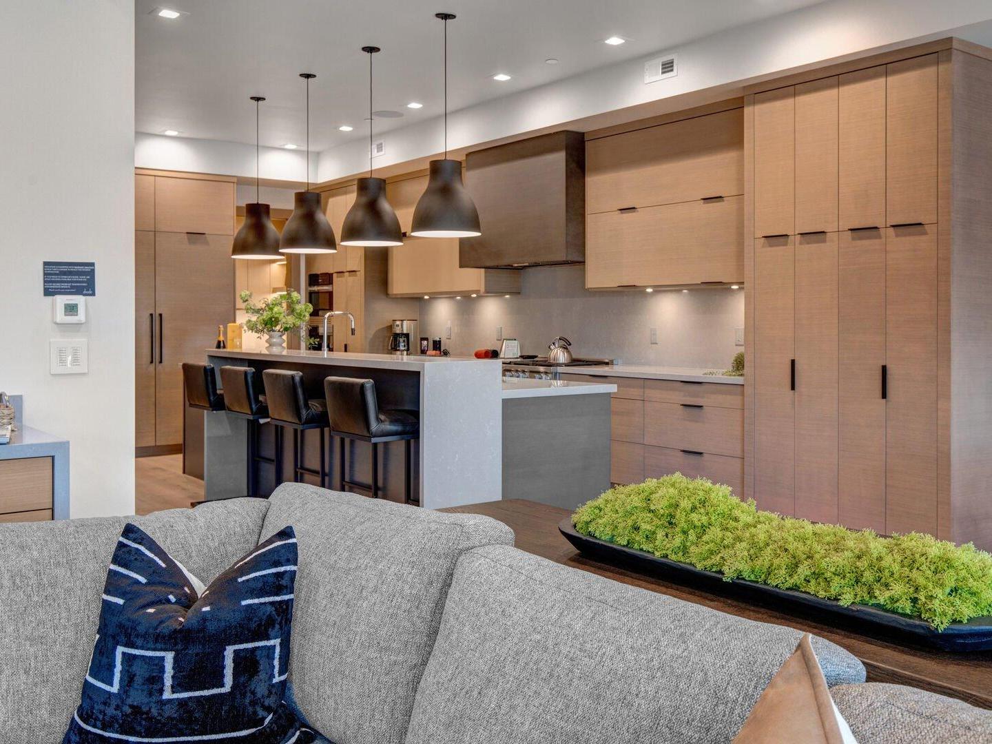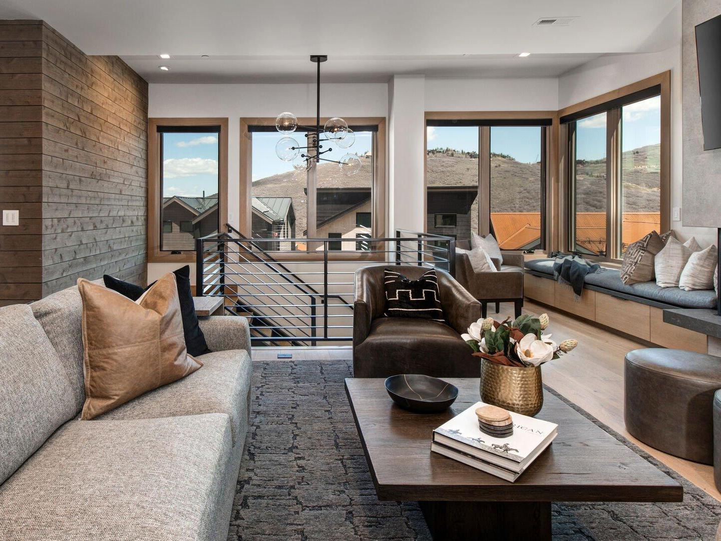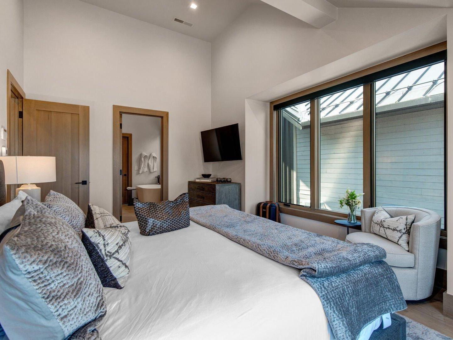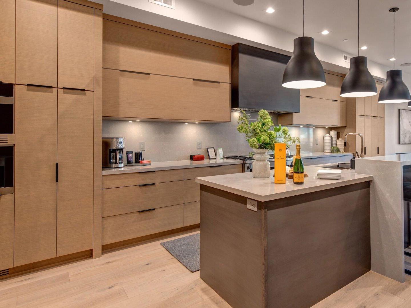 Gather, entertain, and unwind in the cozy living room of this 6-bedroom, 5-full, and 3-half bathroom contemporary mountain retreat. Comfortable furnishings are centered around a gas fireplace and wall-mounted television, with a convenient wet bar just off to the side. The adjacent dining table seats 8, while the breakfast bar offers 4 additional spots. The gourmet kitchen, with sleek cabinetry, polished-stone countertops, and high-end appliances, overlooks the dining and living areas, creating a perfect space for entertaining.