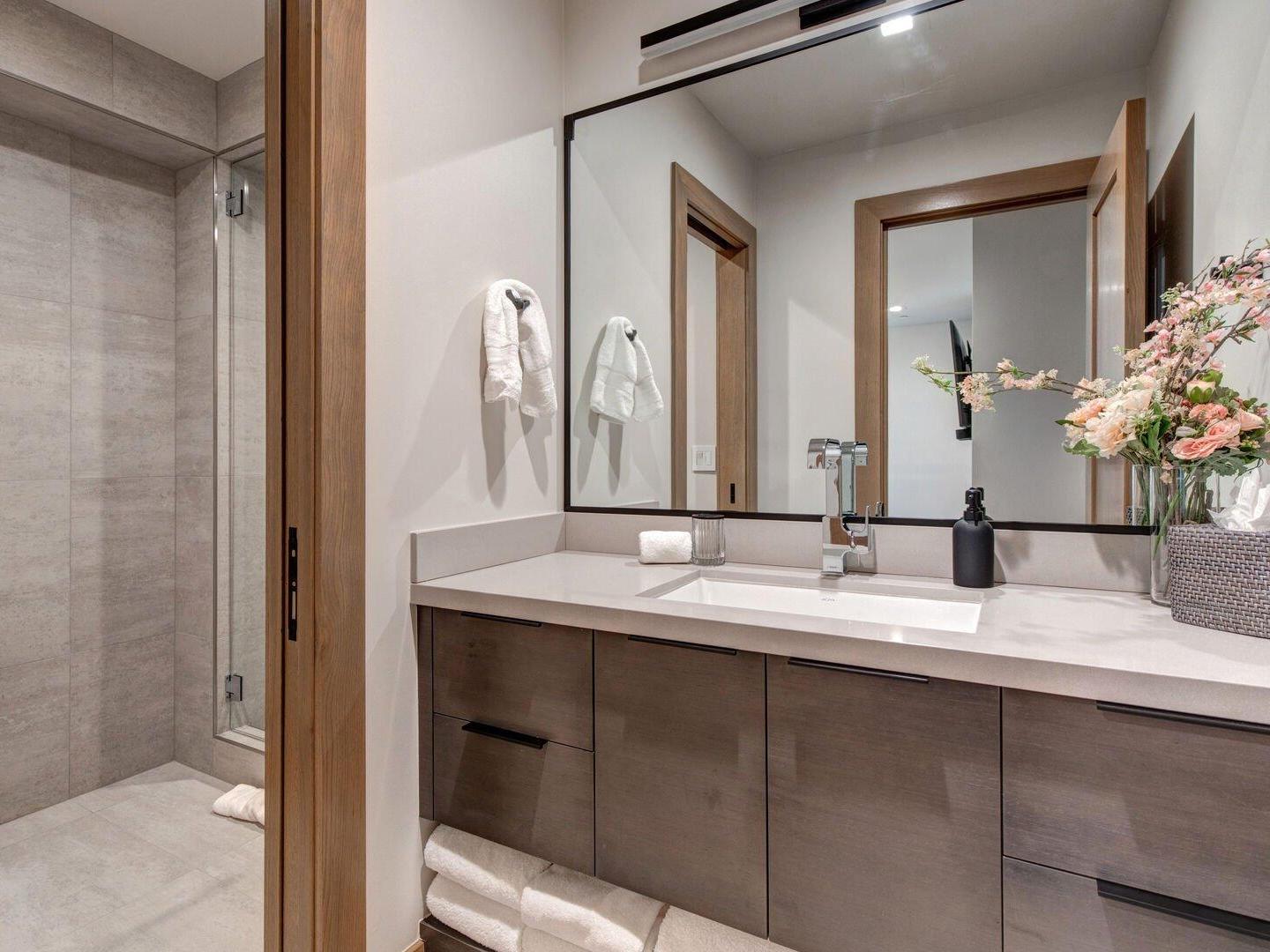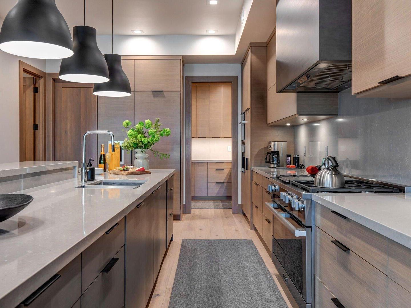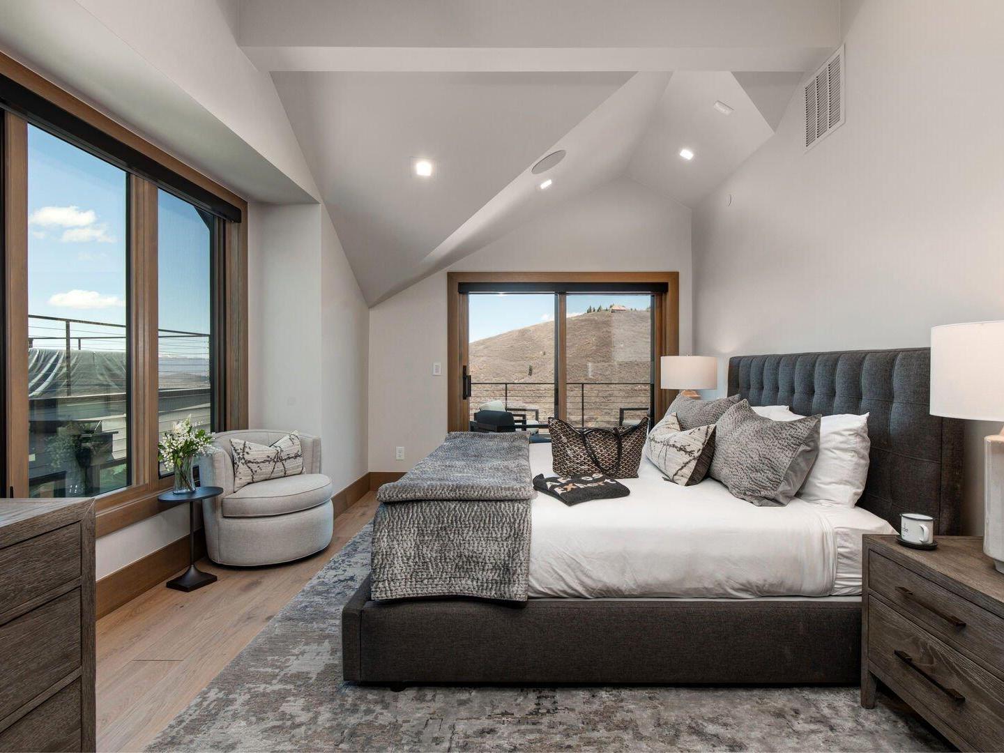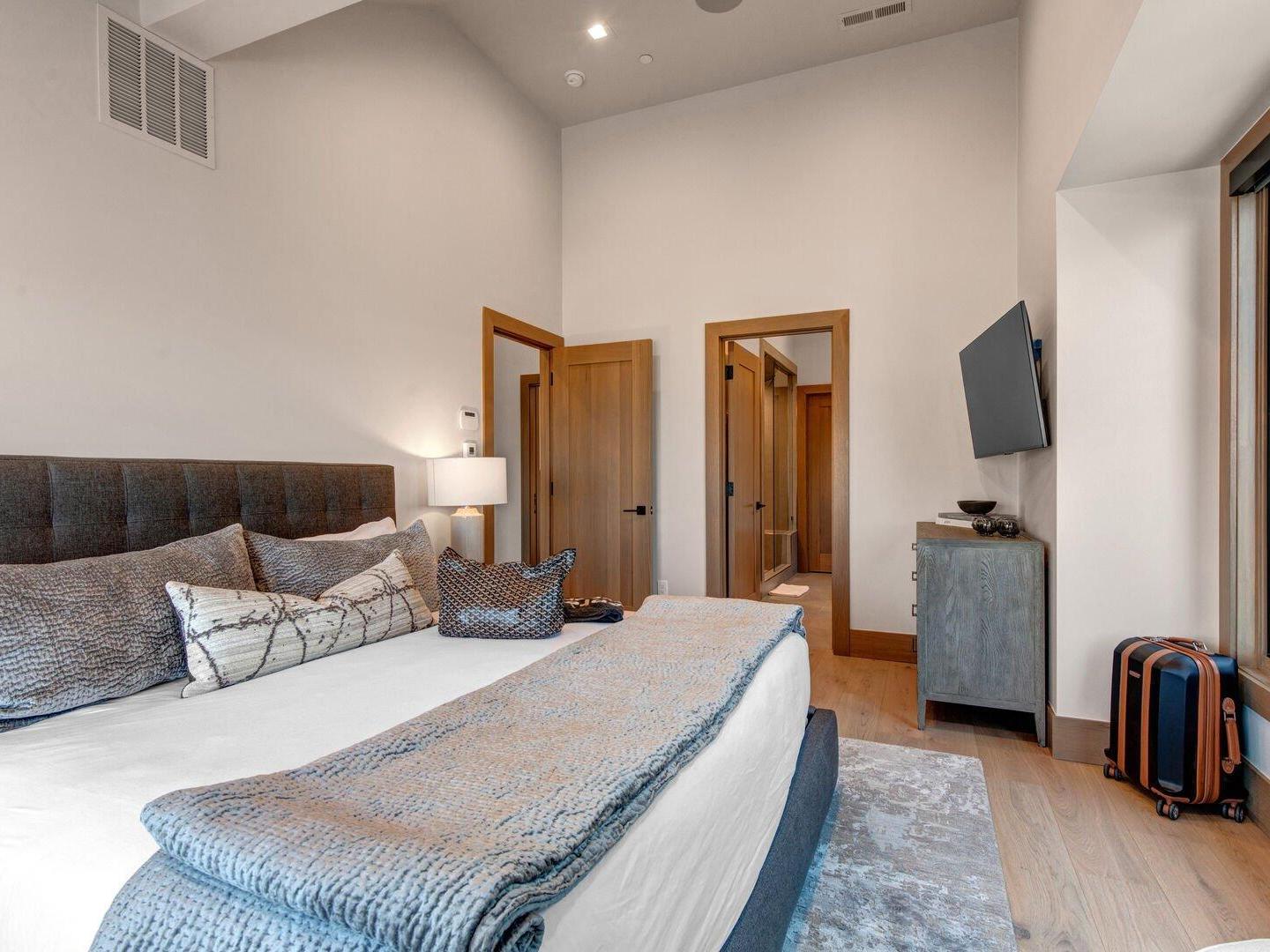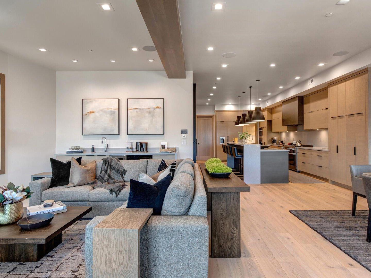 Gather, entertain, and unwind in the cozy living room of this 6-bedroom, 5-full, and 3-half bathroom contemporary mountain retreat. Comfortable furnishings are centered around a gas fireplace and wall-mounted television, with a convenient wet bar just off to the side. The adjacent dining table seats 8, while the breakfast bar offers 4 additional spots. The gourmet kitchen, with sleek cabinetry, polished-stone countertops, and high-end appliances, overlooks the dining and living areas, creating a perfect space for entertaining.