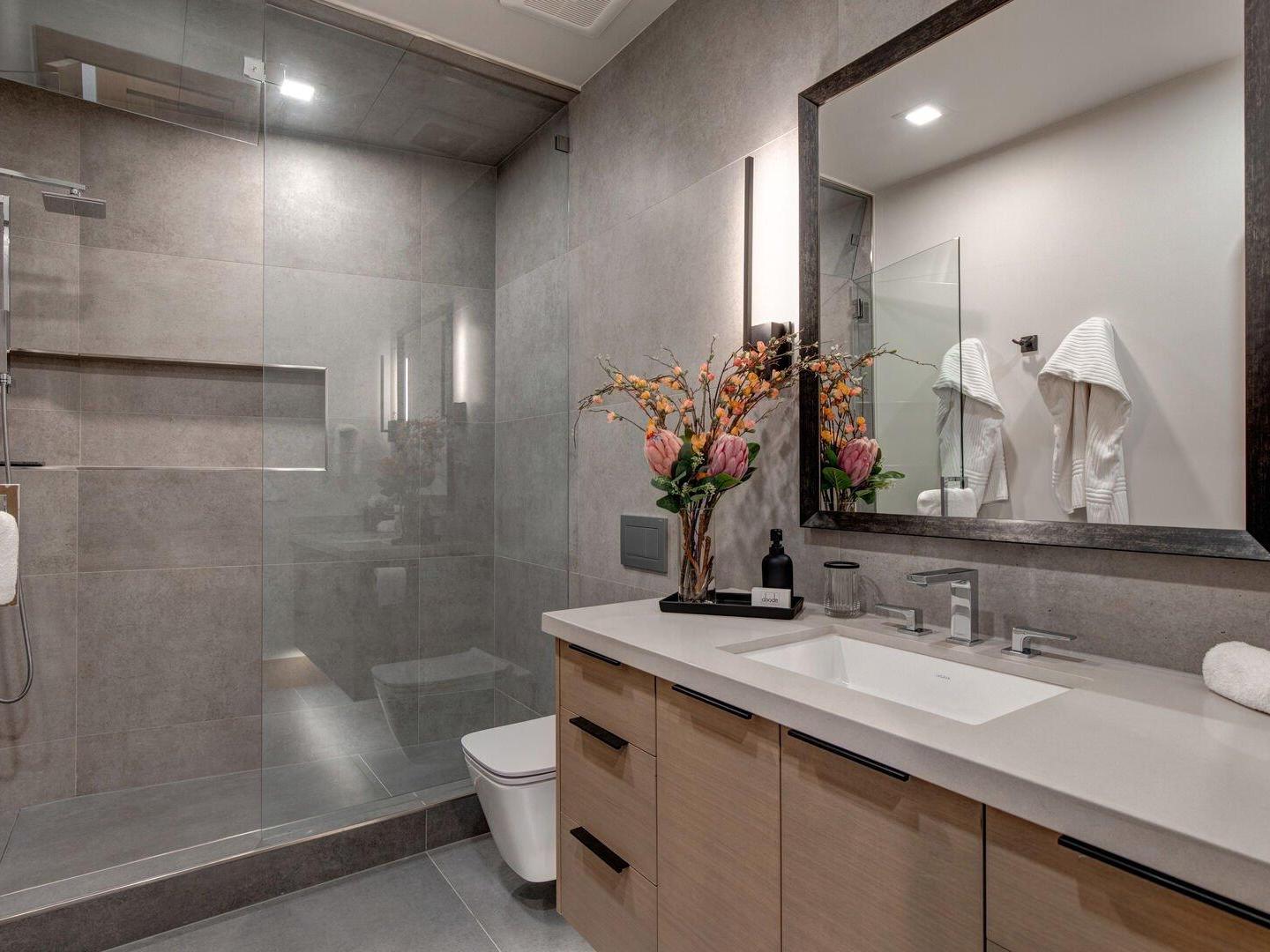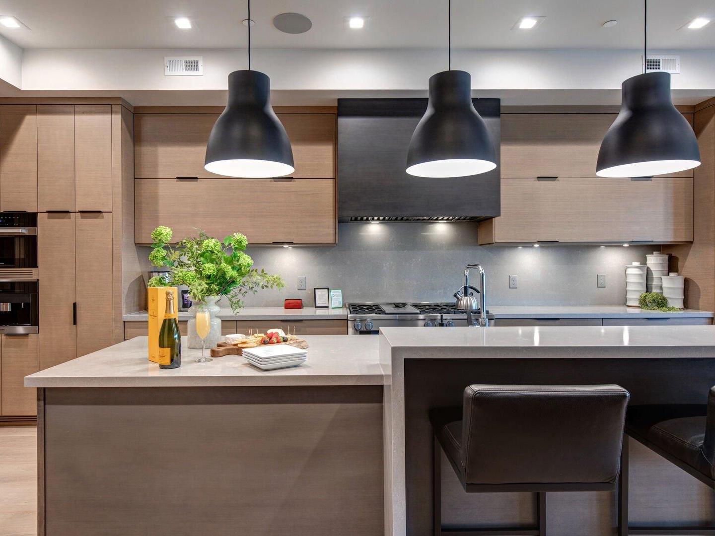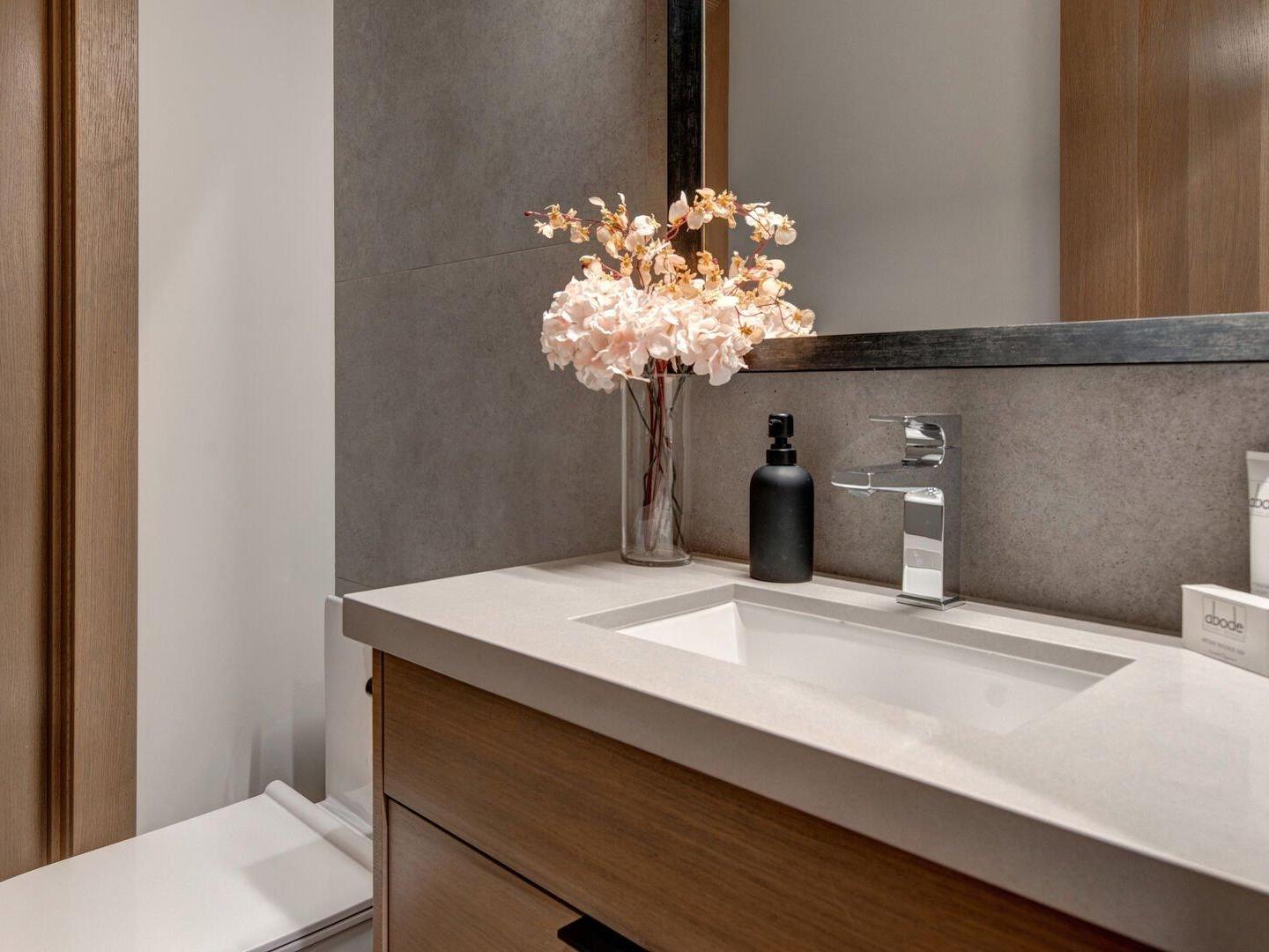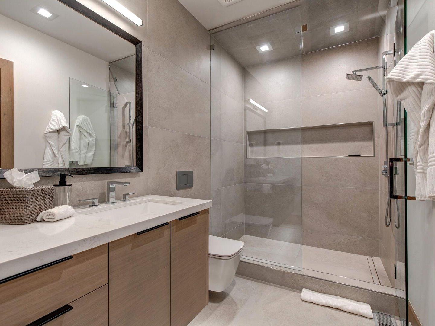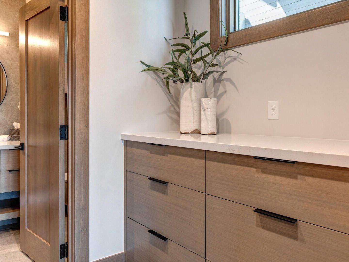 Gather, entertain, and unwind in the cozy living room of this 6-bedroom, 5-full, and 3-half bathroom contemporary mountain retreat. Comfortable furnishings are centered around a gas fireplace and wall-mounted television, with a convenient wet bar just off to the side. The adjacent dining table seats 8, while the breakfast bar offers 4 additional spots. The gourmet kitchen, with sleek cabinetry, polished-stone countertops, and high-end appliances, overlooks the dining and living areas, creating a perfect space for entertaining.