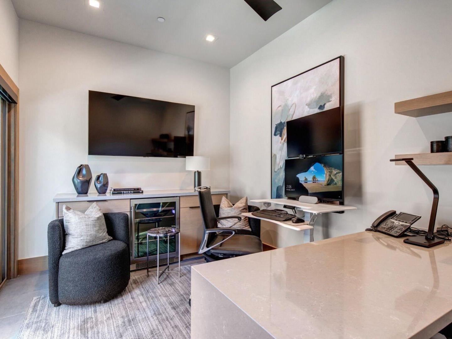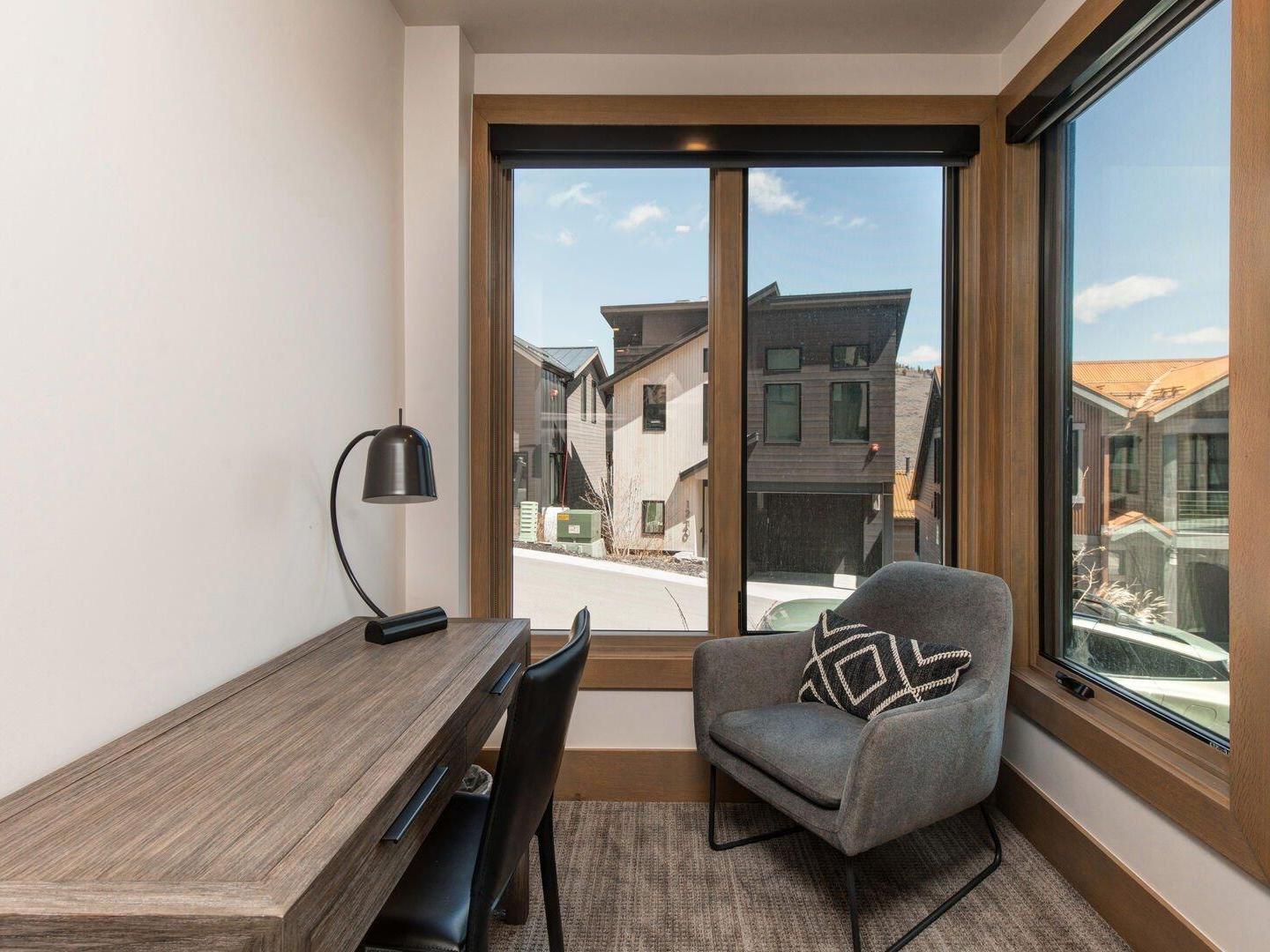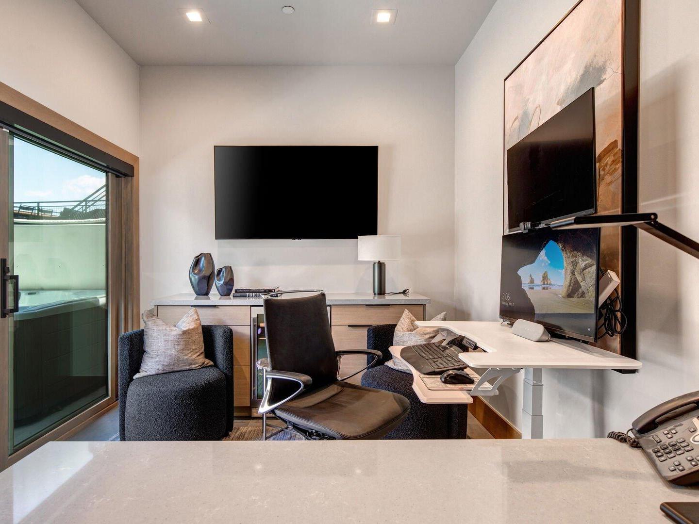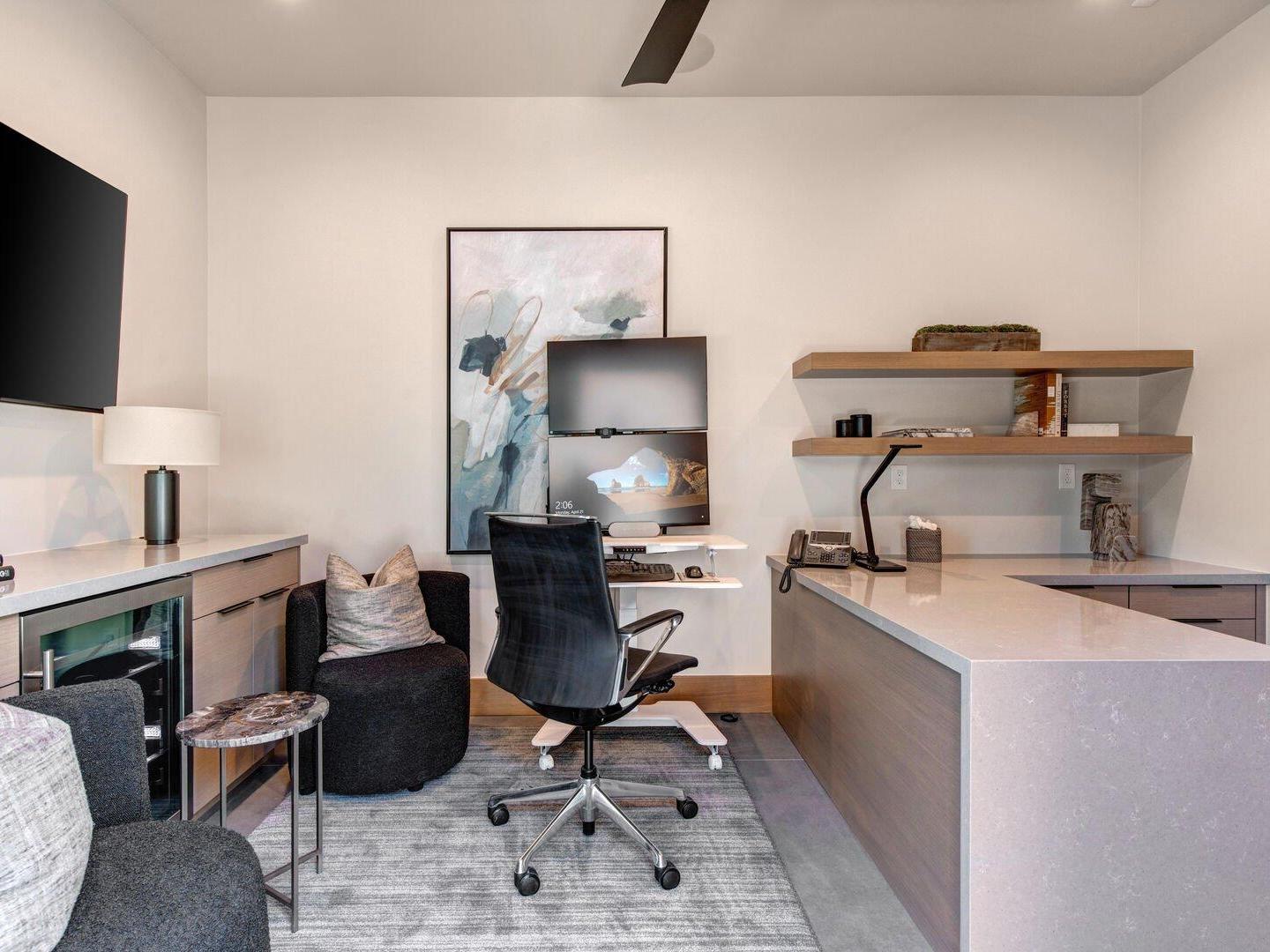 Head to the lowest level for movie night in the inviting theater room, where plush sofas are arranged in two levels before a large-screen television. After a day on the slopes, unwind in the rooftop hot tub, before heading out for a night on the town. Stay productive on vacation in the private rooftop office, fully equipped for those needing to fit in some work while enjoying the mountains.