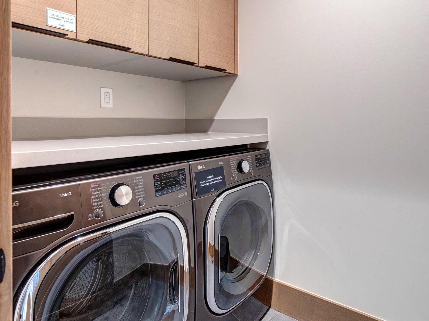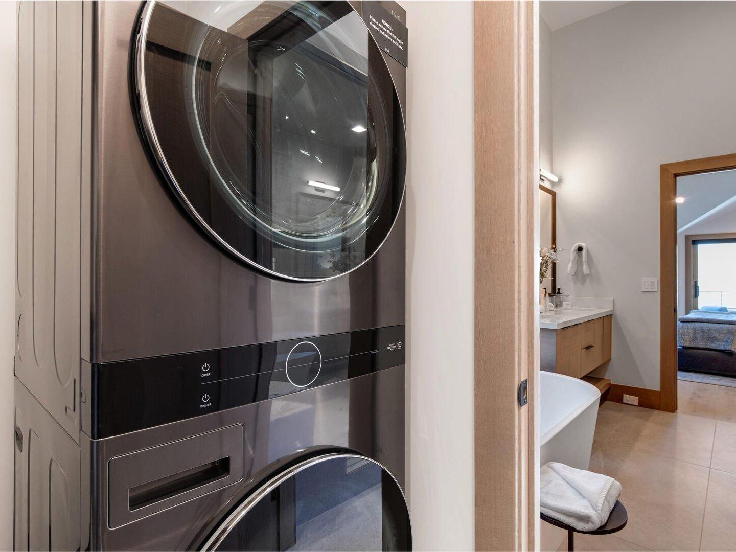 Perched on the uppermost level, the primary bedroom offers a King bed, a private laundry, a private rooftop deck, and an en-suite bathroom featuring a dual-sink vanity, soaking tub, and walk-in shower. The second bedroom on this level, also furnished with a King bed, enjoys direct access to the rooftop hot tub and utilizes a full bathroom in the hall.
