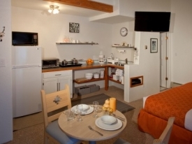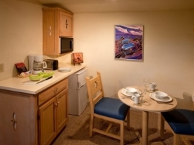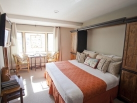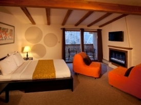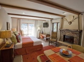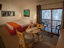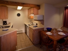 Powderhorn Suite- Can sleep up to four guests in 400 square feet with a king or two twin beds and a sleeper sofa. Includes a full kitchenette (stove, oven, dishwasher, mini-fridge, microwave, coffee maker, and toaster) along with a telephone, satellite television and wireless internet). Also boasts a fireplace, dining table and balcony.